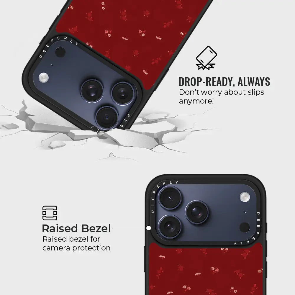 Graceful and timeless, Cherry Blossom brings a touch of floral elegance to your everyday phone case. Set against a deep cherry-red background, delicate blossom motifs create a refined, romantic look that feels both classic and modern.