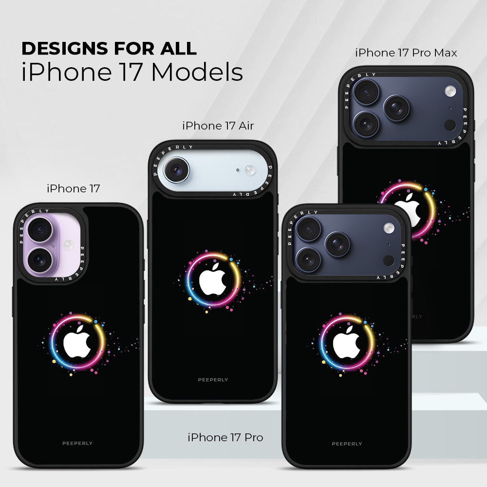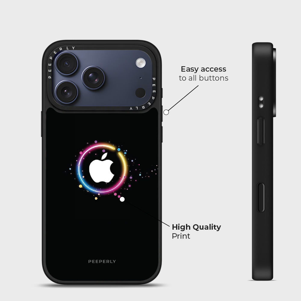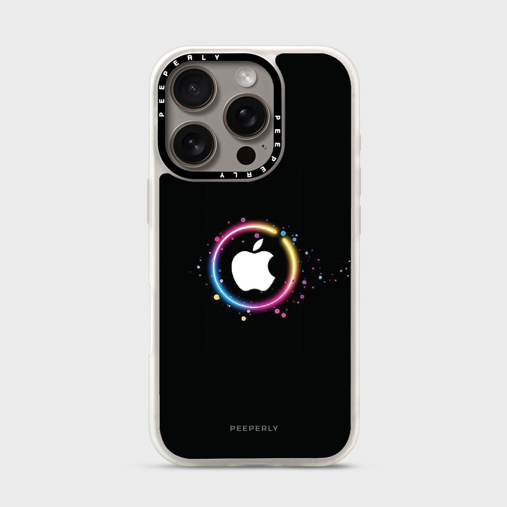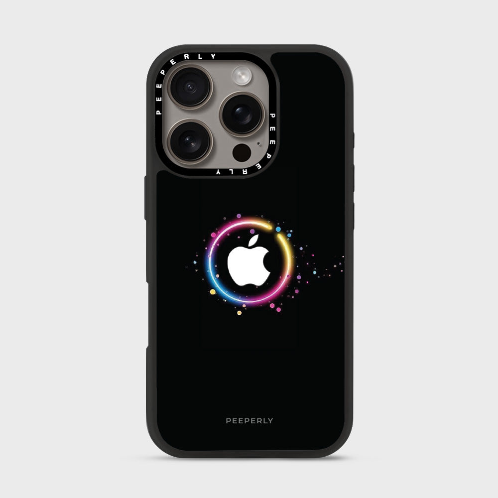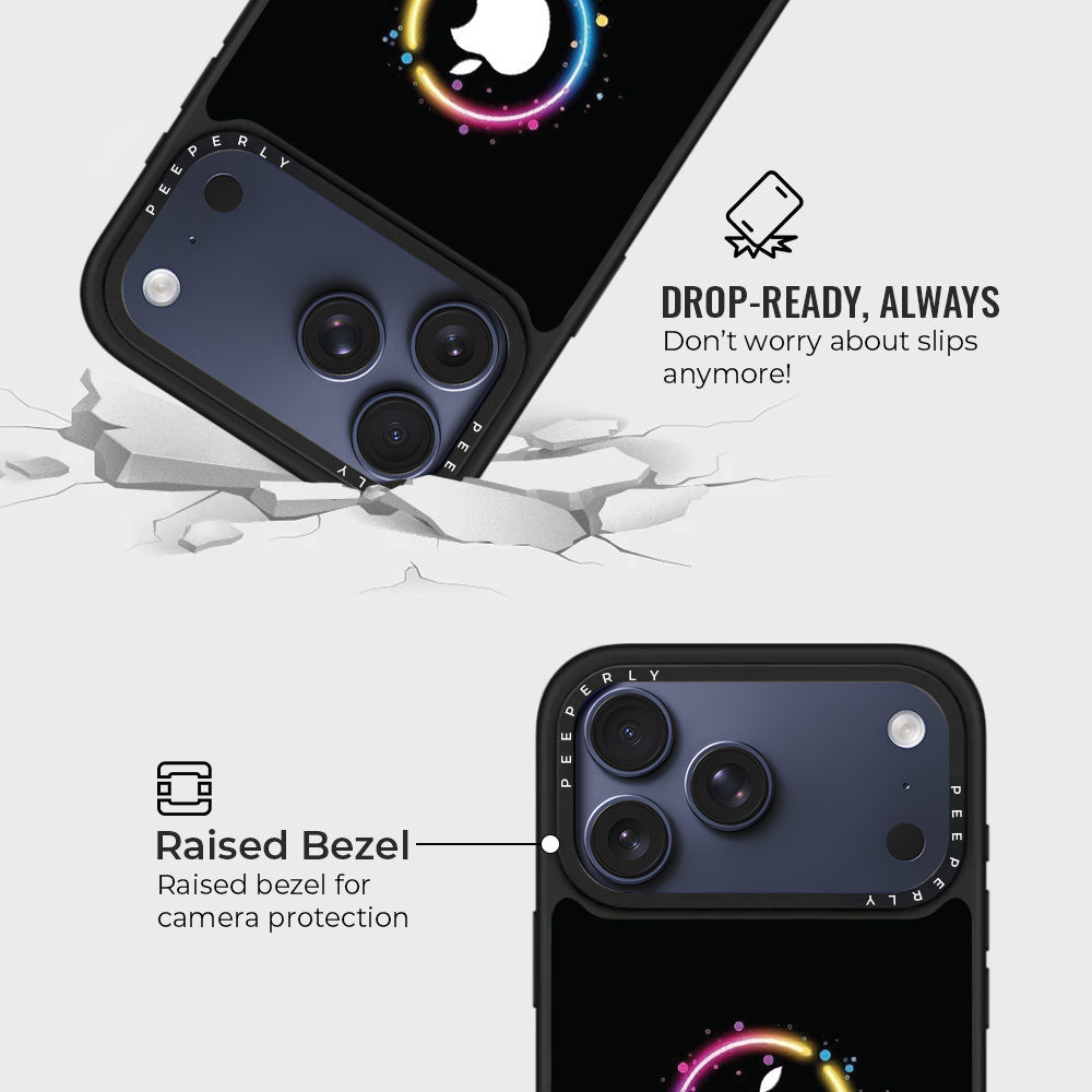 The Aurora Ring case captures the mesmerizing glow of the northern lights in a sleek, modern design. A radiant halo of color gracefully surrounds the Apple logo, blending vibrant hues of pink, blue, yellow, and violet against a deep black canvas — symbolizing harmony between energy and sophistication.