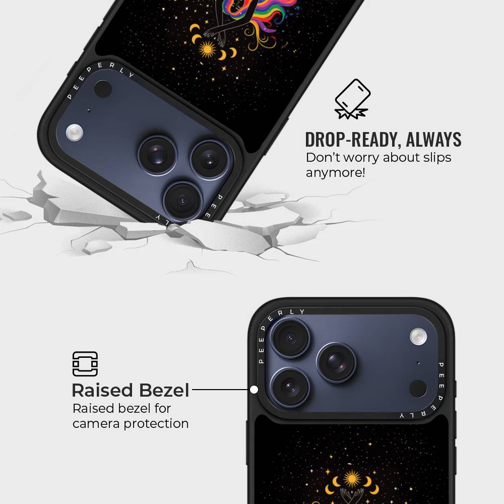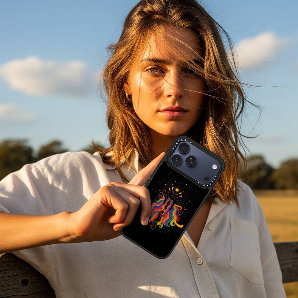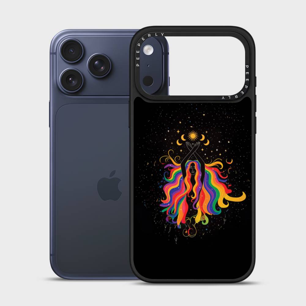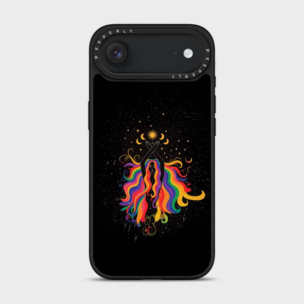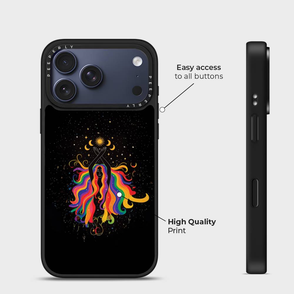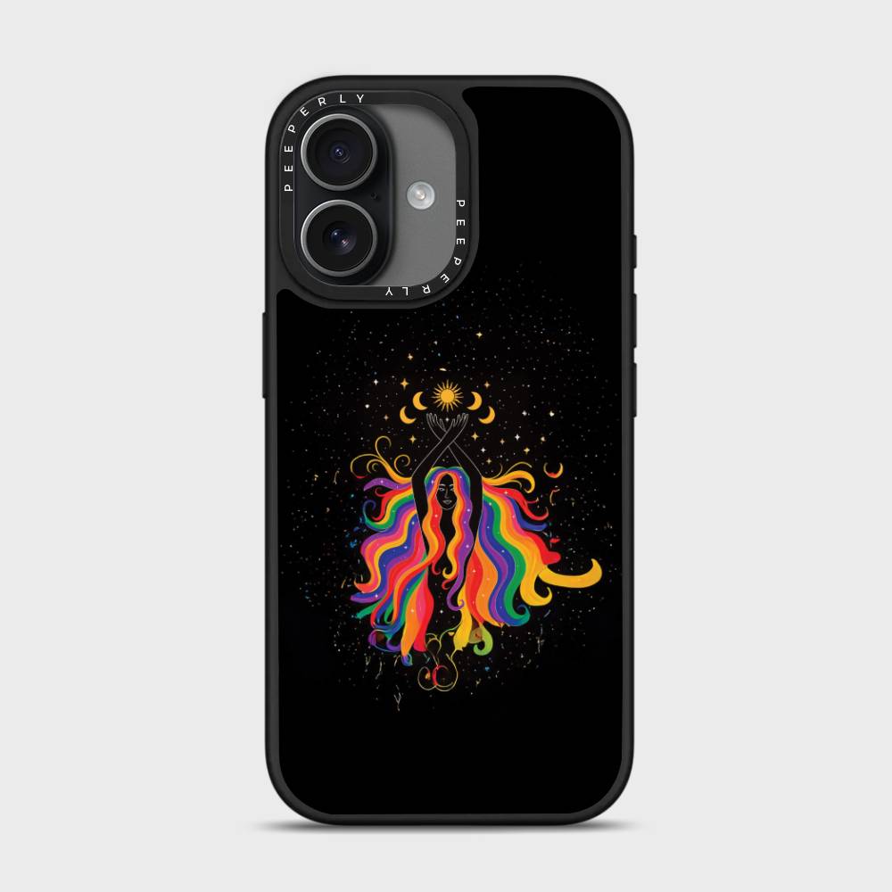 Dare to channel your cosmic power with the Rainbow Witch phone case — a vibrant celebration of color, energy, and inner strength. Set against a star-filled black night sky, the design features a radiant celestial figure with flowing rainbow hair, reaching upward toward the phases of the moon and a glowing sun.