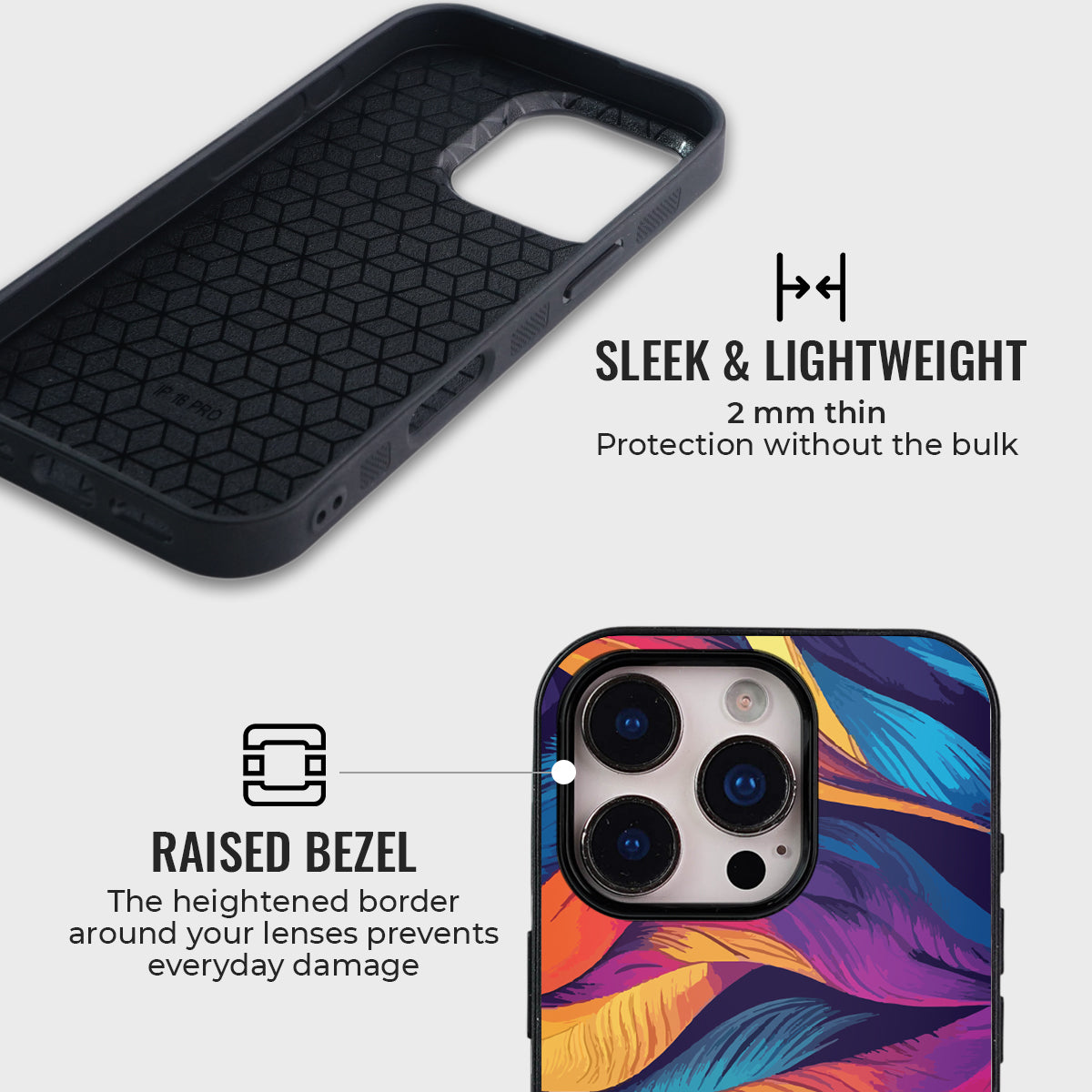 Unleash your creative energy with the Bold Feather case — a striking blend of feather-inspired flow and vivid color expression. This case features sweeping strokes of rich blues, fiery oranges, radiant purples, and deep reds, all layered into an abstract feather pattern that radiates movement and confidence.