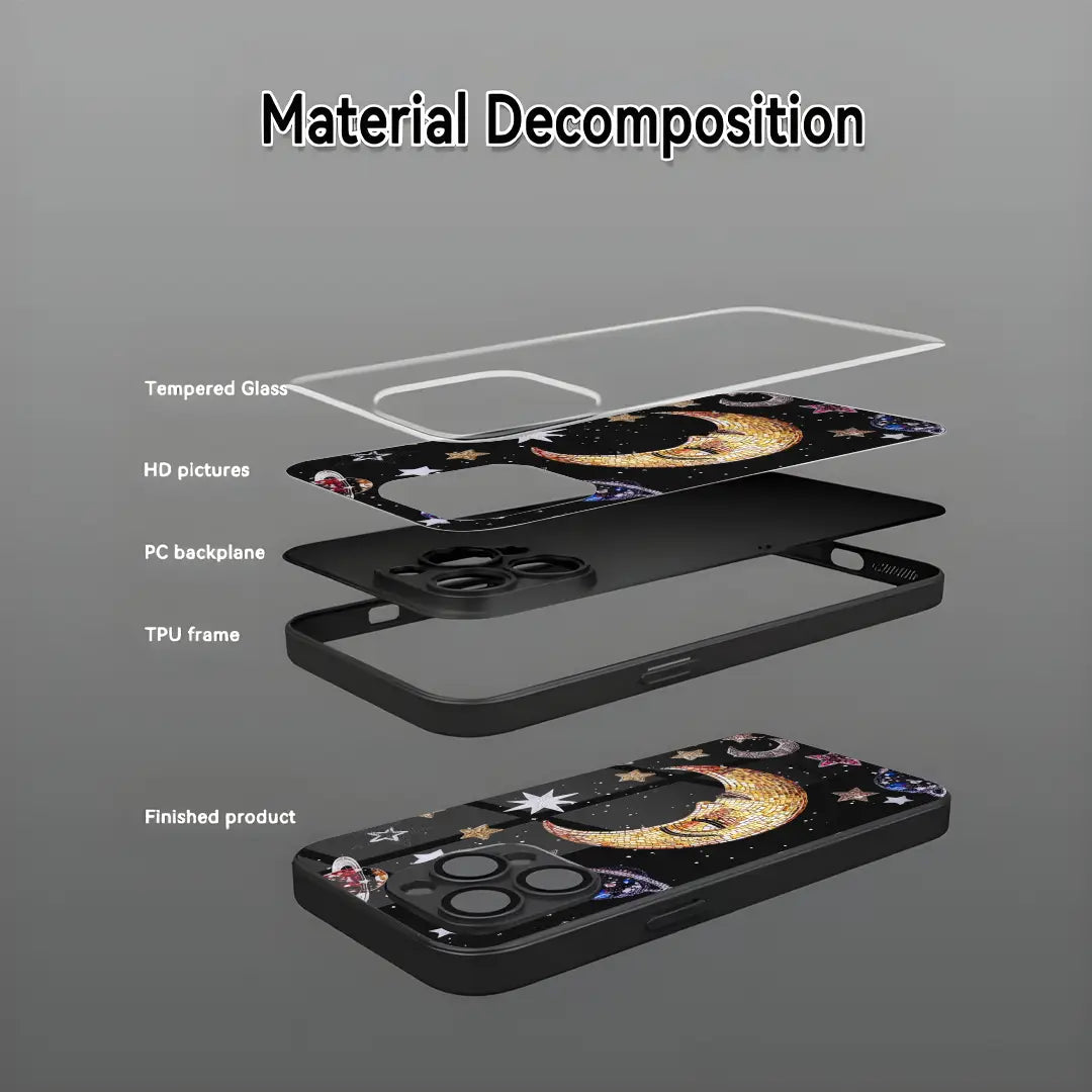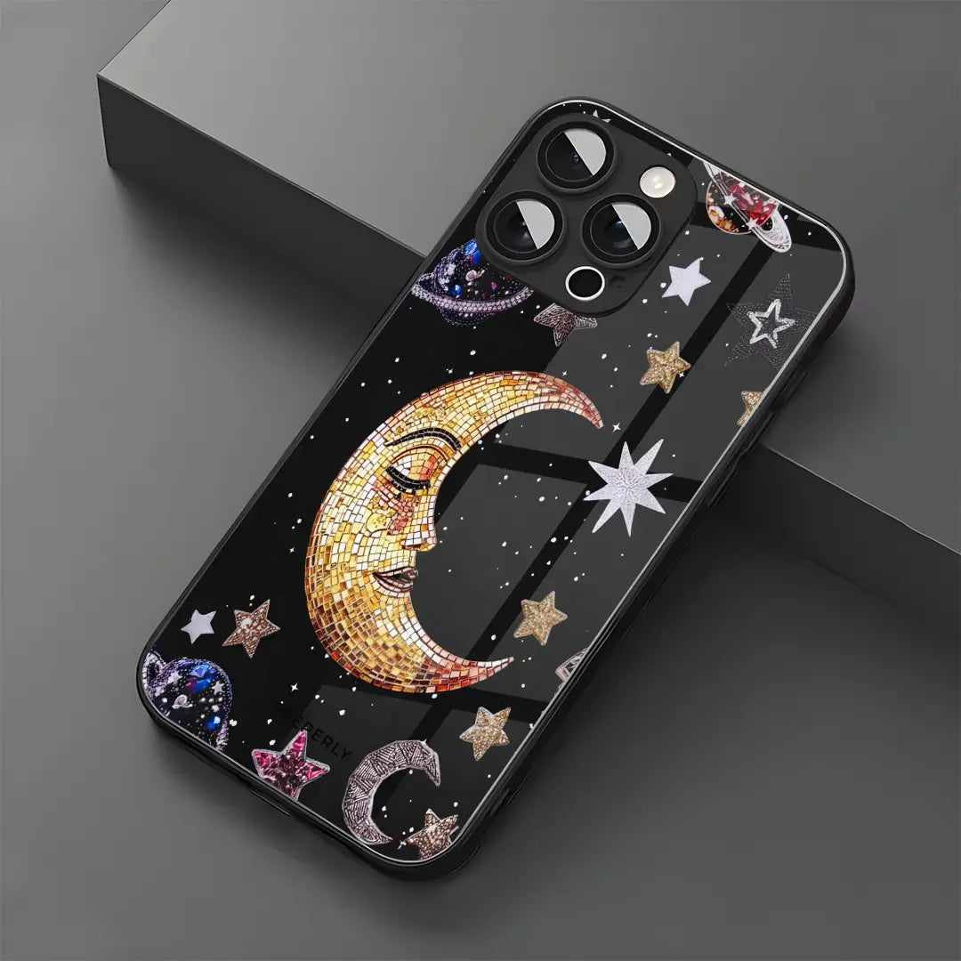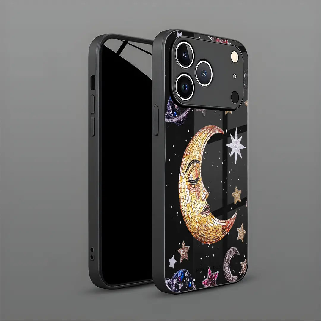 Moon Mosaic is a captivating phone case design featuring a radiant golden crescent moon crafted in a mosaic style, surrounded by shimmering stars and celestial accents against a deep black sky. Rich in texture and cosmic charm, it evokes mystery, magic, and timeless beauty.