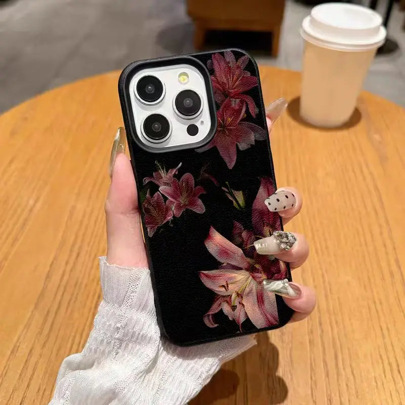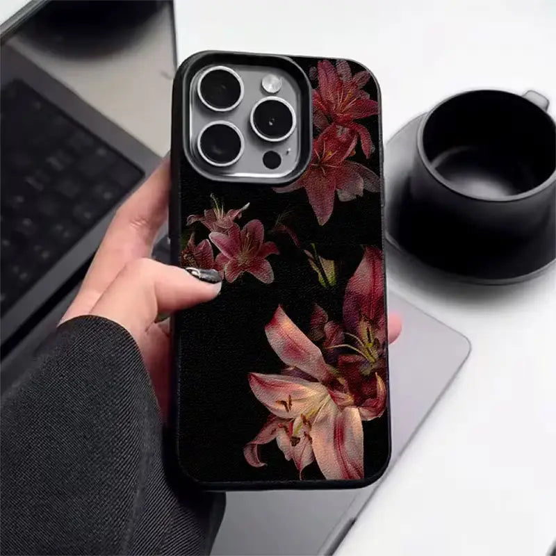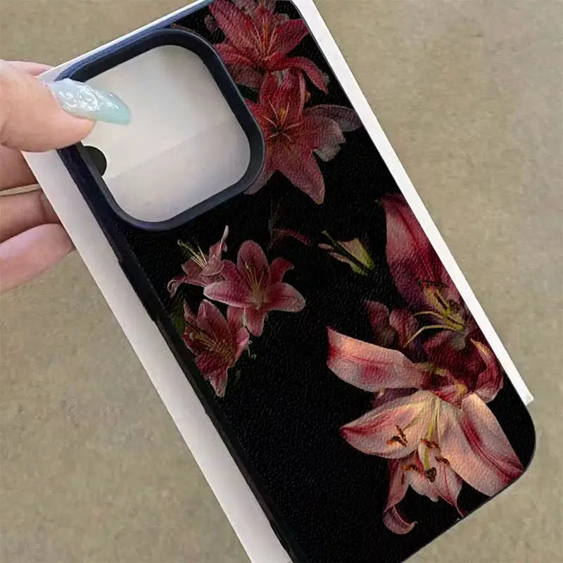 Nocturne Lily Noir is a statement of quiet luxury and moody elegance. Set against a deep black canvas, rich crimson lilies bloom with dramatic intensity, creating a timeless floral aesthetic inspired by midnight gardens.