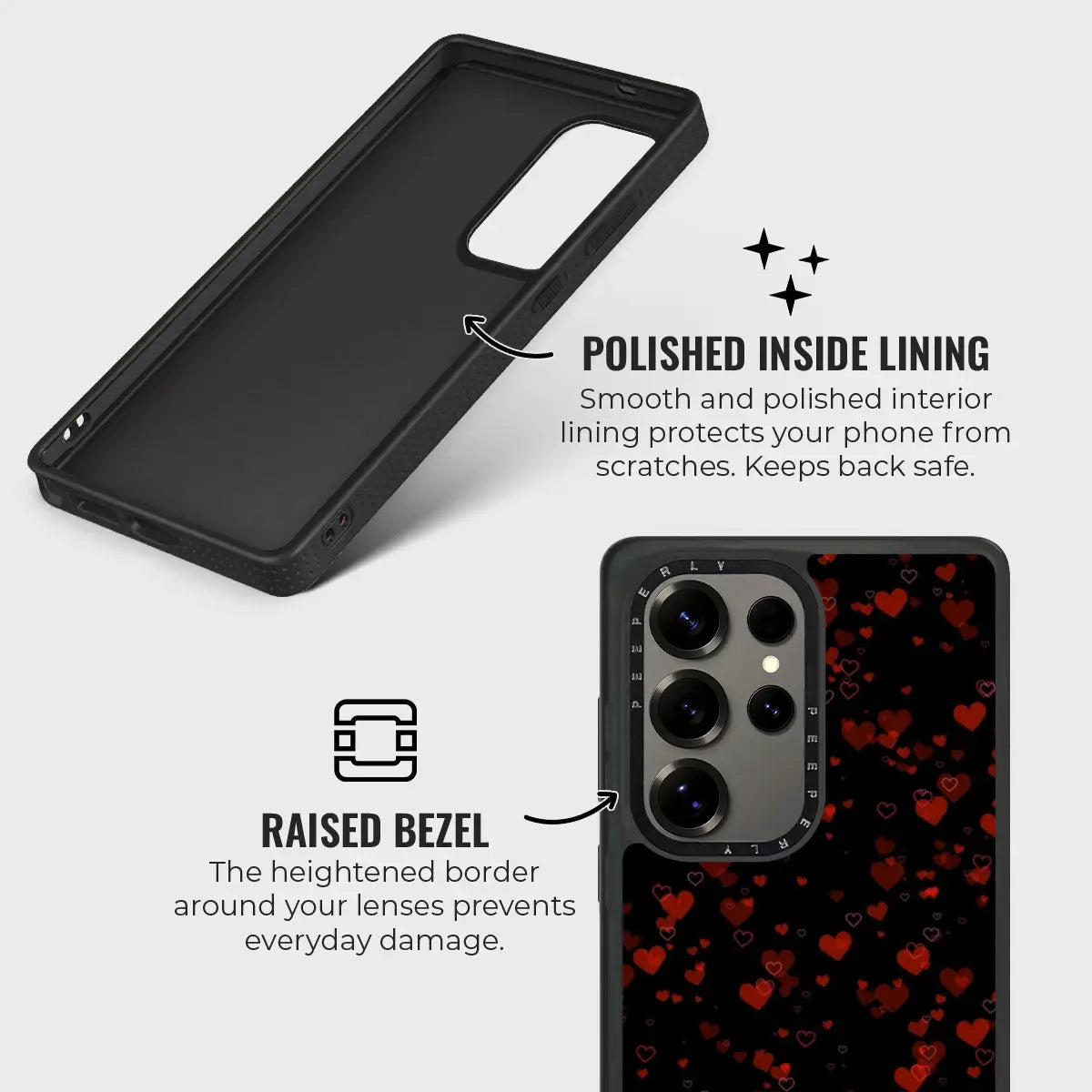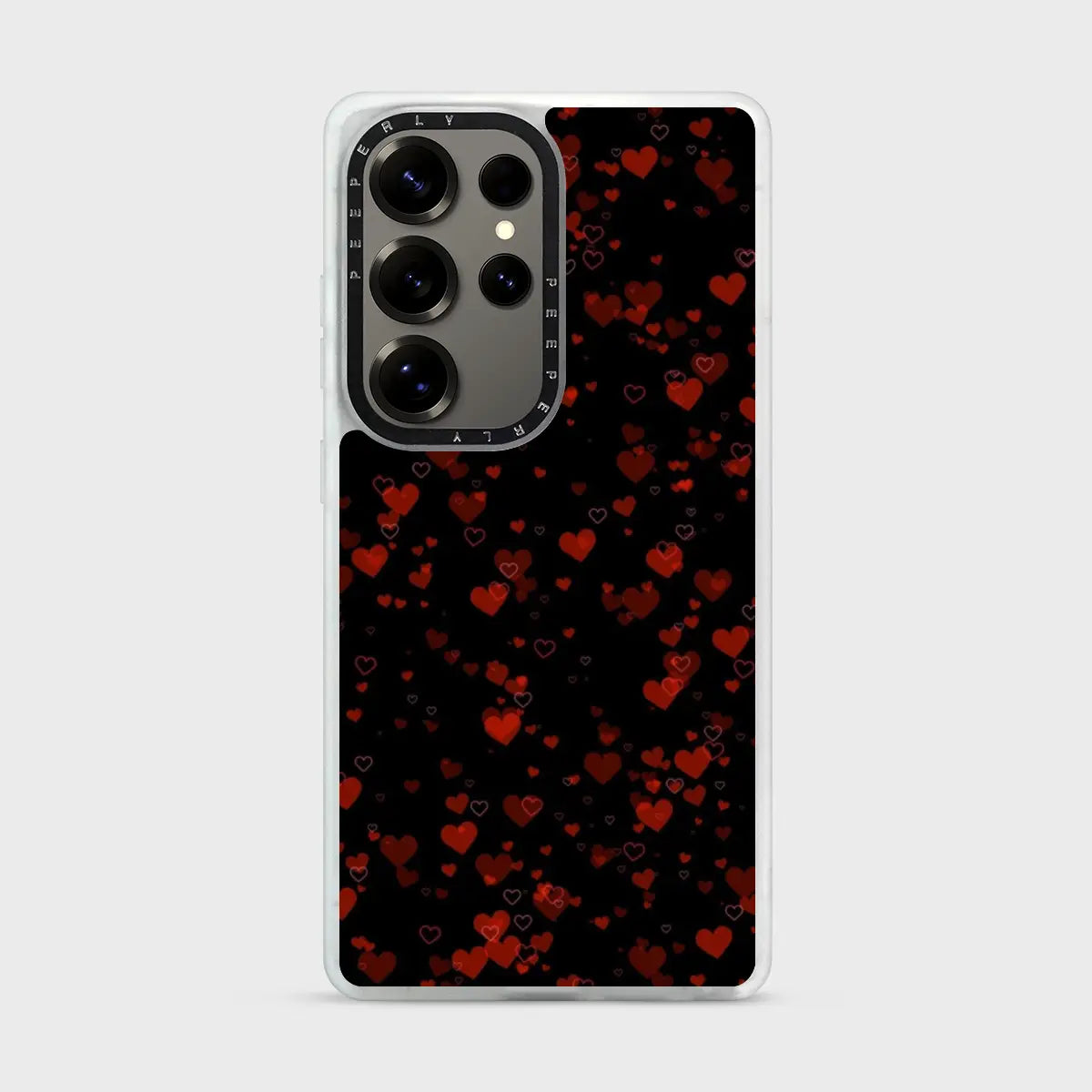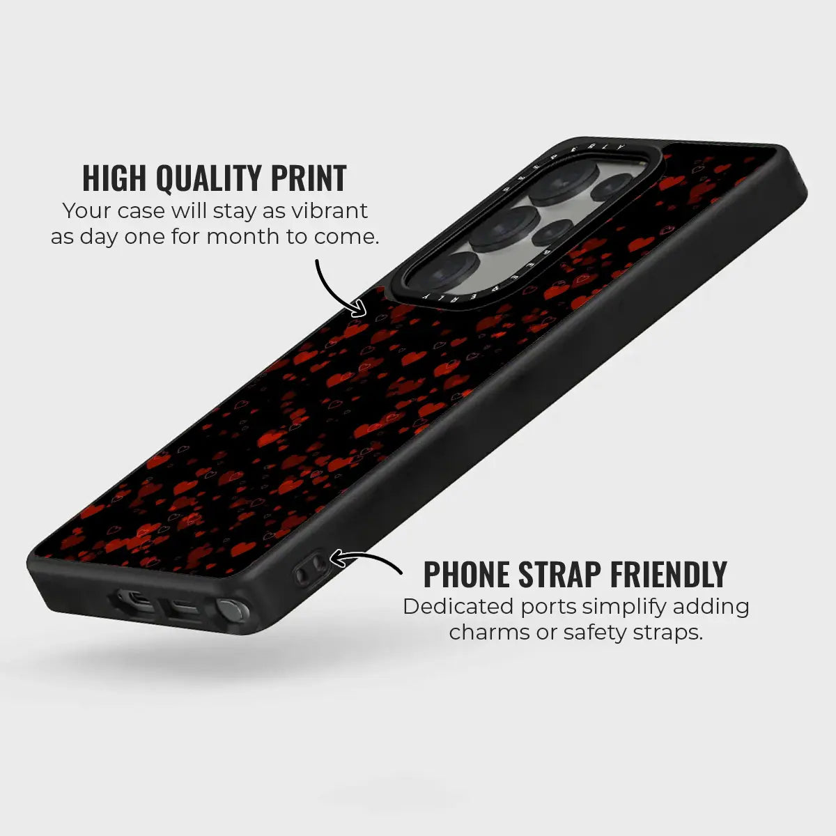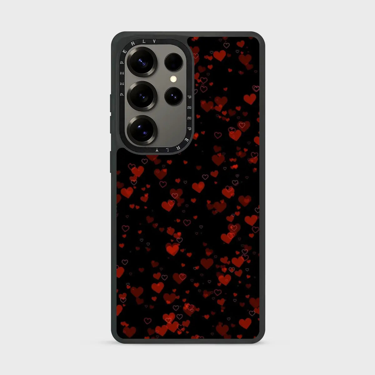 Ember Hearts is a bold, romantic phone case featuring glowing red hearts scattered across a deep black background. The contrast creates a dramatic, smoldering effect—like embers flickering in the dark.