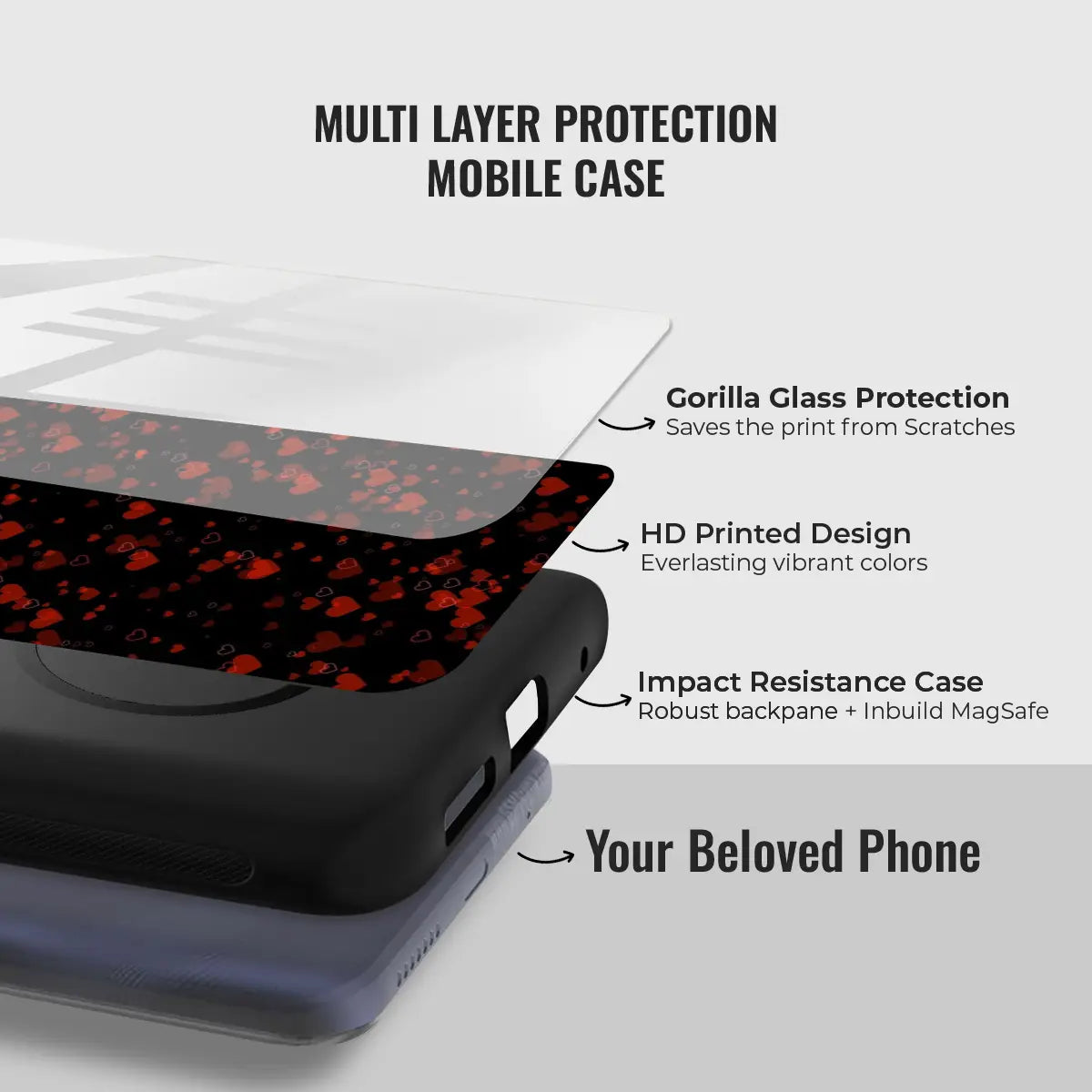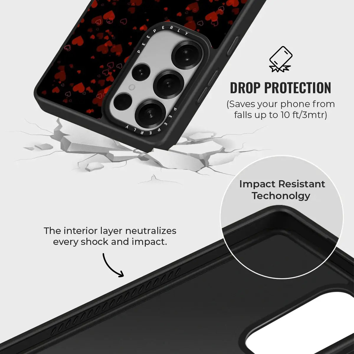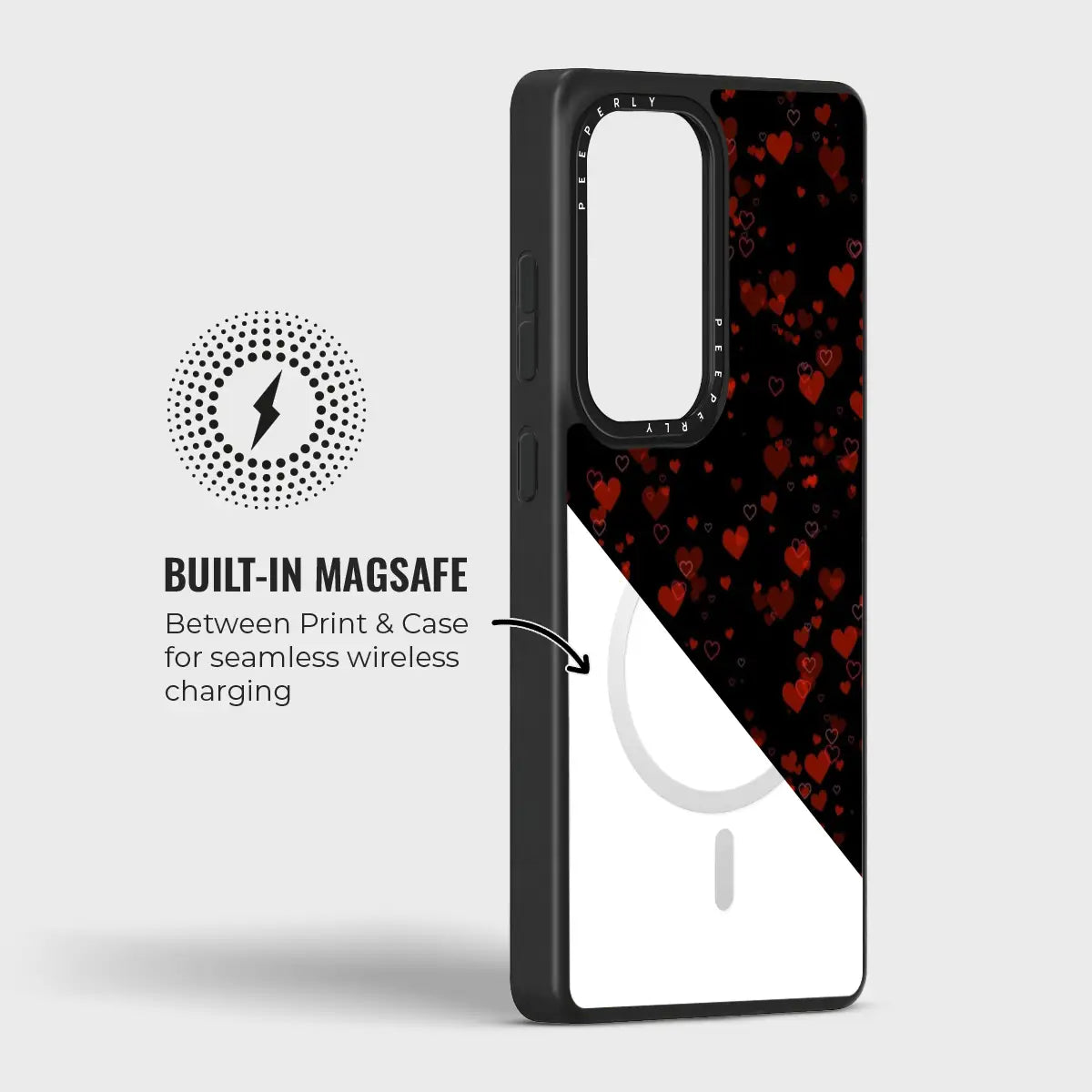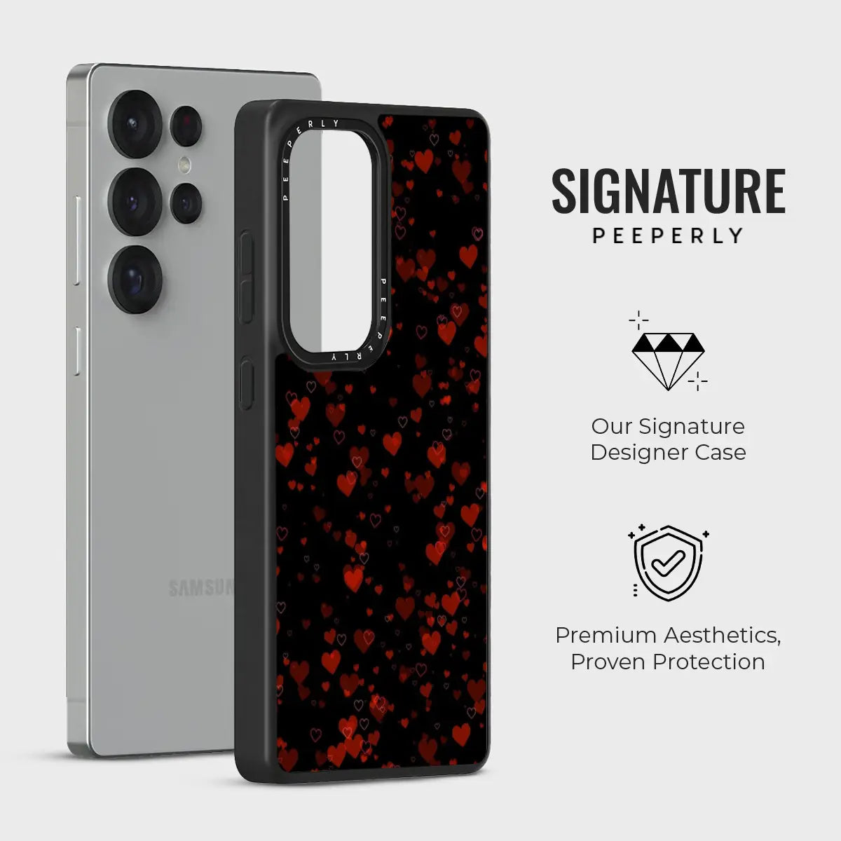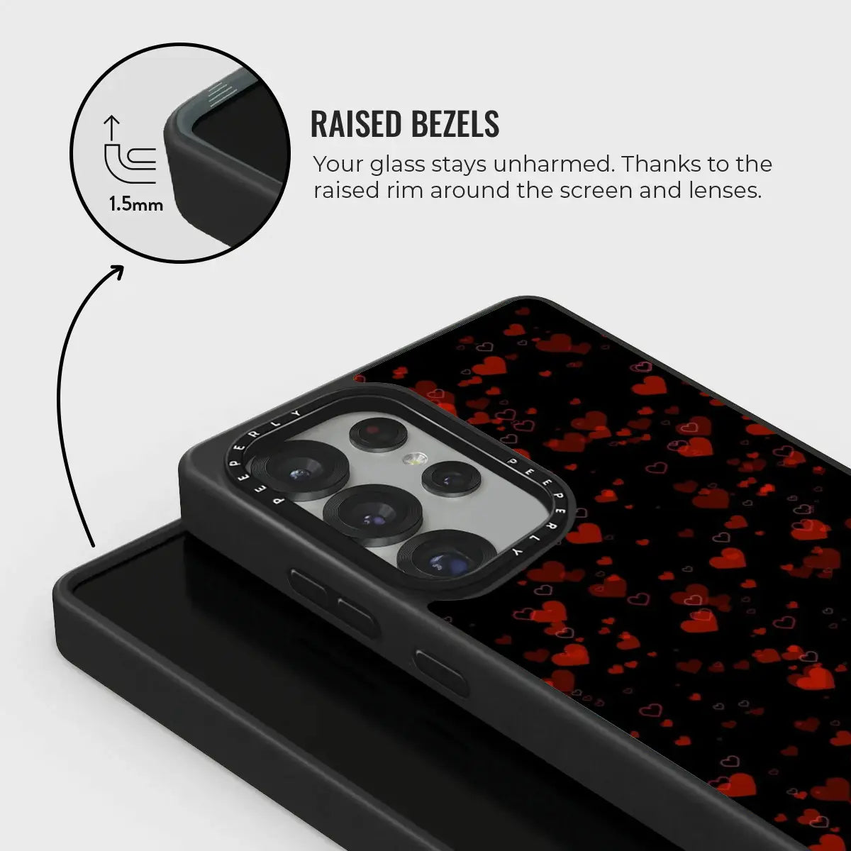 Ember Hearts is a bold, romantic phone case featuring glowing red hearts scattered across a deep black background. The contrast creates a dramatic, smoldering effect—like embers flickering in the dark.