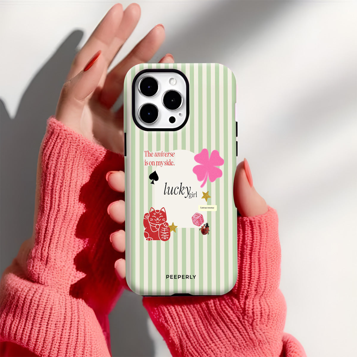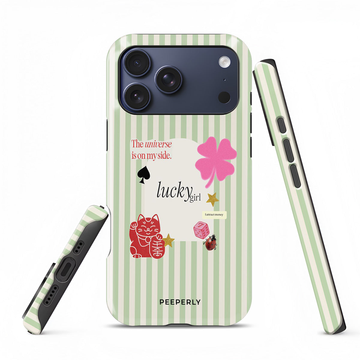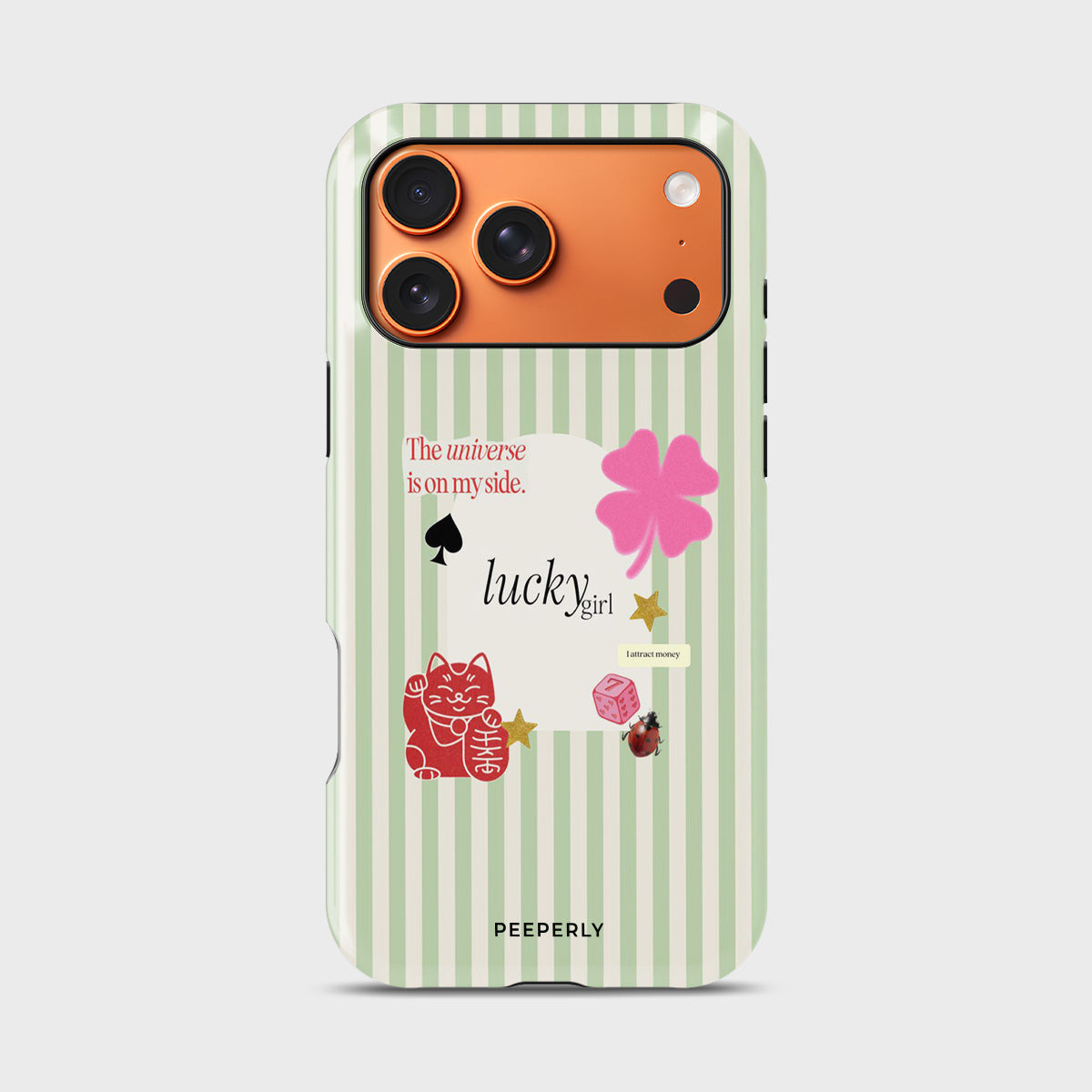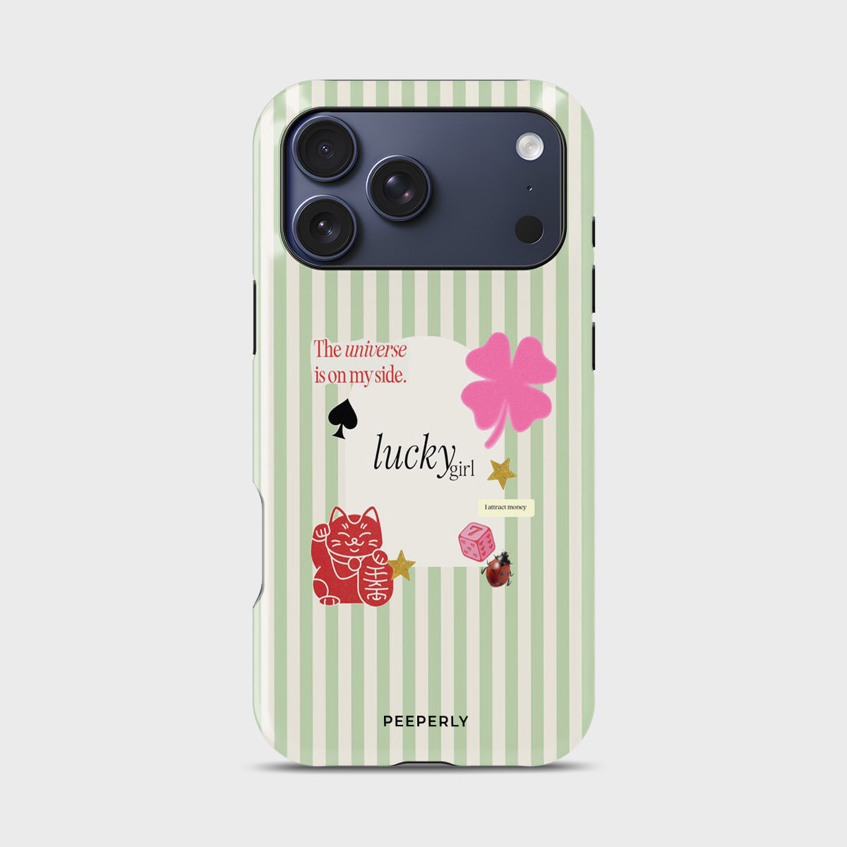 A charming blend of soft stripes and playful symbols that celebrate everyday luck. From clovers to lucky icons, this design is all about small joys, positive signs, and feel-good moments—perfect for carrying a little fortune with you wherever you go.