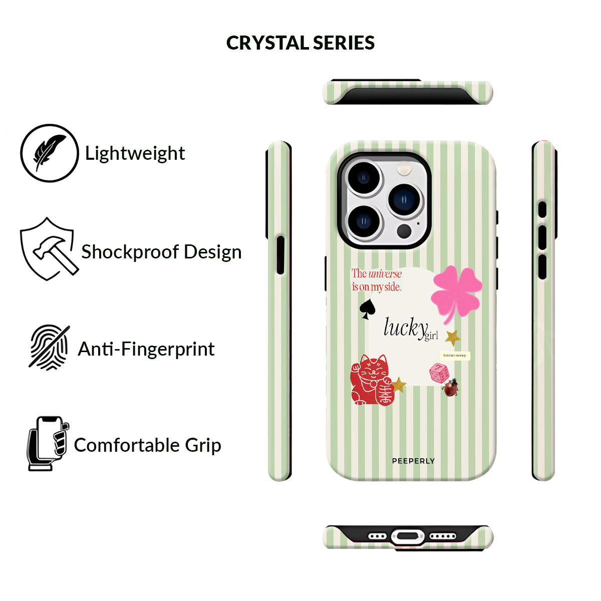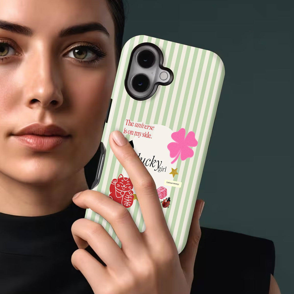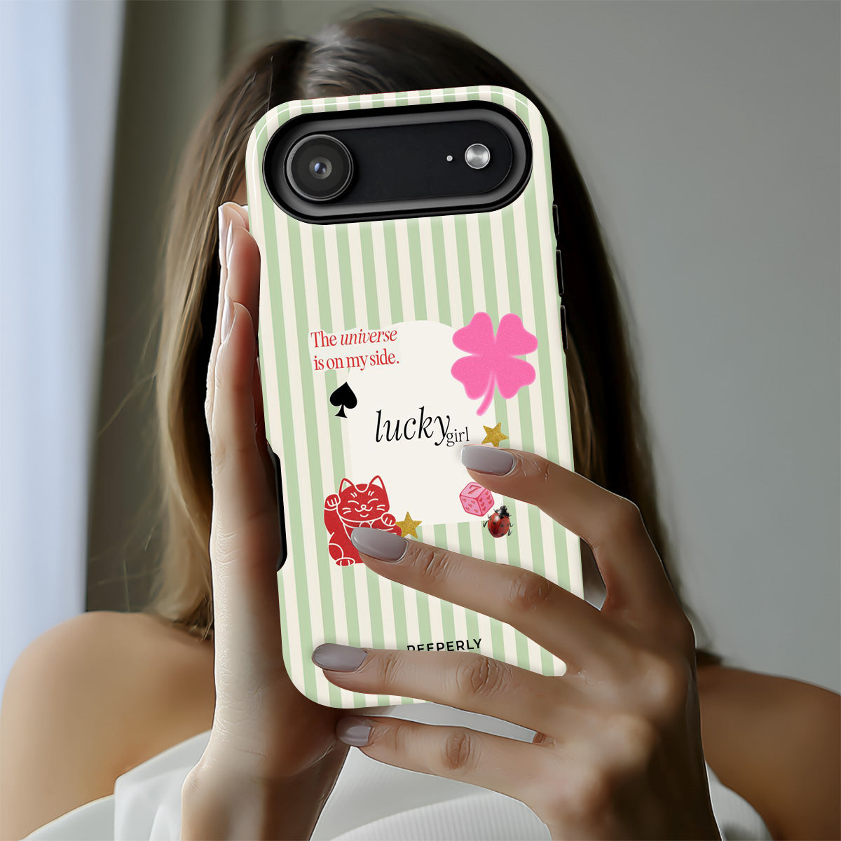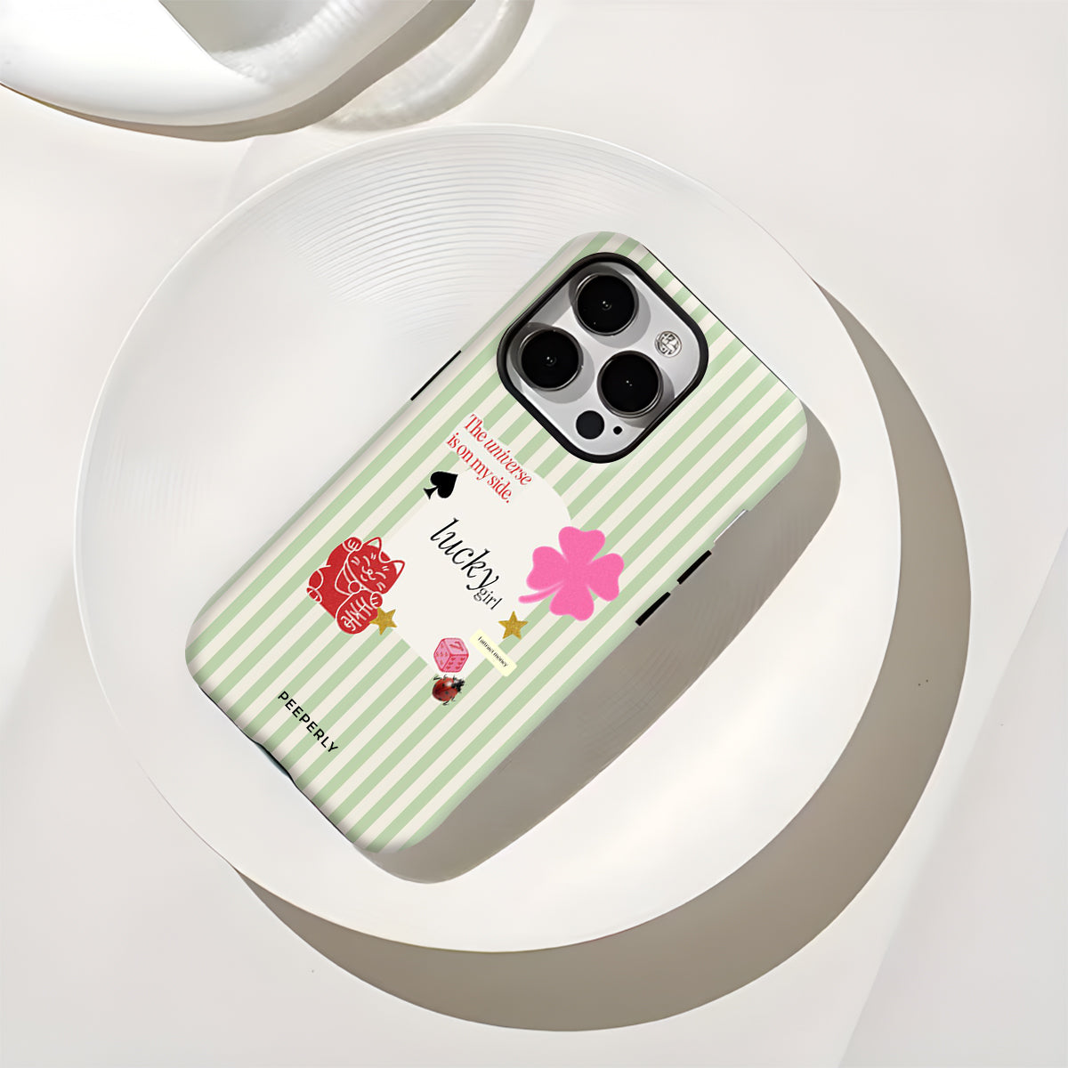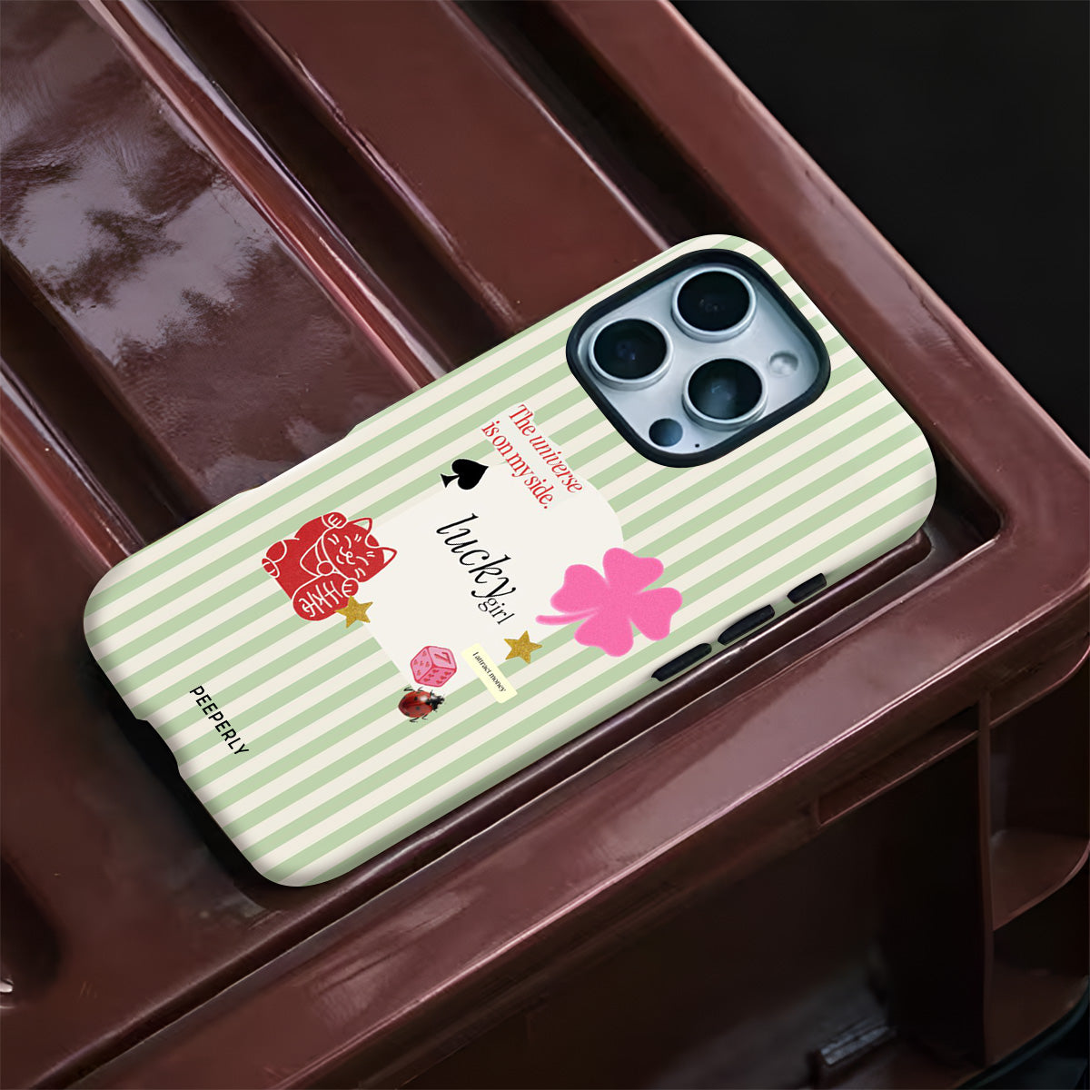A charming blend of soft stripes and playful symbols that celebrate everyday luck. From clovers to lucky icons, this design is all about small joys, positive signs, and feel-good moments—perfect for carrying a little fortune with you wherever you go.