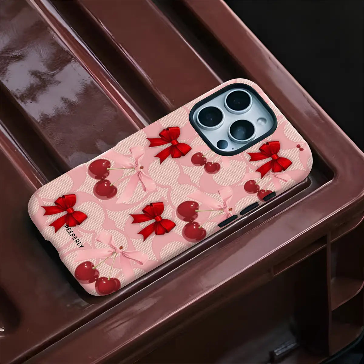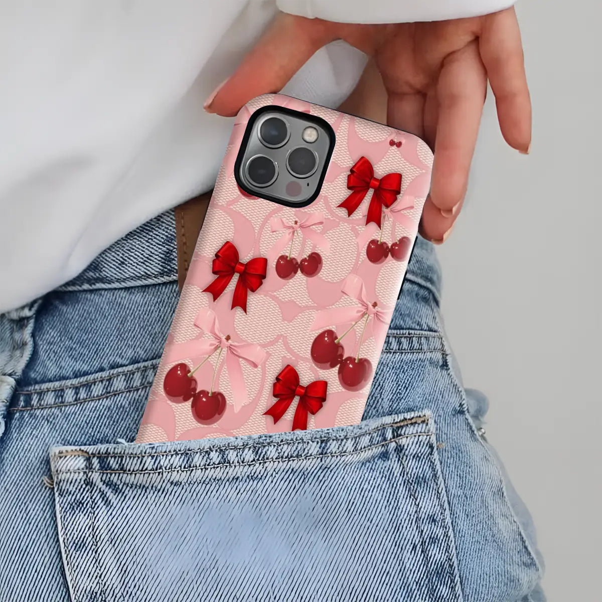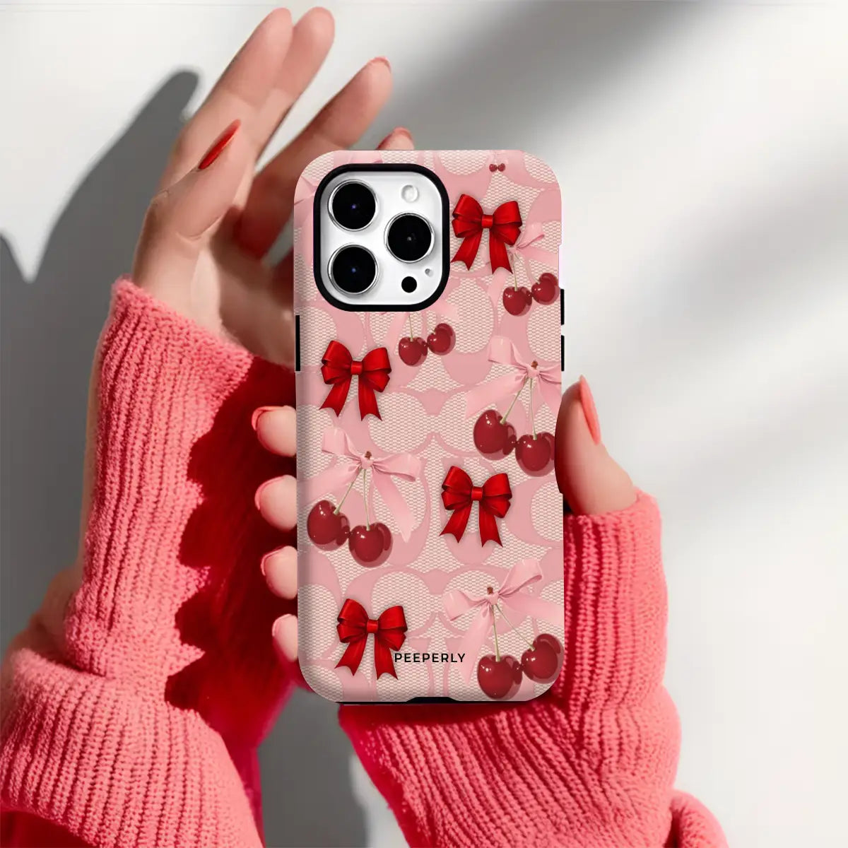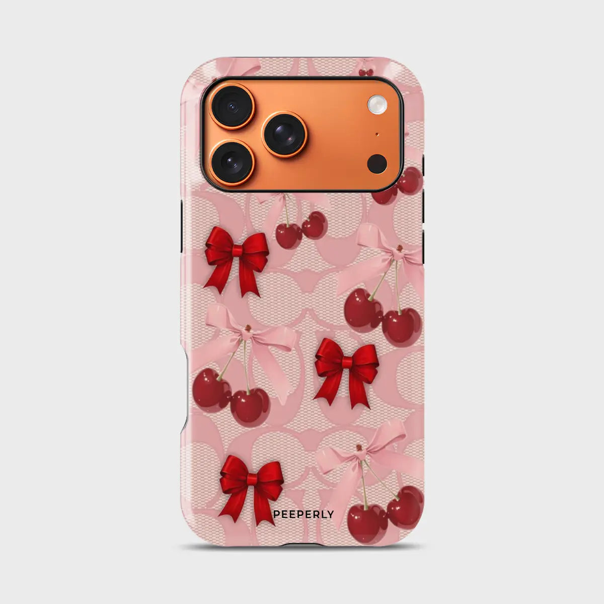 A dreamy pink blend of glossy cherries and dainty ribbon bows, sprinkled with soft romantic charm. This design feels sweet, playful, and effortlessly elegant—like a candy-coated love note wrapped in satin.