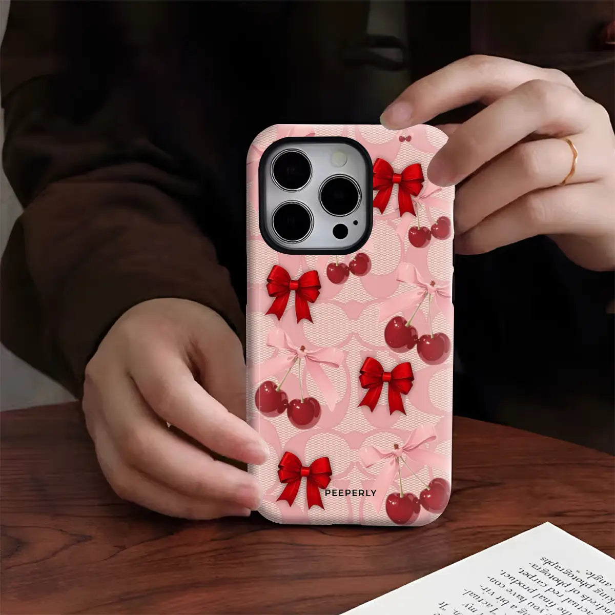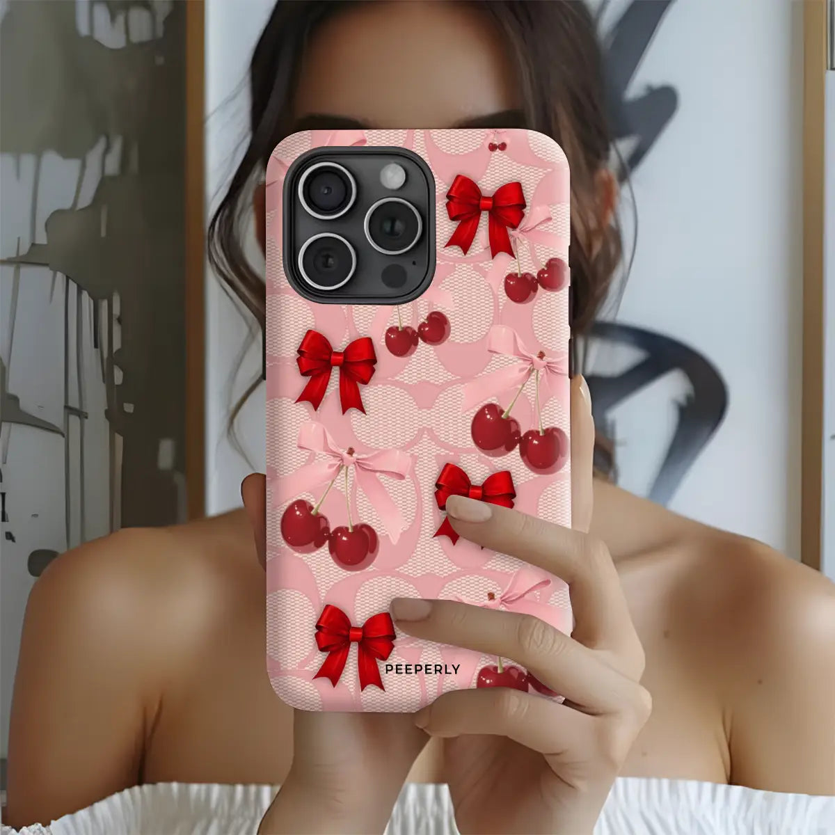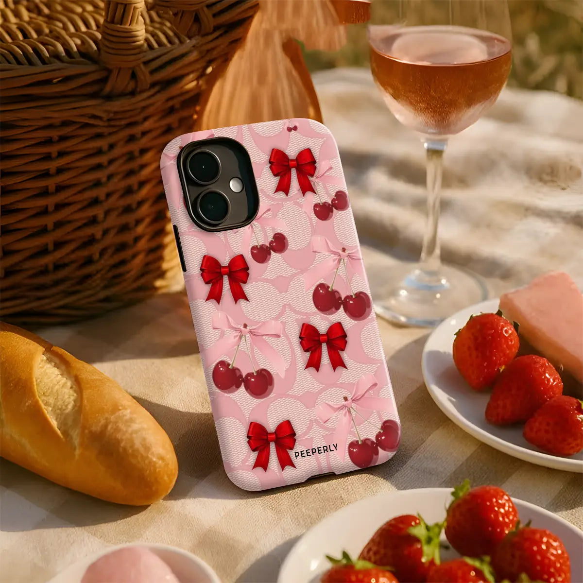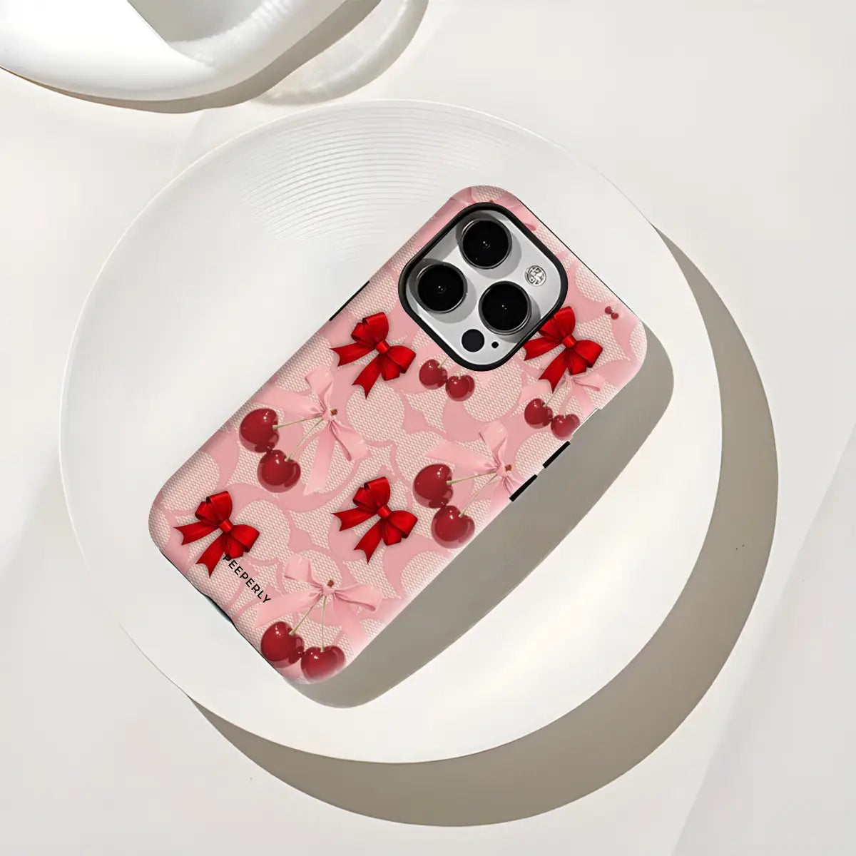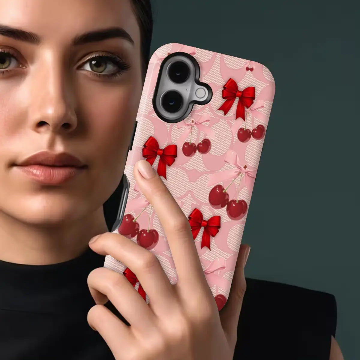 A dreamy pink blend of glossy cherries and dainty ribbon bows, sprinkled with soft romantic charm. This design feels sweet, playful, and effortlessly elegant—like a candy-coated love note wrapped in satin.