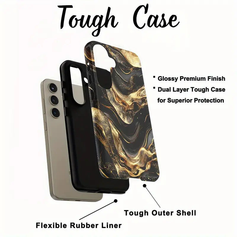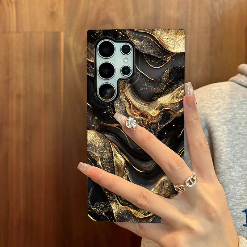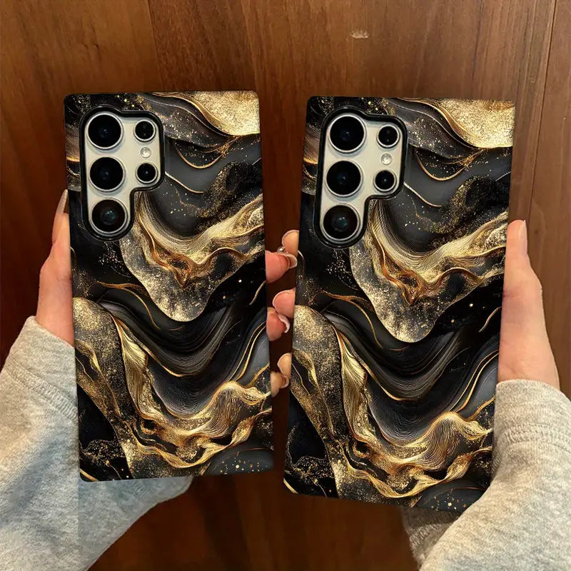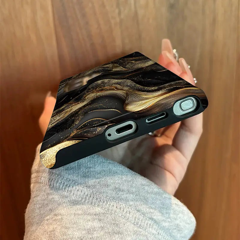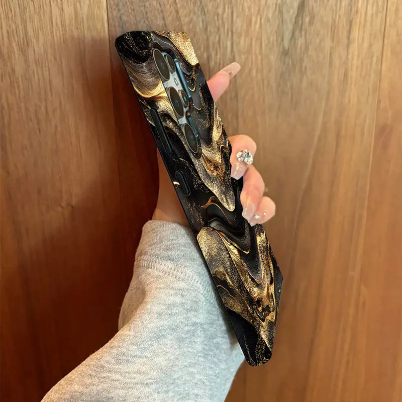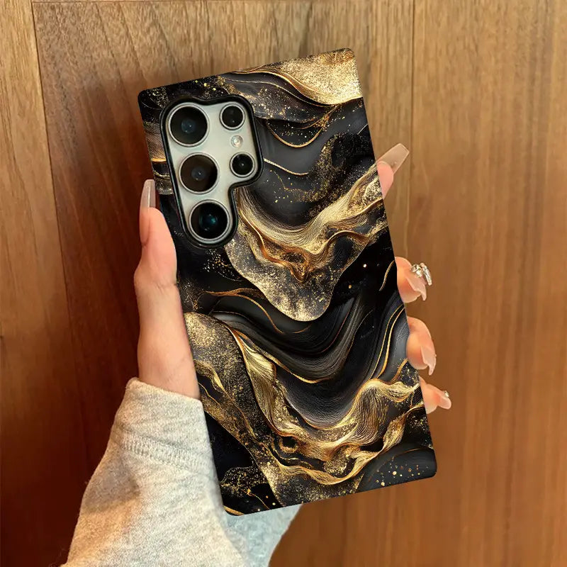 Unveil the essence of luxury with the Gilded Waves Case, where elegance meets artistry. The design features fluid golden swirls flowing over a deep black canvas, resembling waves of molten gold captured in motion.