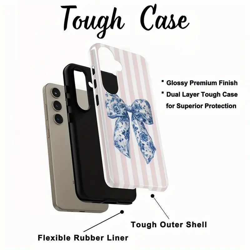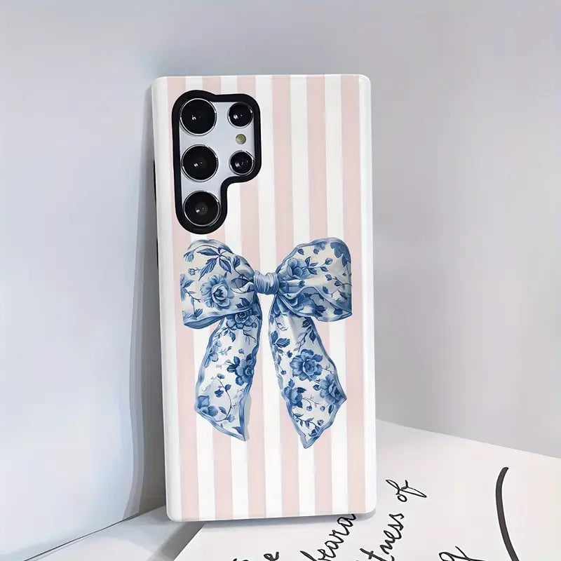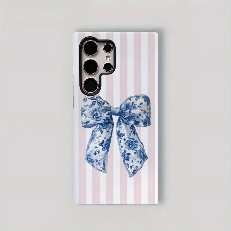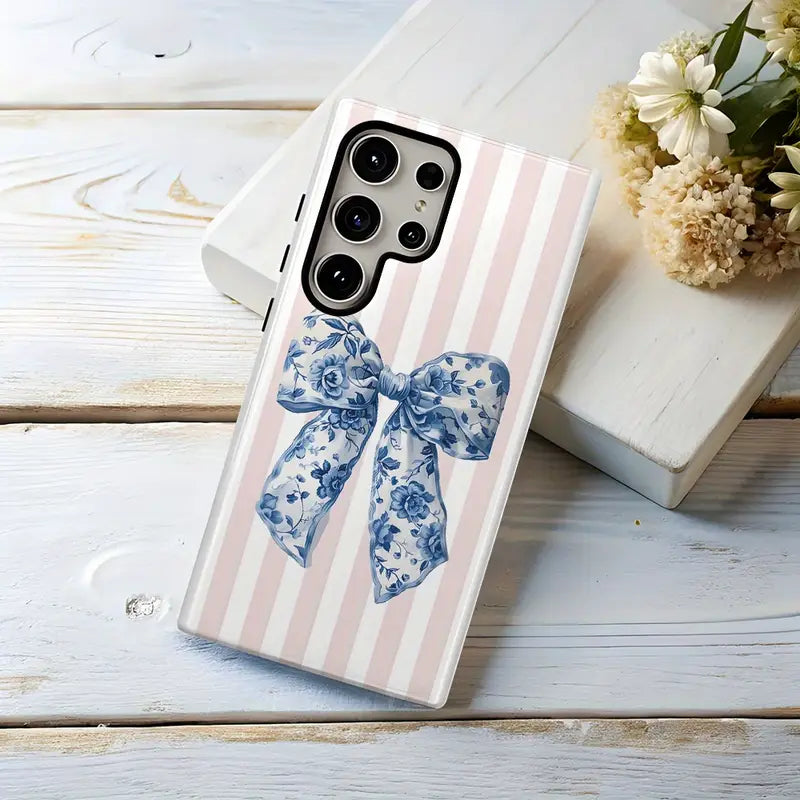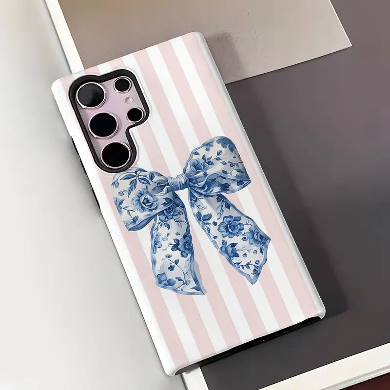 Timeless elegance meets delicate artistry with the Porcelain Bloom Case. Inspired by the classic beauty of fine porcelain, this design features a graceful blue floral bow set against soft pastel stripes - a perfect harmony of sophistication and charm.