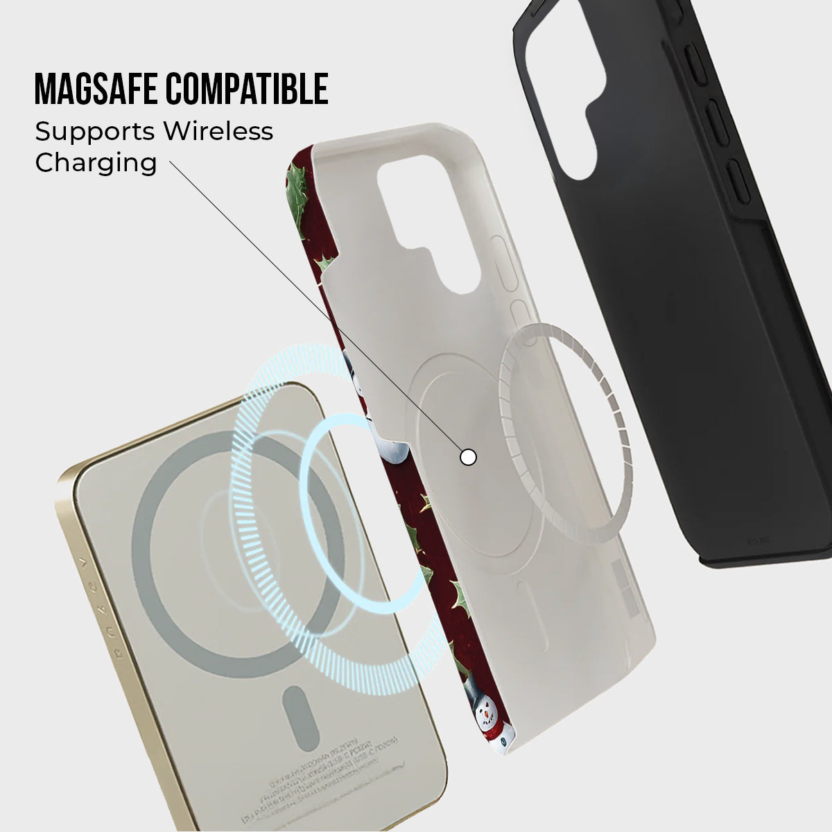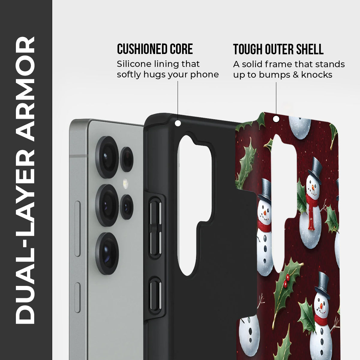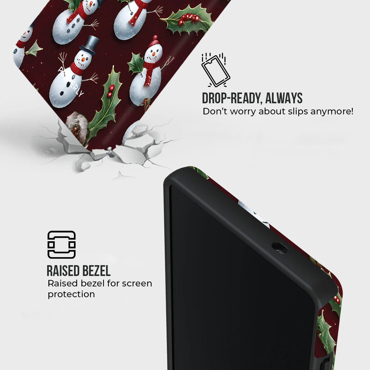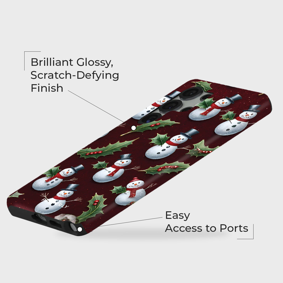 Wrap your phone in the magic of winter with Snowman Delight — a charming case that captures the joy and coziness of the holiday season. Adorned with cheerful snowmen, festive holly leaves, and a deep crimson background, this case brings warmth and wonder to every glance.