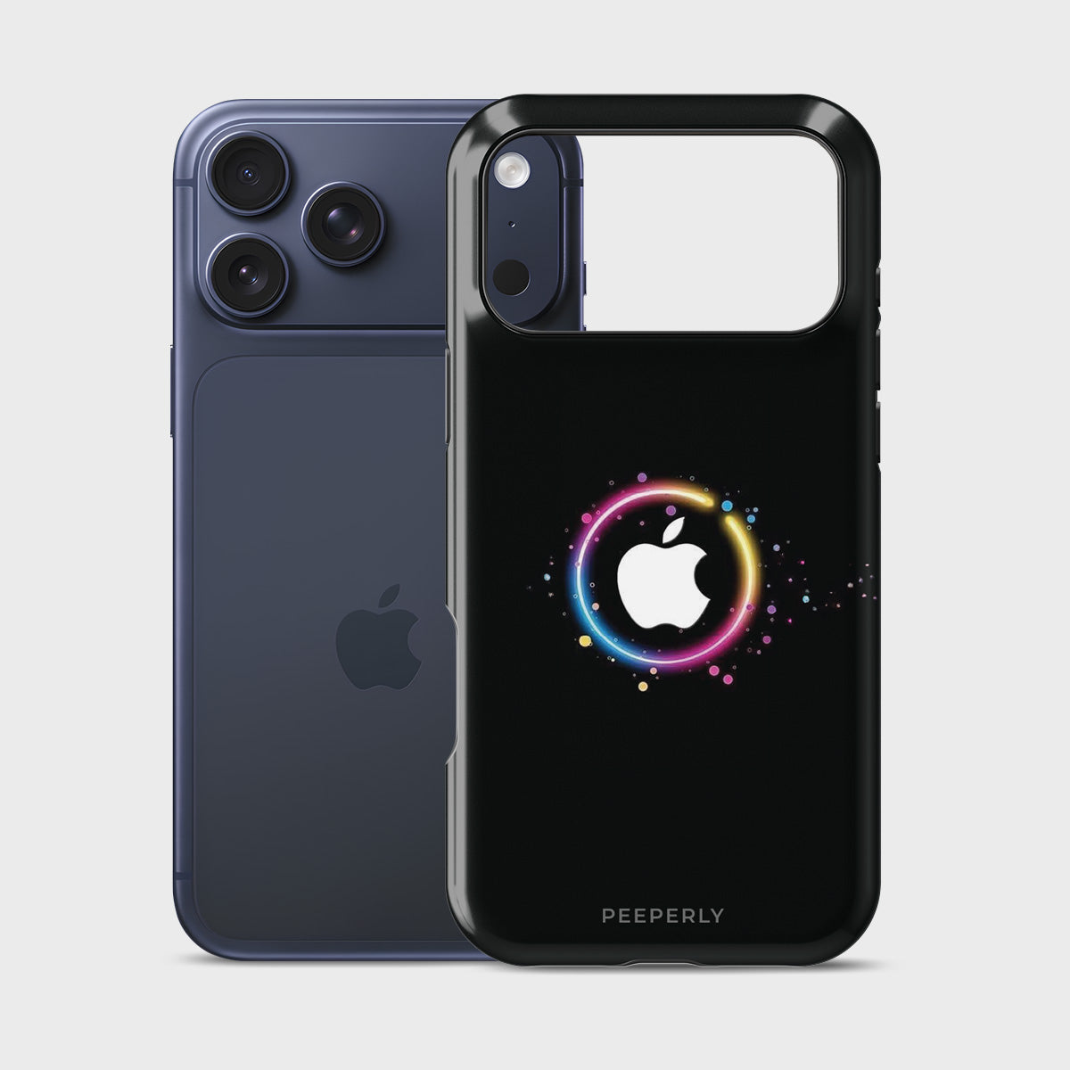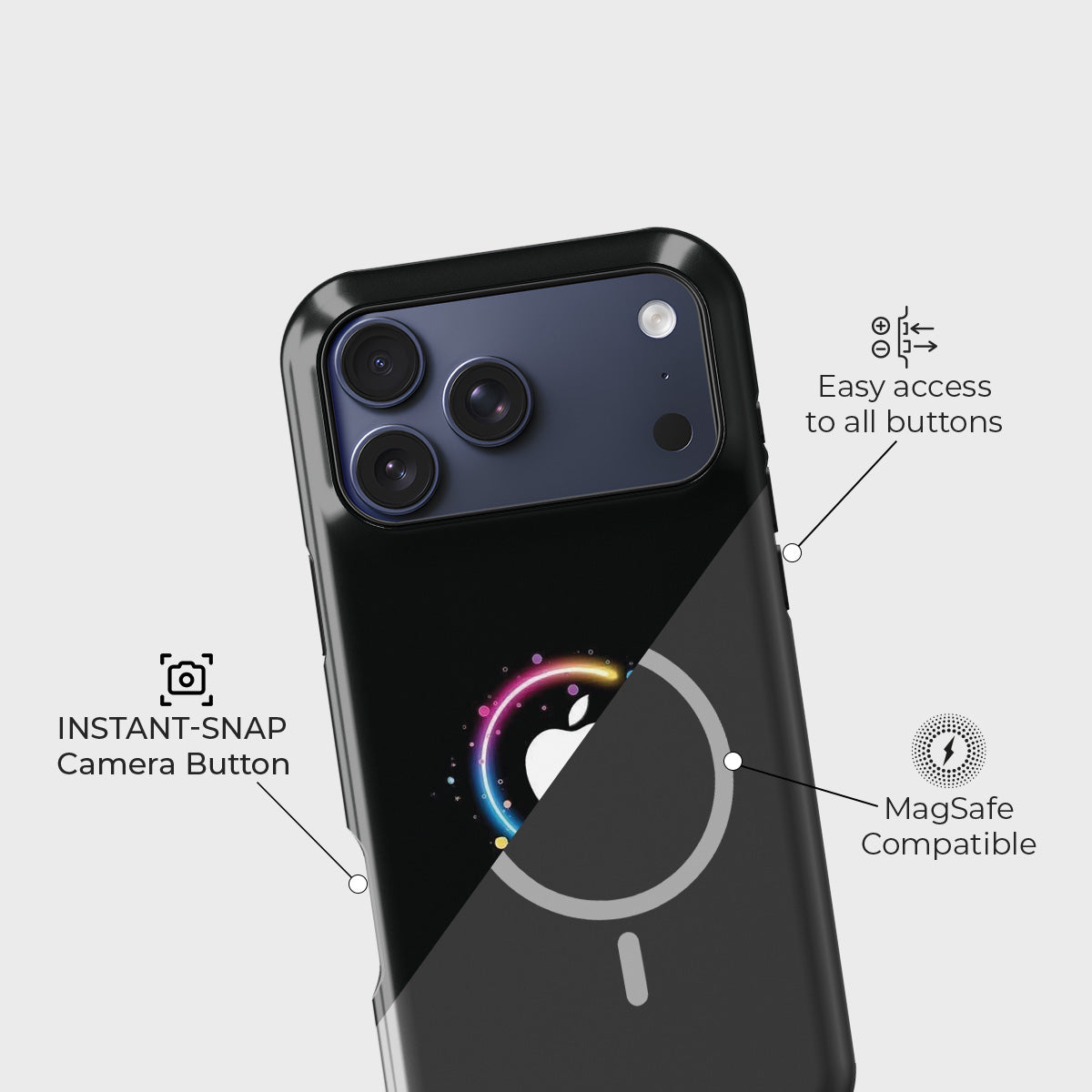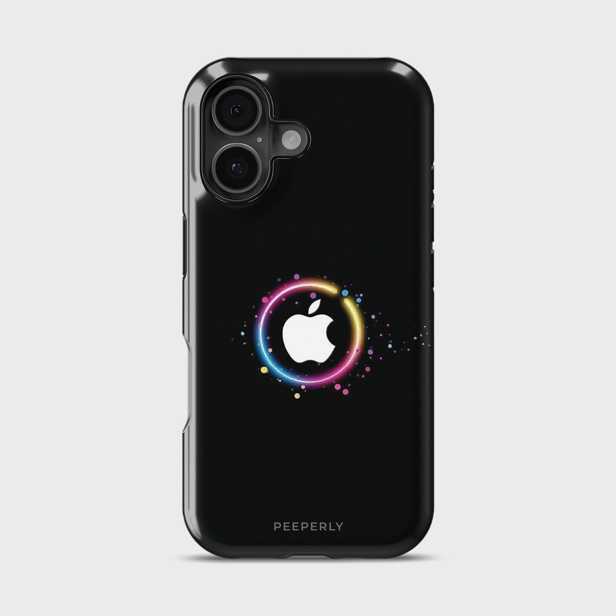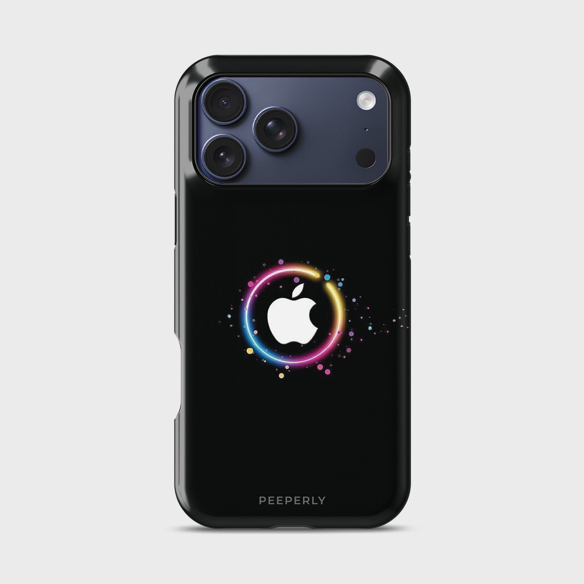 The Aurora Ring case captures the mesmerizing glow of the northern lights in a sleek, modern design. A radiant halo of color gracefully surrounds the Apple logo, blending vibrant hues of pink, blue, yellow, and violet against a deep black canvas — symbolizing harmony between energy and sophistication.
