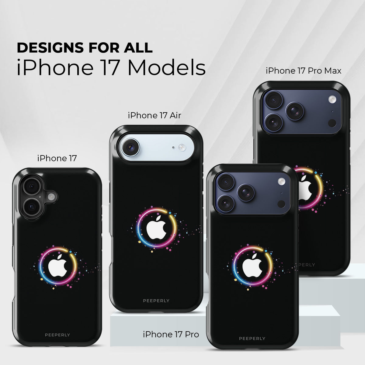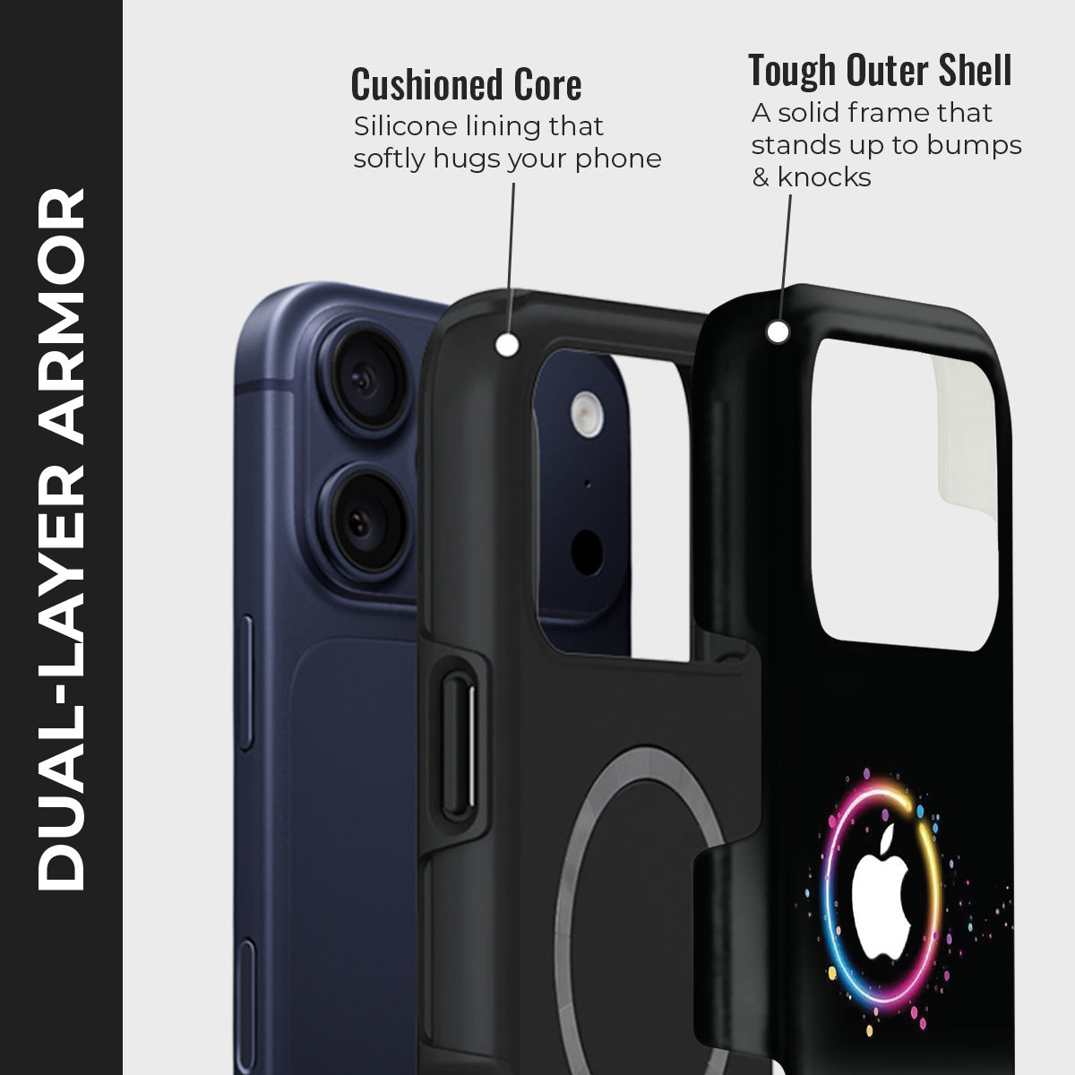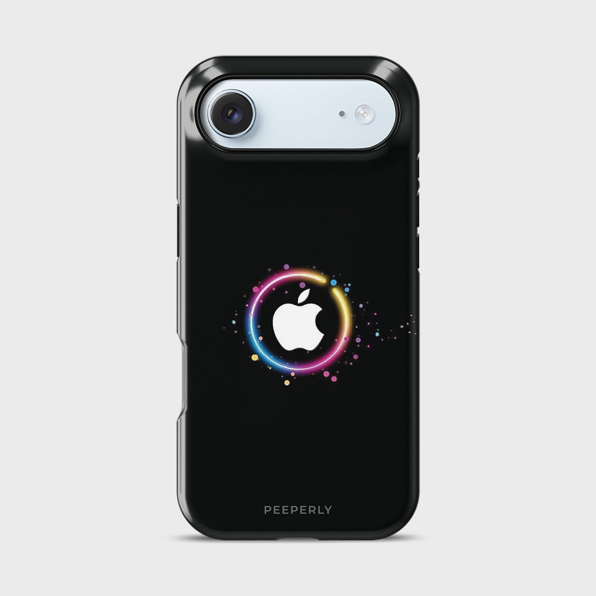The Aurora Ring case captures the mesmerizing glow of the northern lights in a sleek, modern design. A radiant halo of color gracefully surrounds the Apple logo, blending vibrant hues of pink, blue, yellow, and violet against a deep black canvas — symbolizing harmony between energy and sophistication.