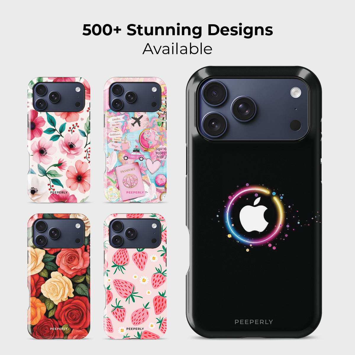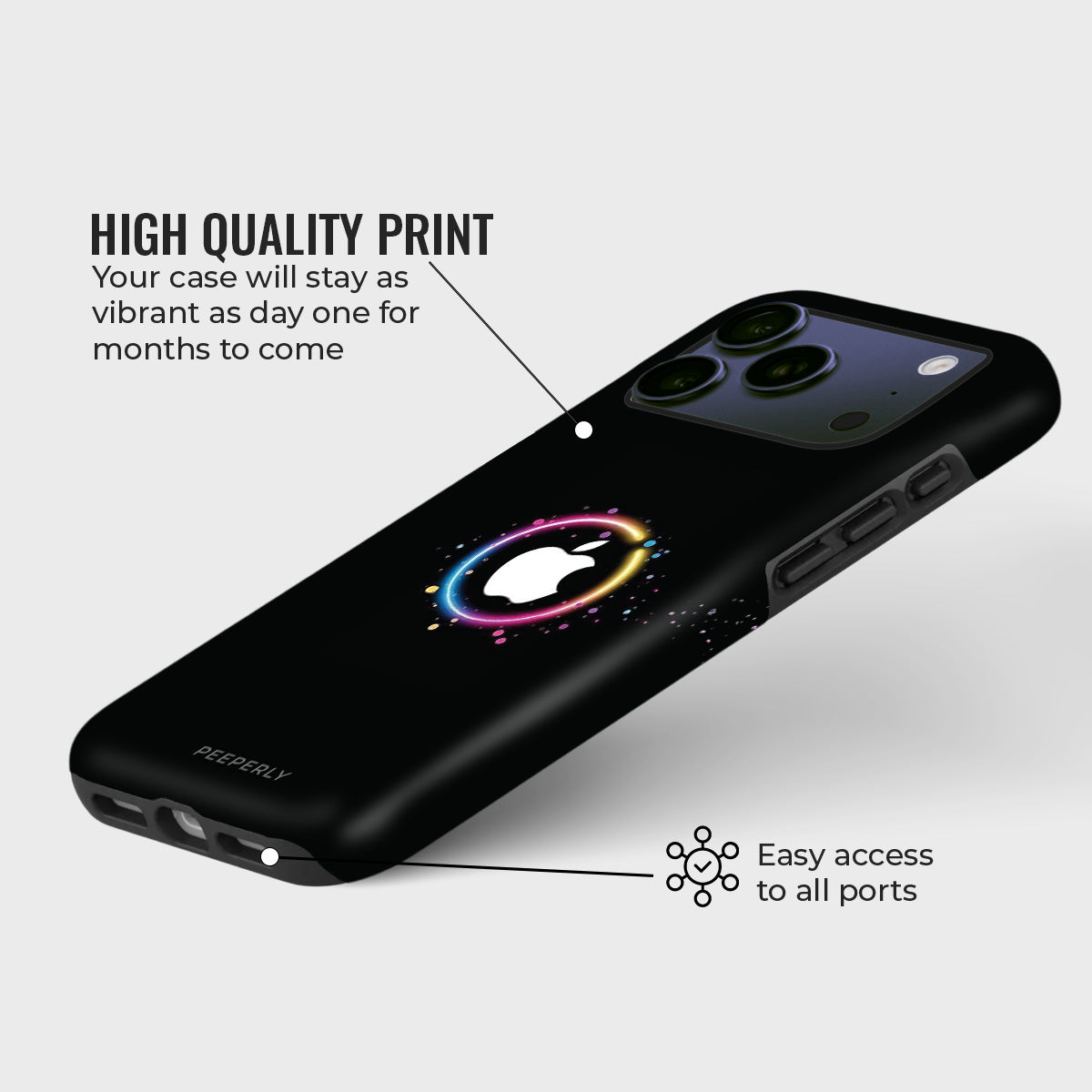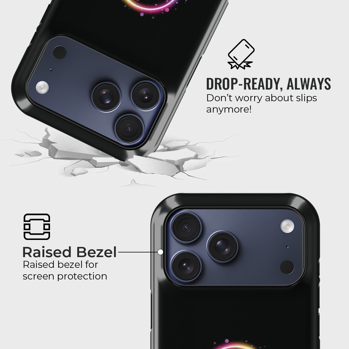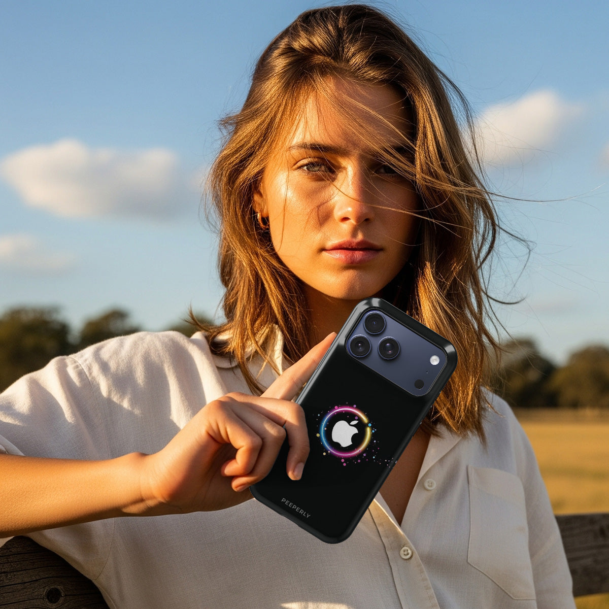 The Aurora Ring case captures the mesmerizing glow of the northern lights in a sleek, modern design. A radiant halo of color gracefully surrounds the Apple logo, blending vibrant hues of pink, blue, yellow, and violet against a deep black canvas — symbolizing harmony between energy and sophistication.