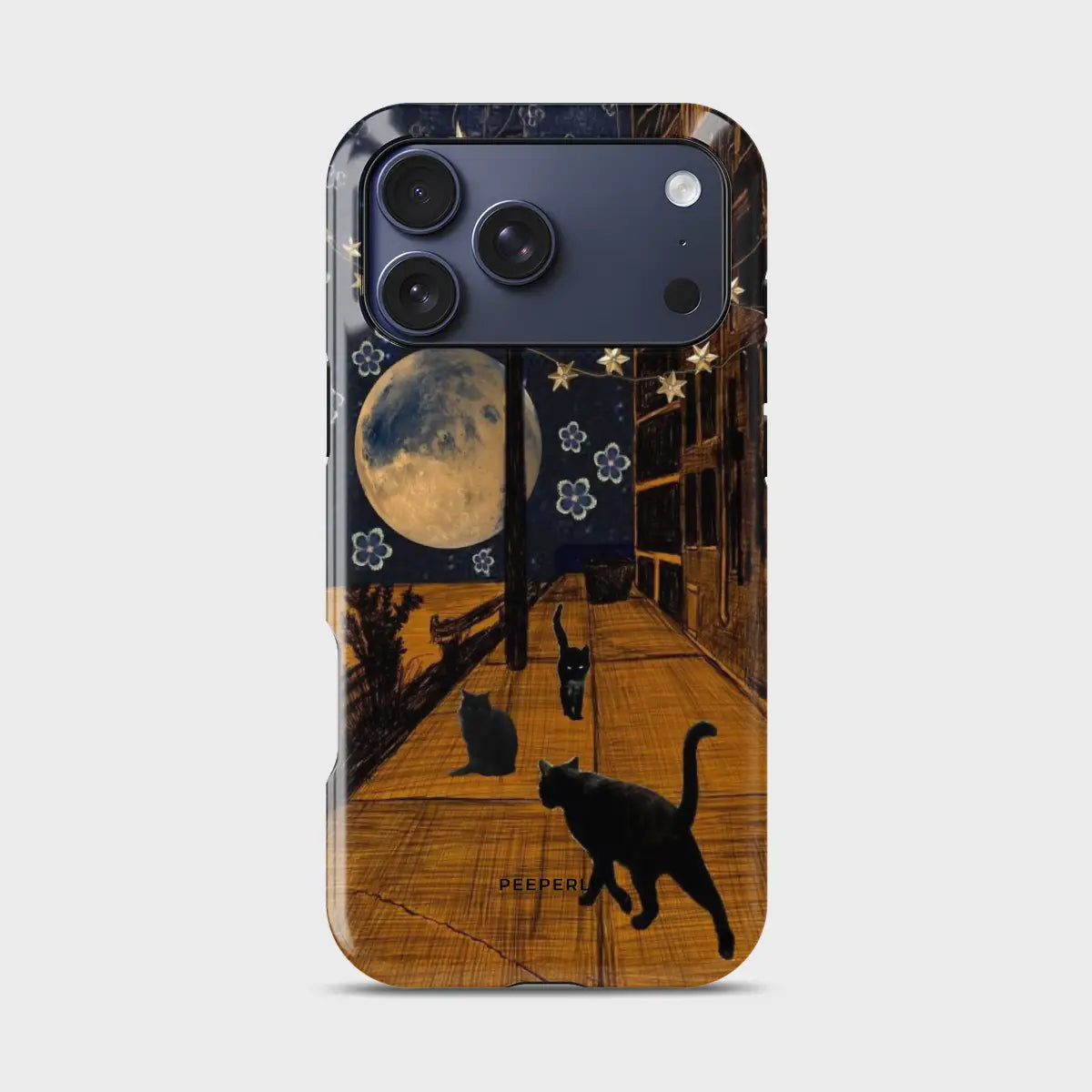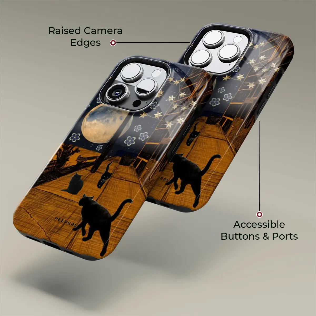 Drift into a dreamy night scene with Midnight Stroll, where curious cats wander beneath a glowing moonlit sky. Warm golden streets contrast beautifully with deep blue tones, capturing a quiet, magical moment of nighttime exploration. This design blends cozy charm with a touch of mystery, perfect for those who love serene nights and whimsical feline vibes.