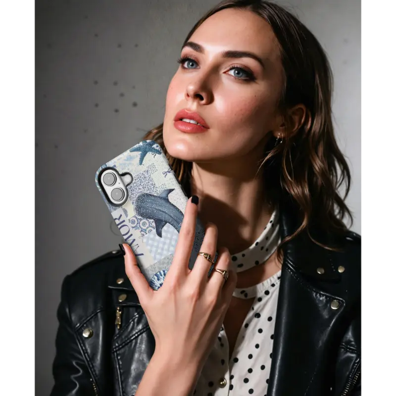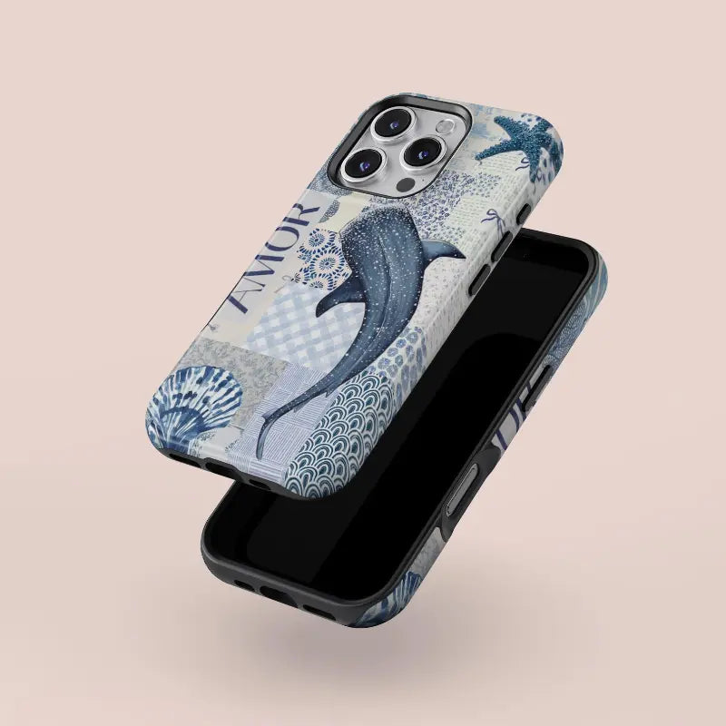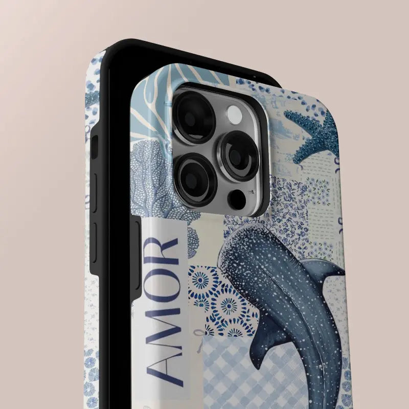 Nautical Calm brings together layered ocean motifs in a soft blue patchwork inspired by seaside textures and classic maritime design. Whales, shells, starfish, and geometric waves drift across the surface in harmonious tones of navy, indigo, and seafoam, creating a composition that feels both artistic and soothing.