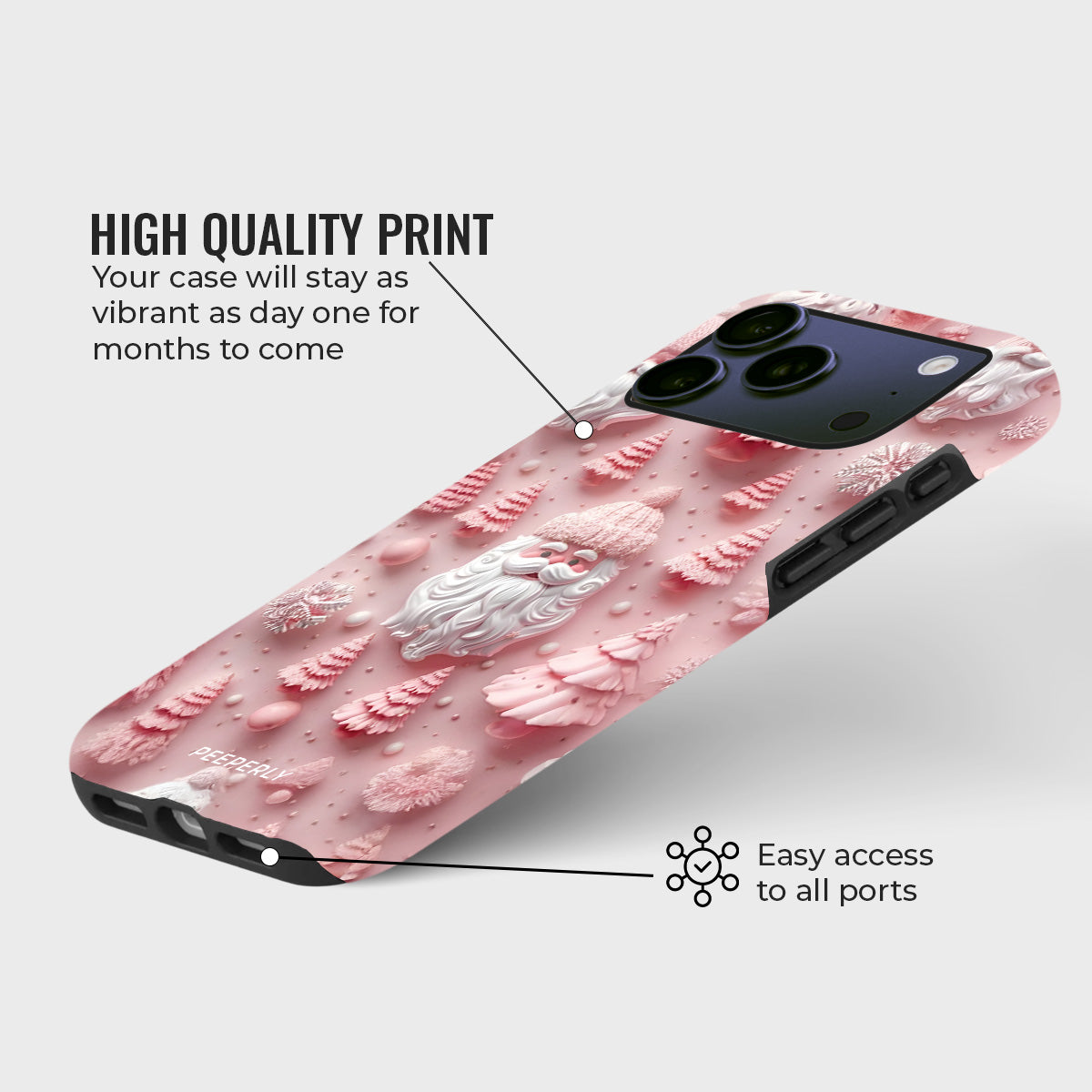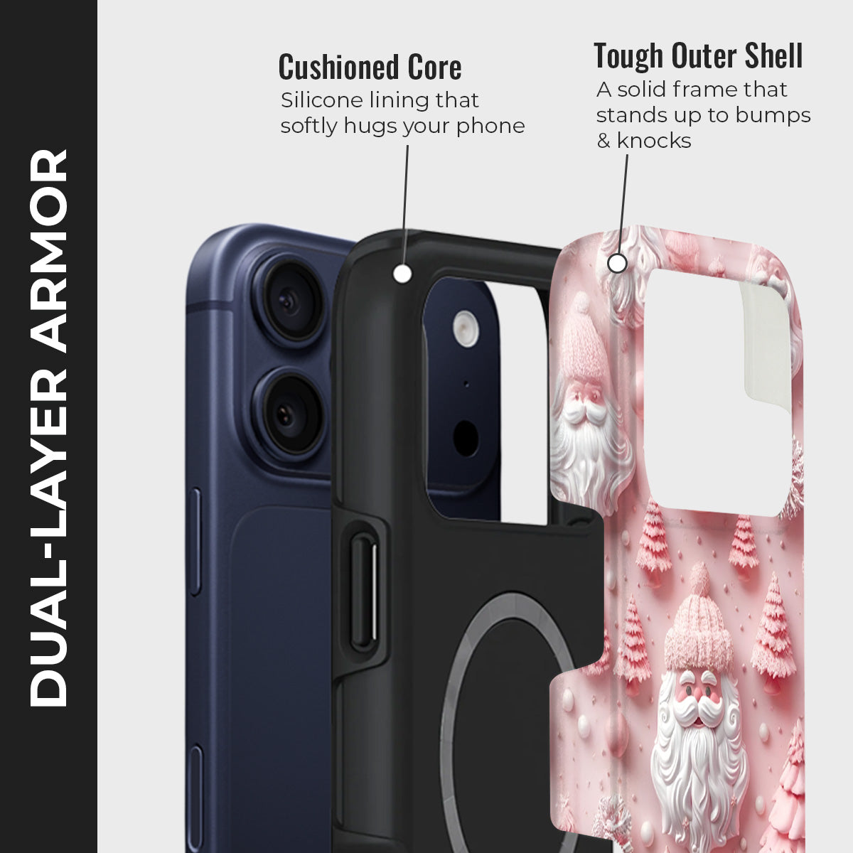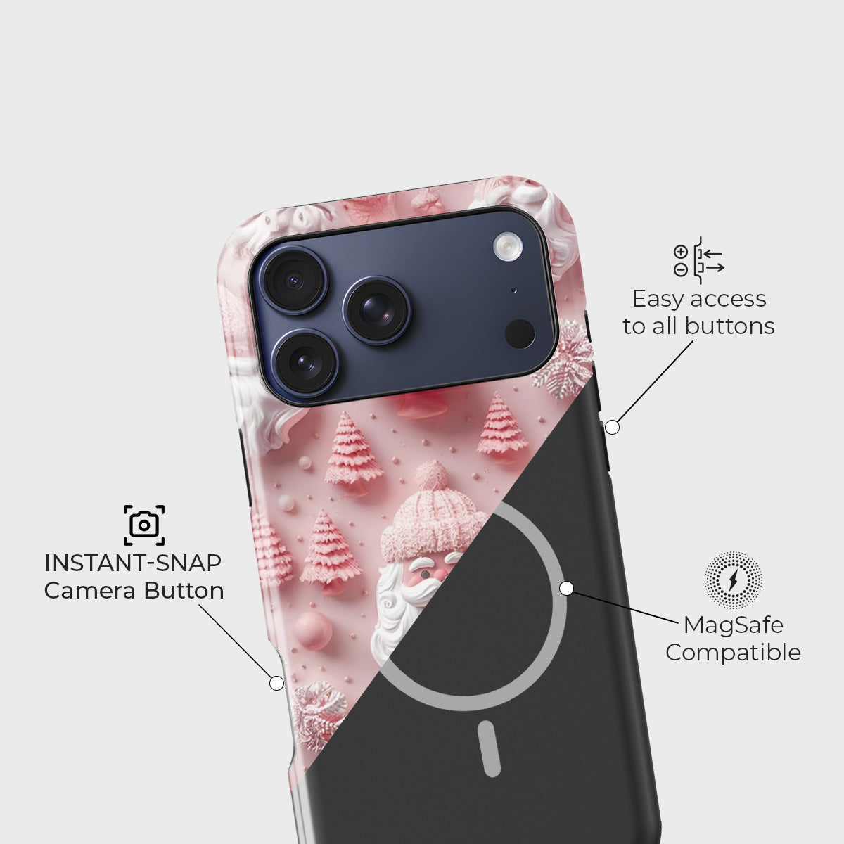 Bring the warmth of the holidays to your phone with the Rosy Claus case — a festive fusion of charm and cheer. Featuring a delightful pink Santa surrounded by frosted trees and playful holiday details, this case captures the joy of the season in a modern pastel palette.