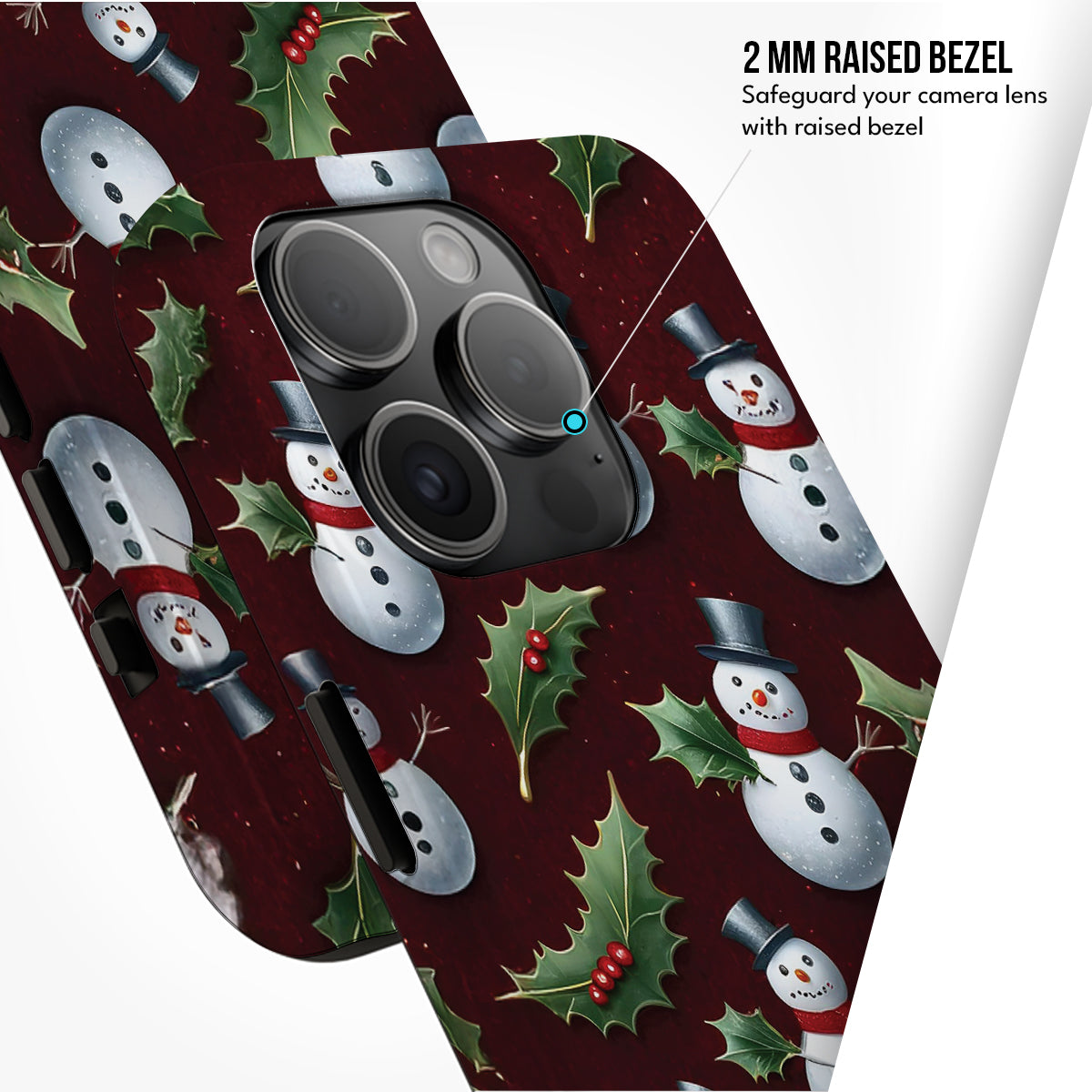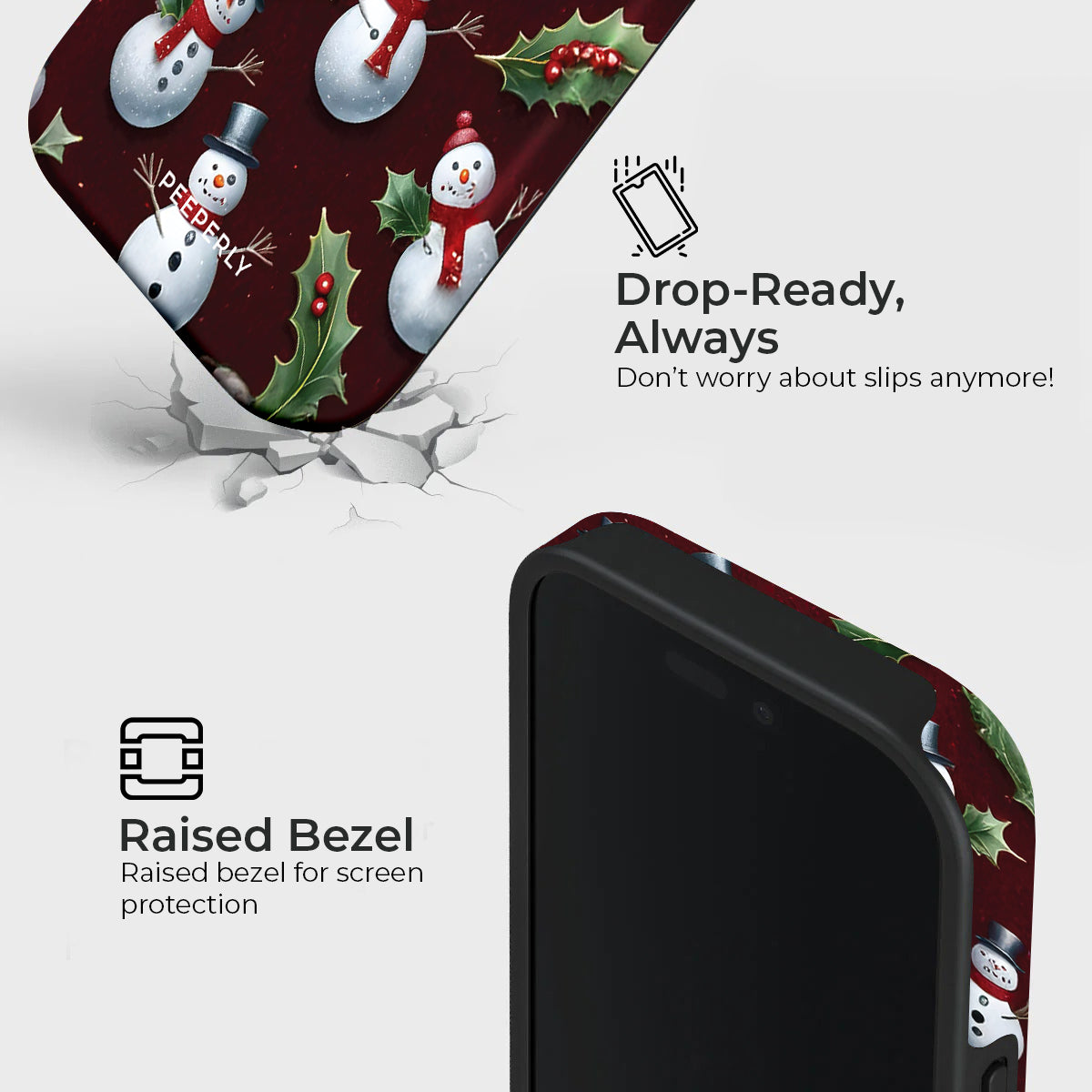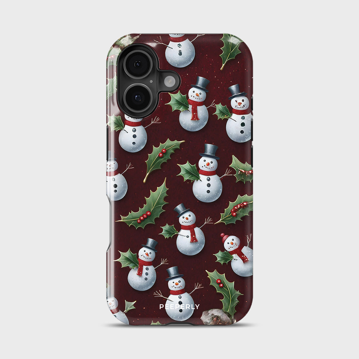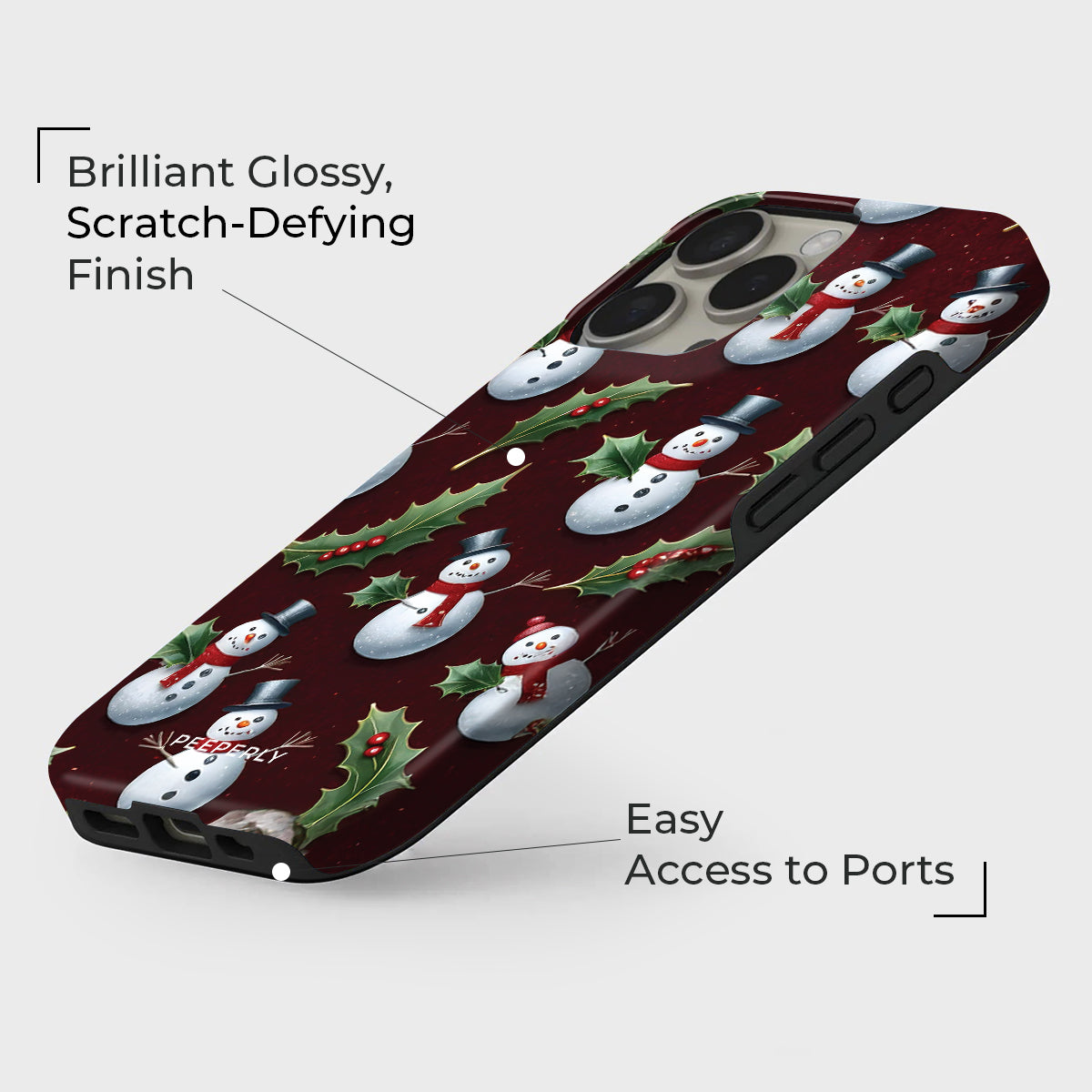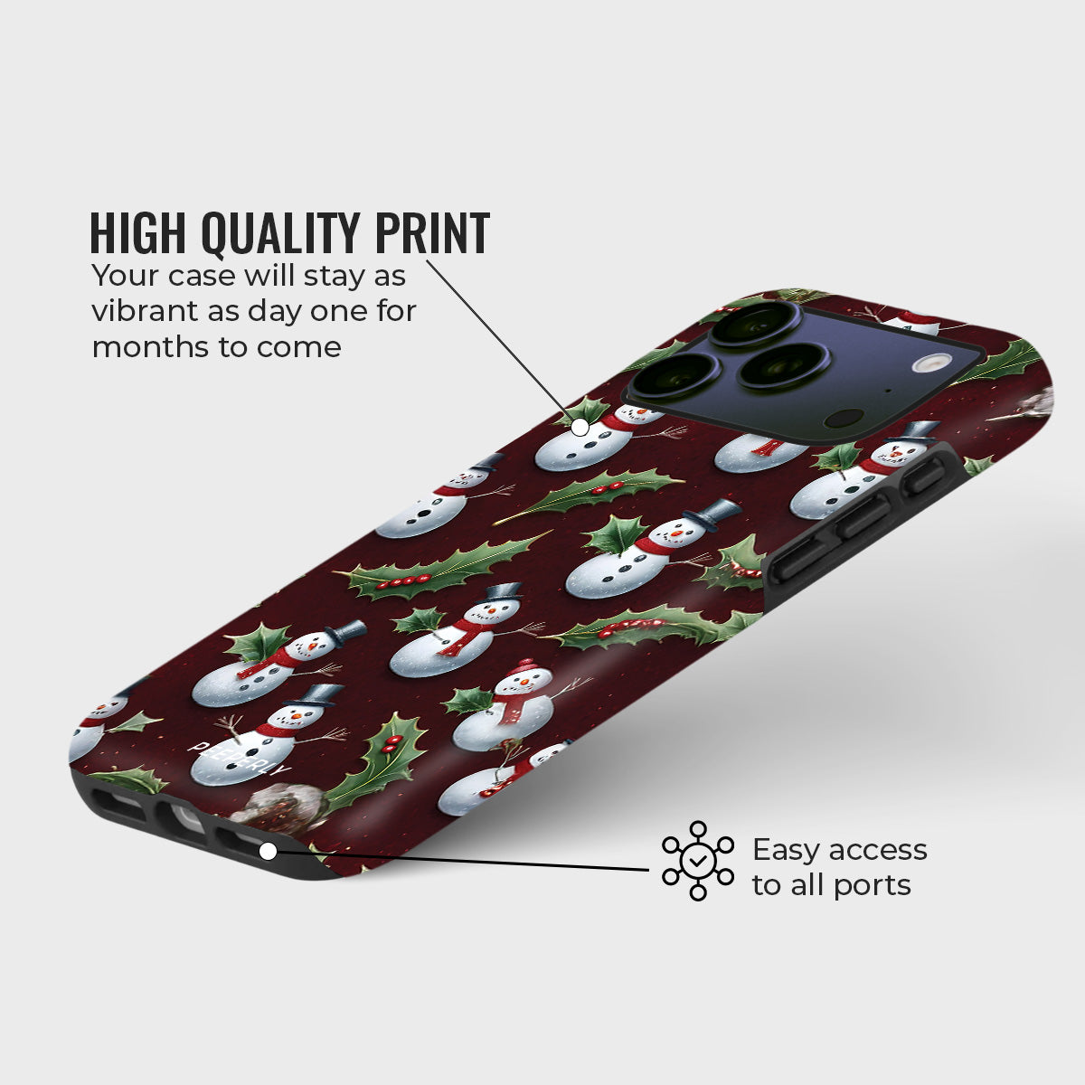 Wrap your phone in the magic of winter with Snowman Delight — a charming case that captures the joy and coziness of the holiday season. Adorned with cheerful snowmen, festive holly leaves, and a deep crimson background, this case brings warmth and wonder to every glance.