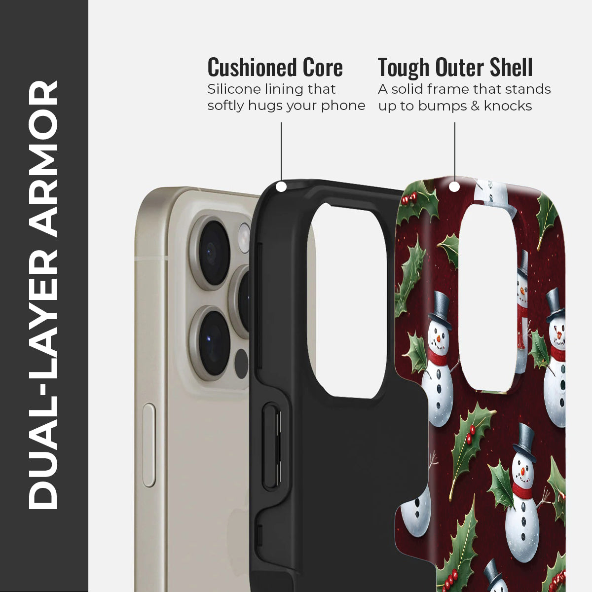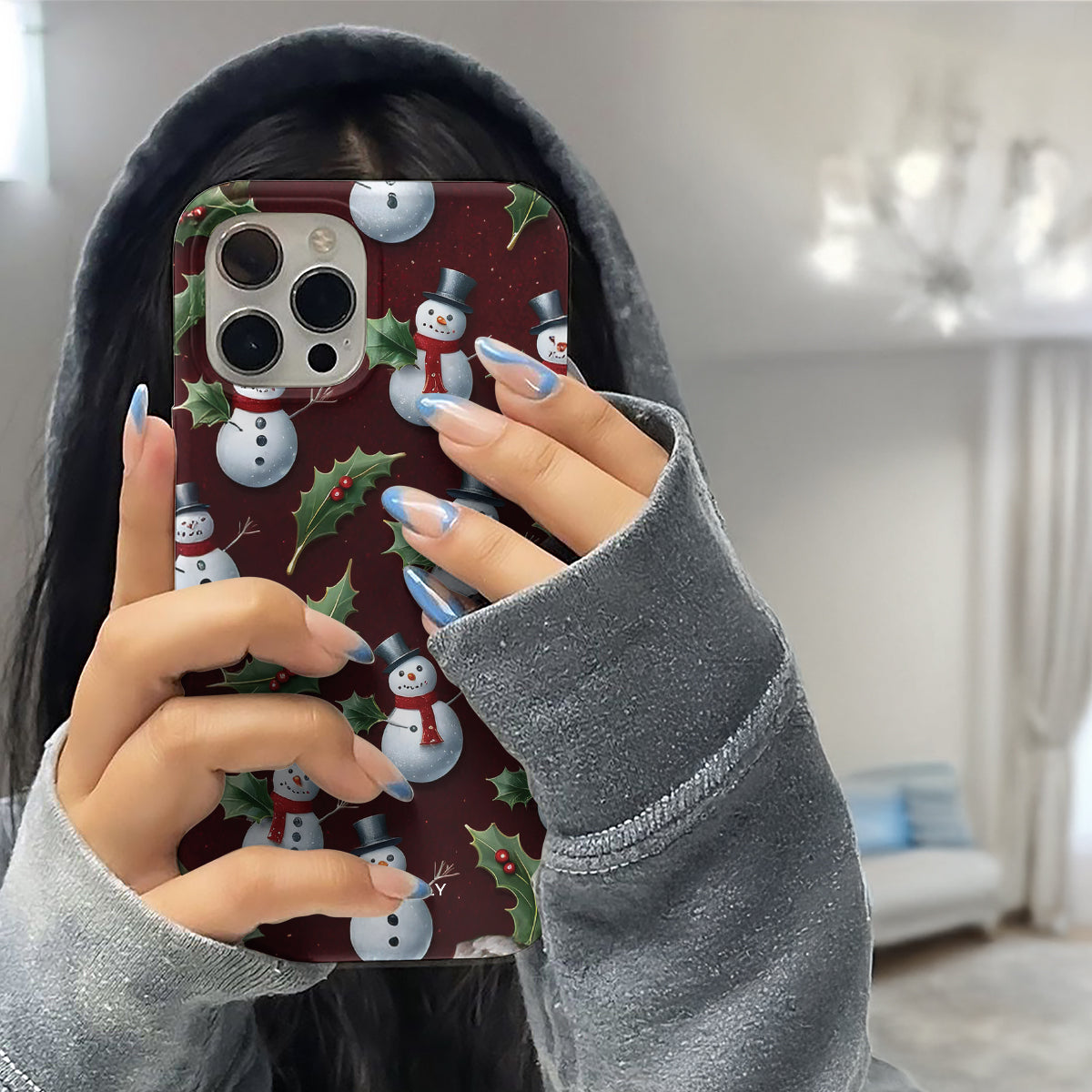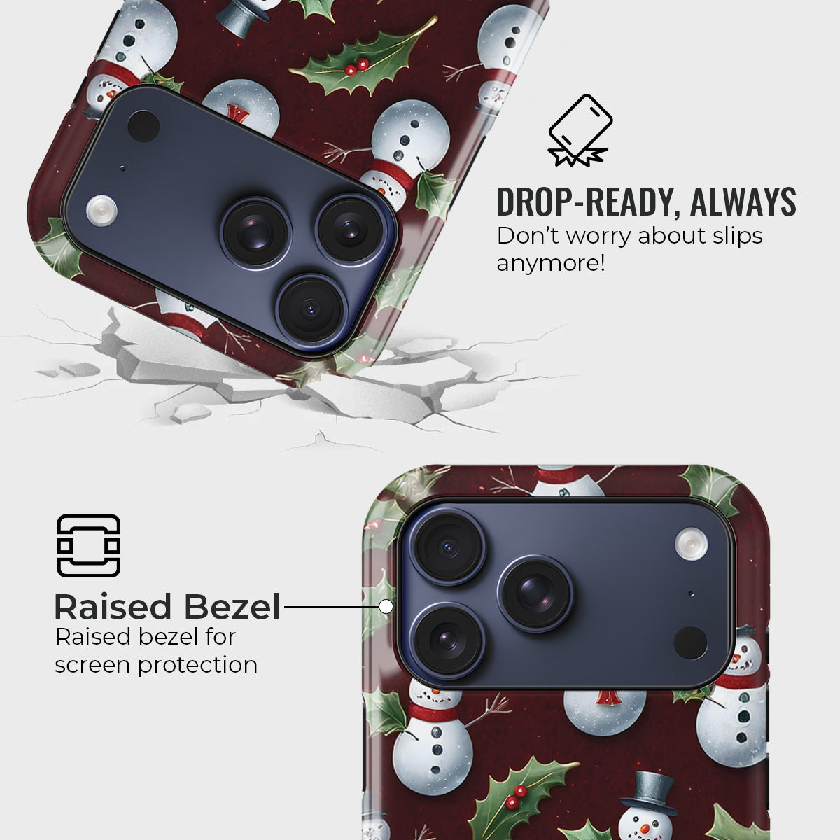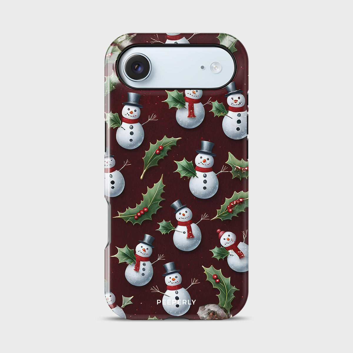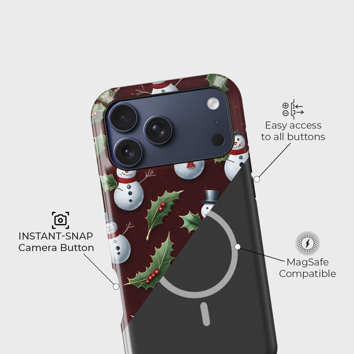 Wrap your phone in the magic of winter with Snowman Delight — a charming case that captures the joy and coziness of the holiday season. Adorned with cheerful snowmen, festive holly leaves, and a deep crimson background, this case brings warmth and wonder to every glance.