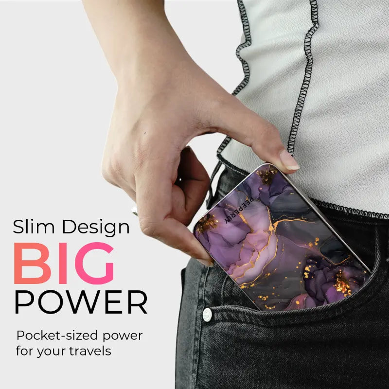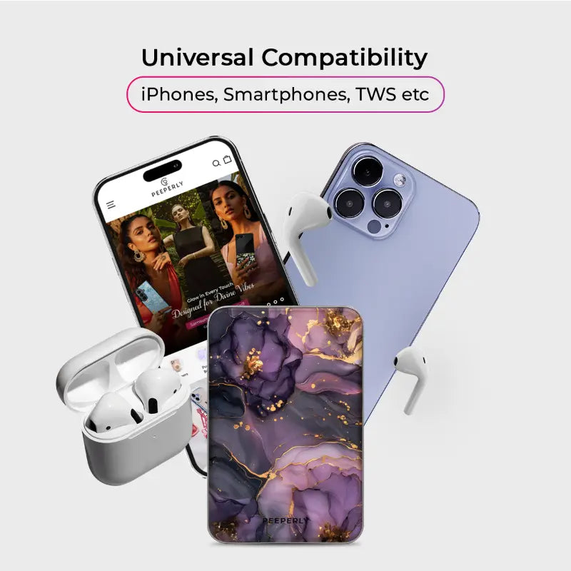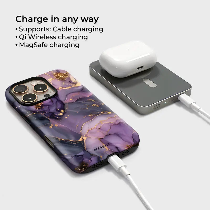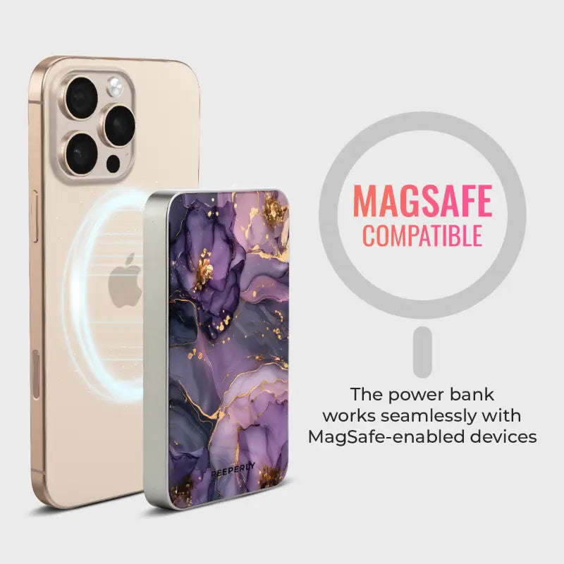 Charge in style The Amethyst Veins Magnetic Power Bank blends everyday function with luxe design. Inspired by flowing amethyst stone, its rich violet tones are threaded with delicate gold veining for a look that feels equal parts modern and elegant.