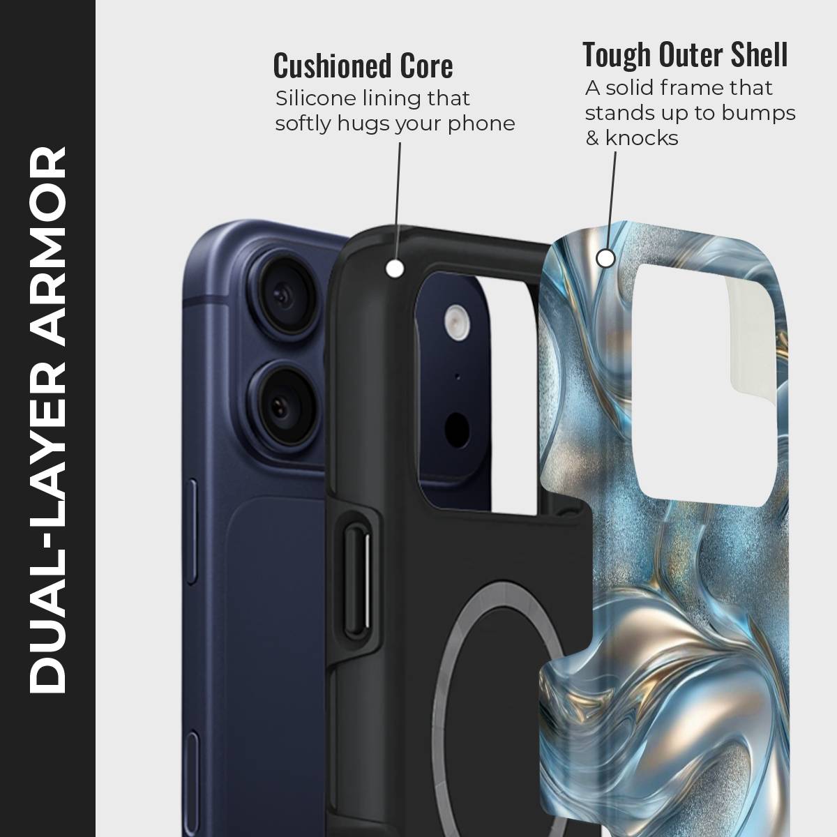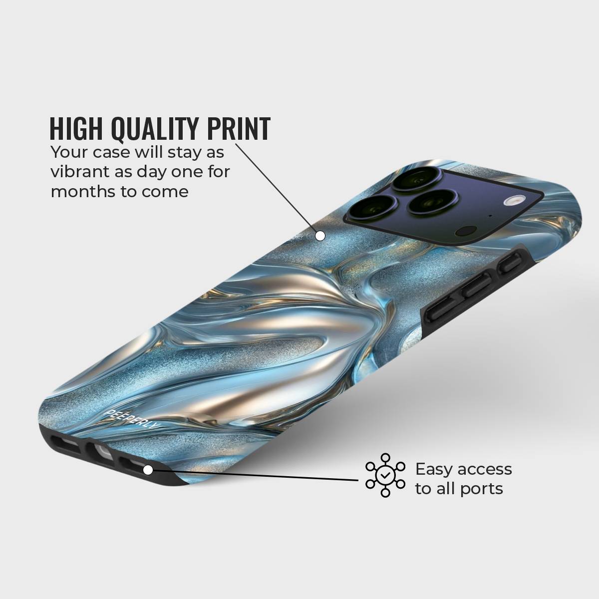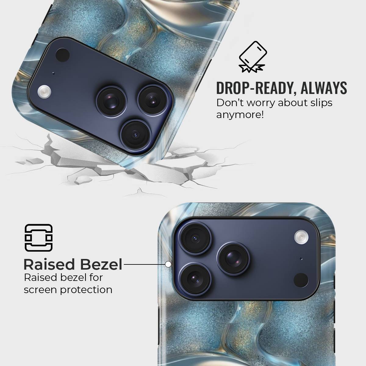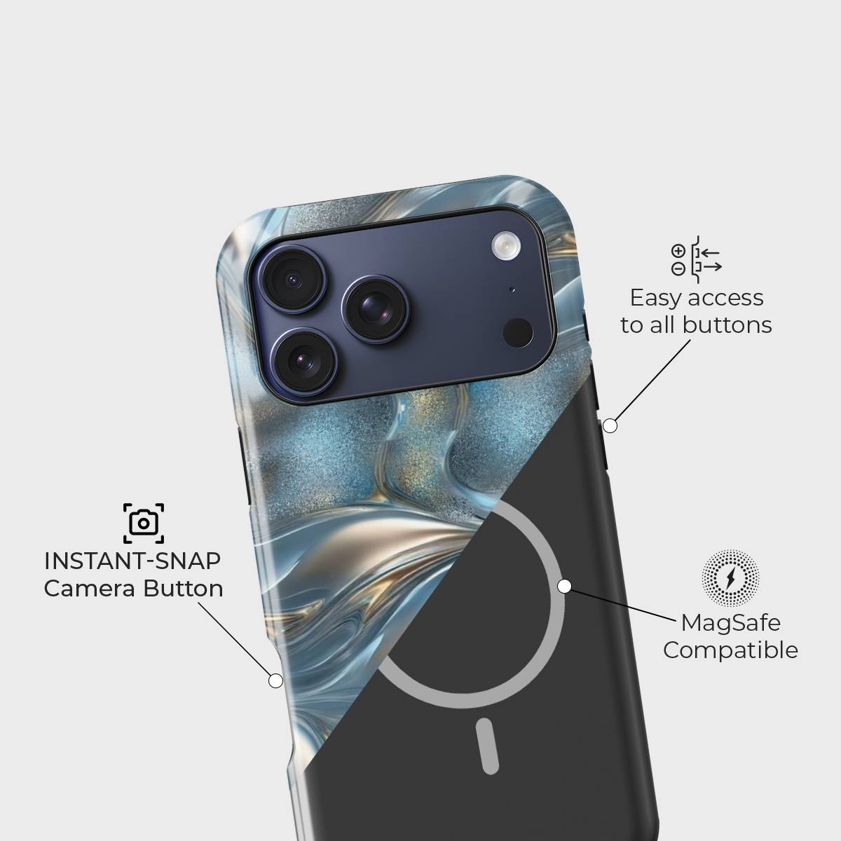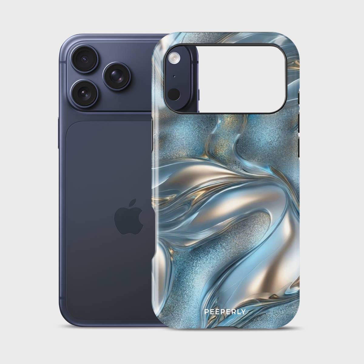 Dive into elegance with the Aqua Gleam Case, where fluid metallic waves meet a sparkling aqua backdrop. This case combines a sleek, glossy finish with a mesmerizing liquid-metal design, offering both stunning looks and everyday protection.