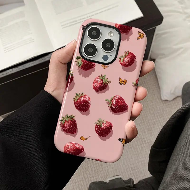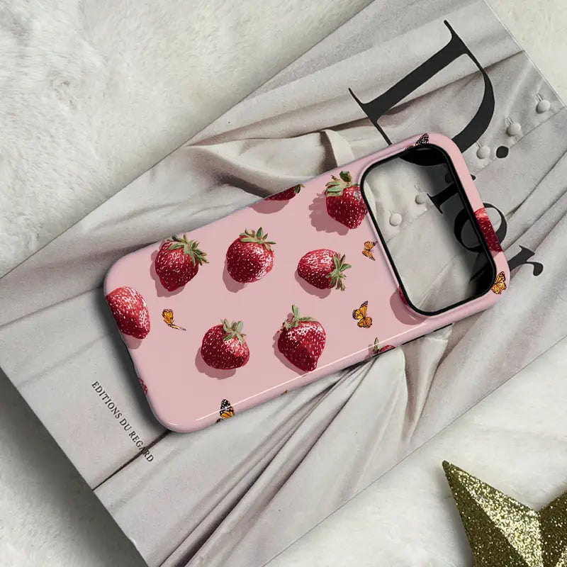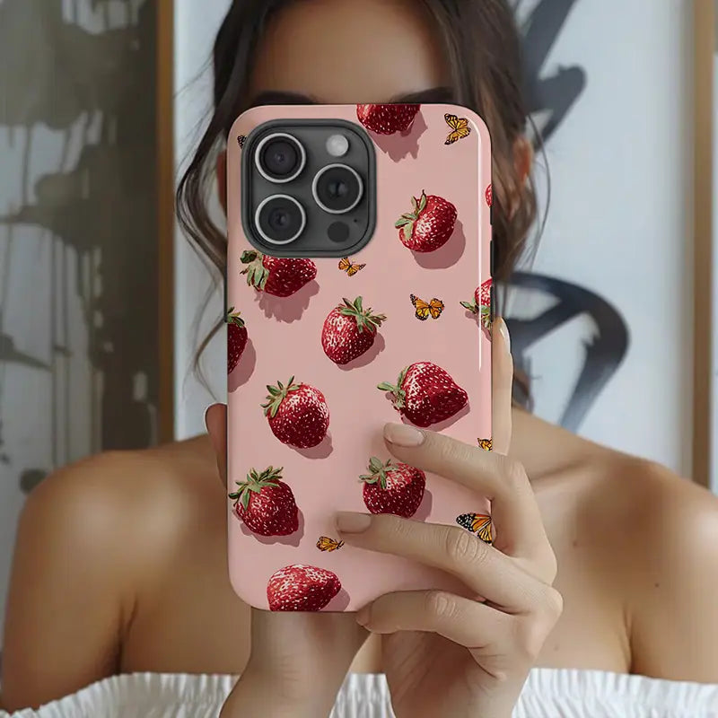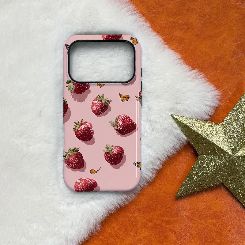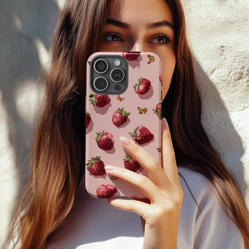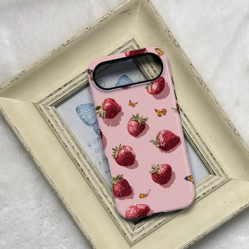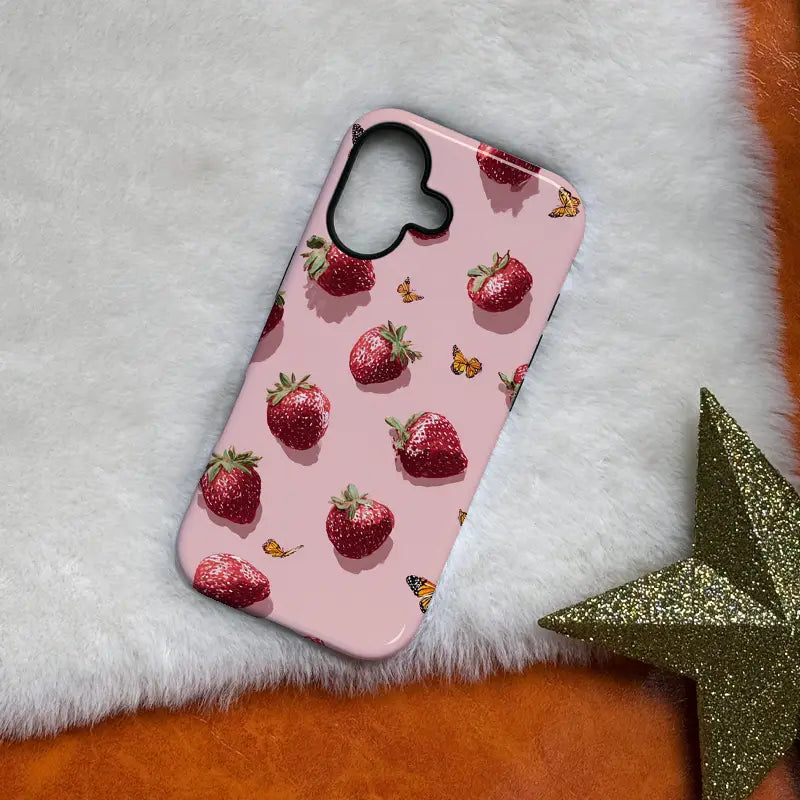 Sweet, dreamy, and full of life — the Berry Muse Case brings a fresh touch of joy to your everyday style. With vibrant strawberries and delicate butterflies set against a soft blush backdrop, this design captures the perfect mix of playfulness and elegance.
