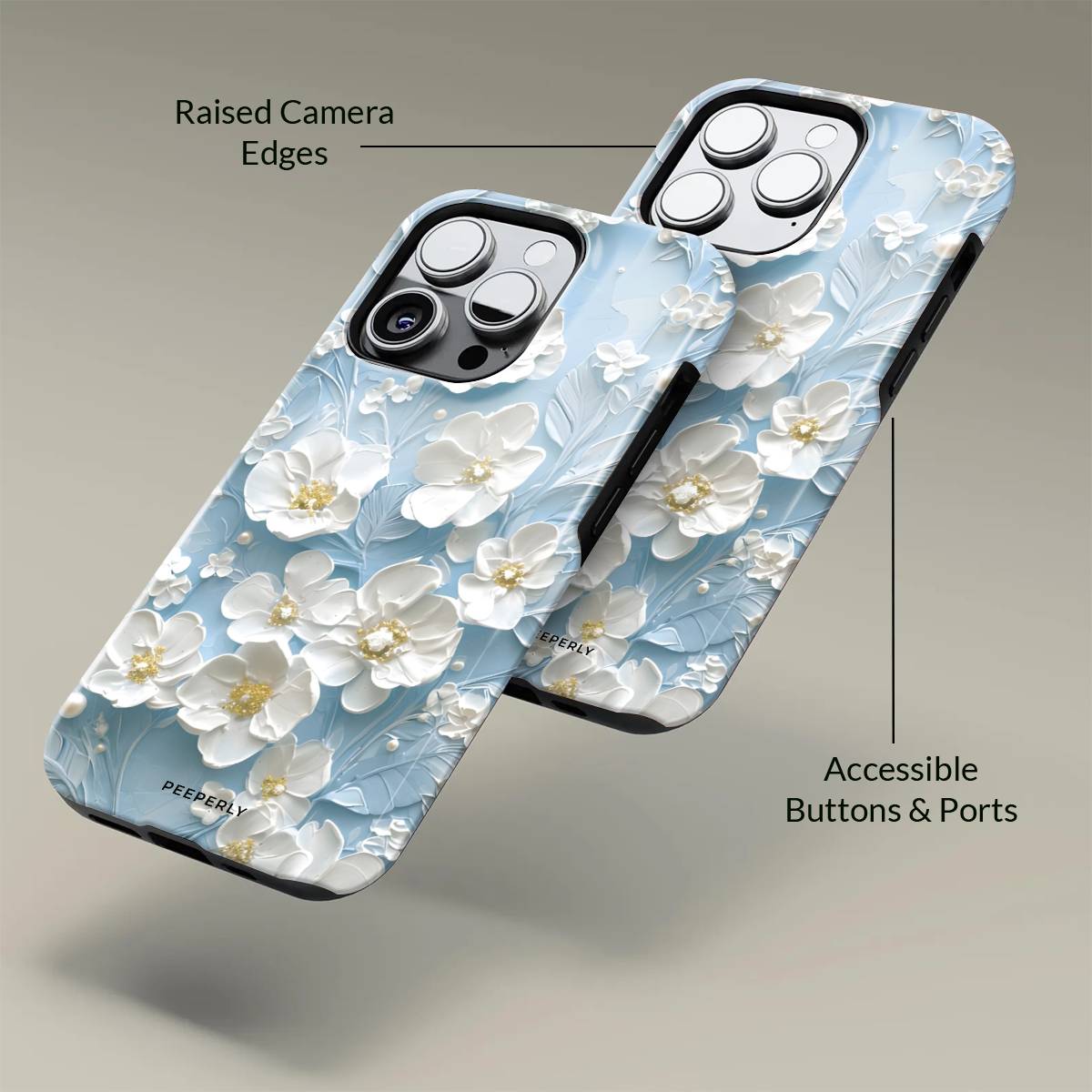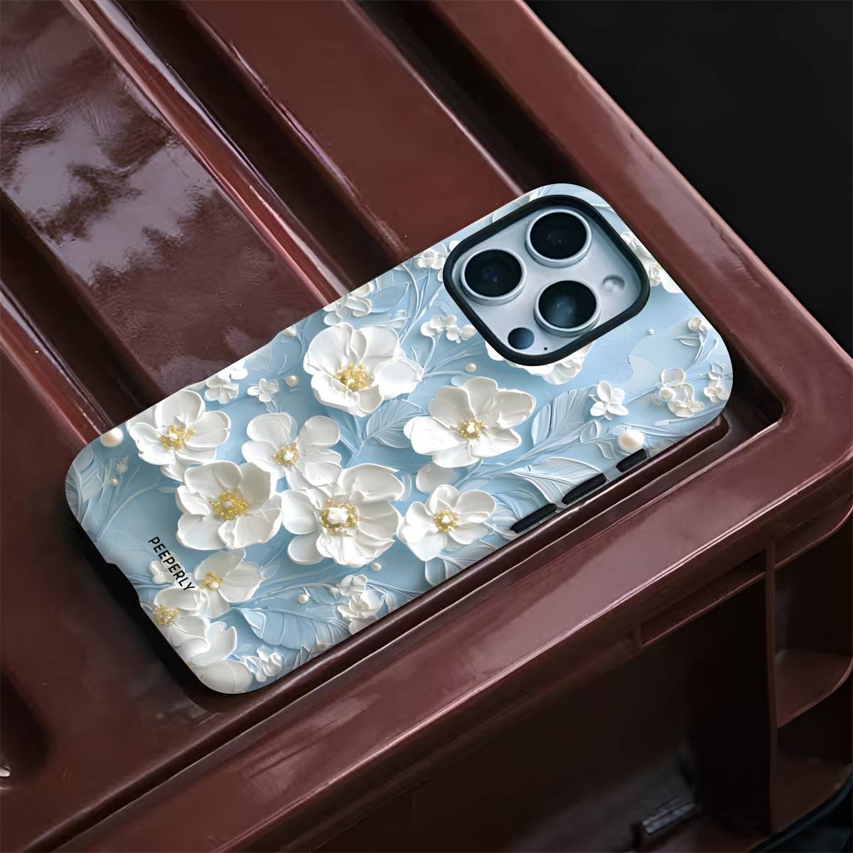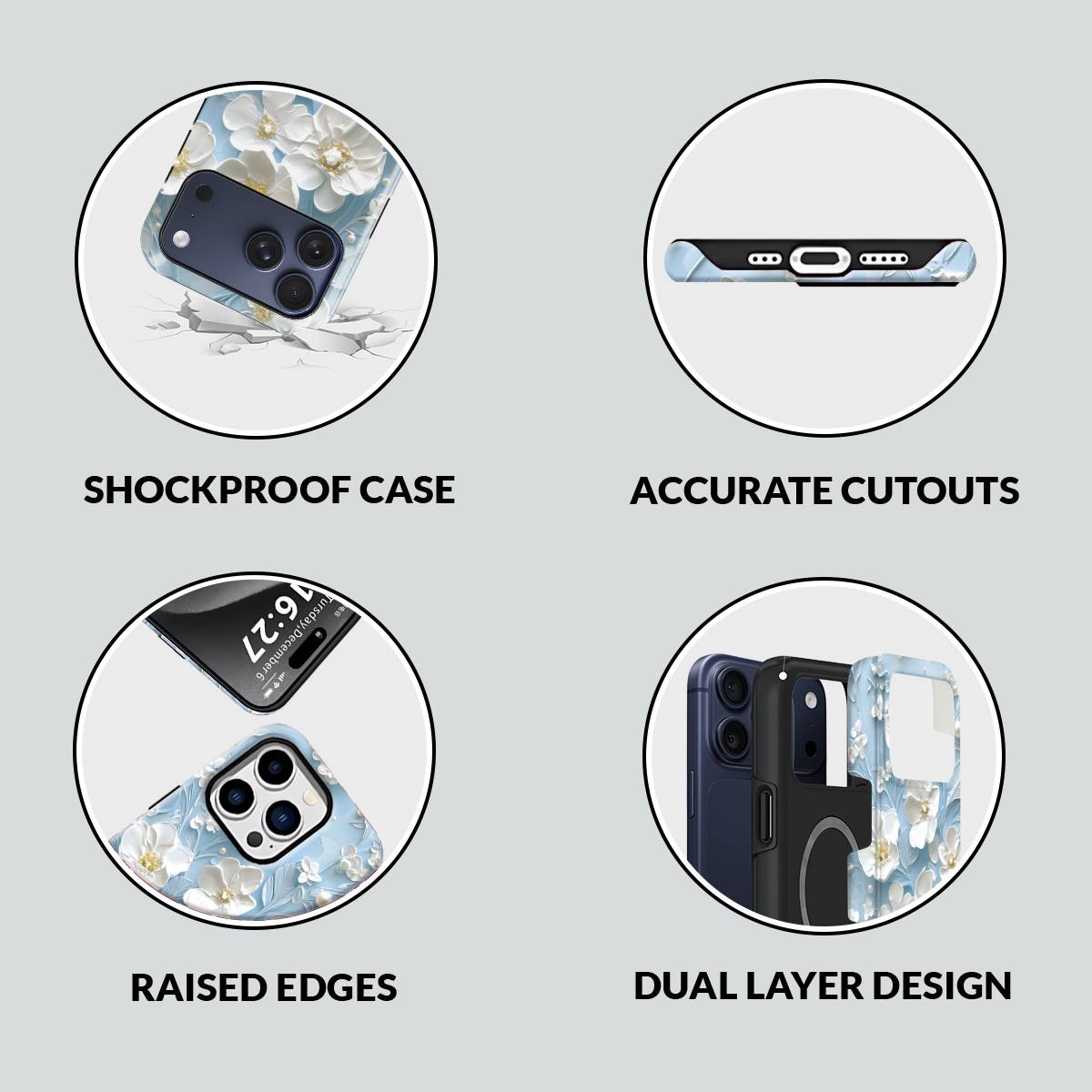 Embrace the beauty of nature’s elegance with the Blossom Grace Case — a stunning design that brings a touch of serenity and sophistication to your everyday style. Featuring delicately detailed white blossoms set against a soft blue background, this case captures the essence of grace, freshness, and timeless charm.
