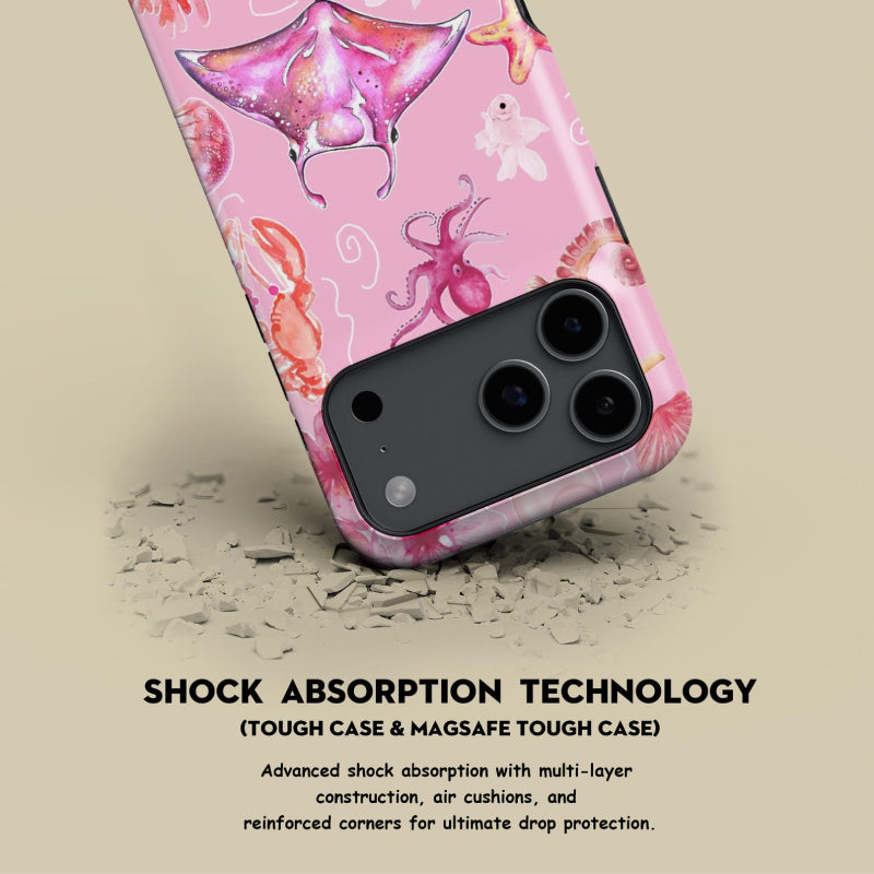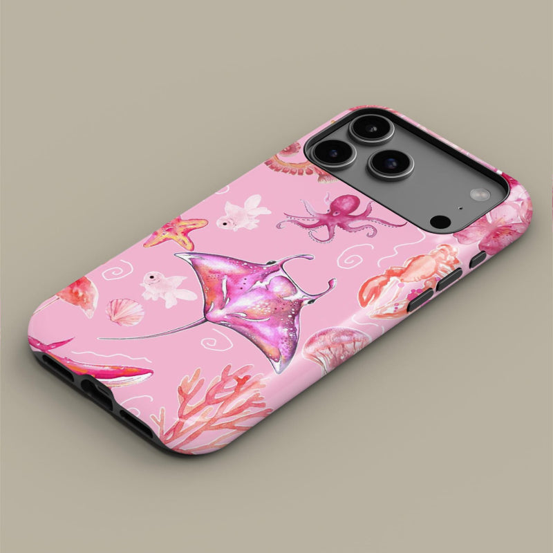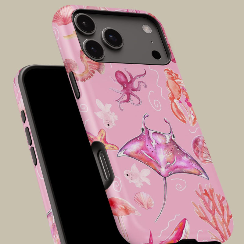 Blushing Reef drifts beneath the surface into a pastel underwater world where coral, rays, and sea creatures float through warm shades of pink. Hand-illustrated details and gentle movement give the design a light, dreamy feel—playful yet calming, like sunlight filtering through shallow water.