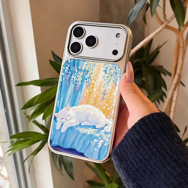 A calming, dreamlike design featuring a fluffy white cat peacefully sleeping beside a gentle cascade of water. Soft blues, golden light, and floating petals create a tranquil atmosphere, evoking rest, comfort, and quiet daydreams—perfect for those who love soothing, cozy aesthetics.