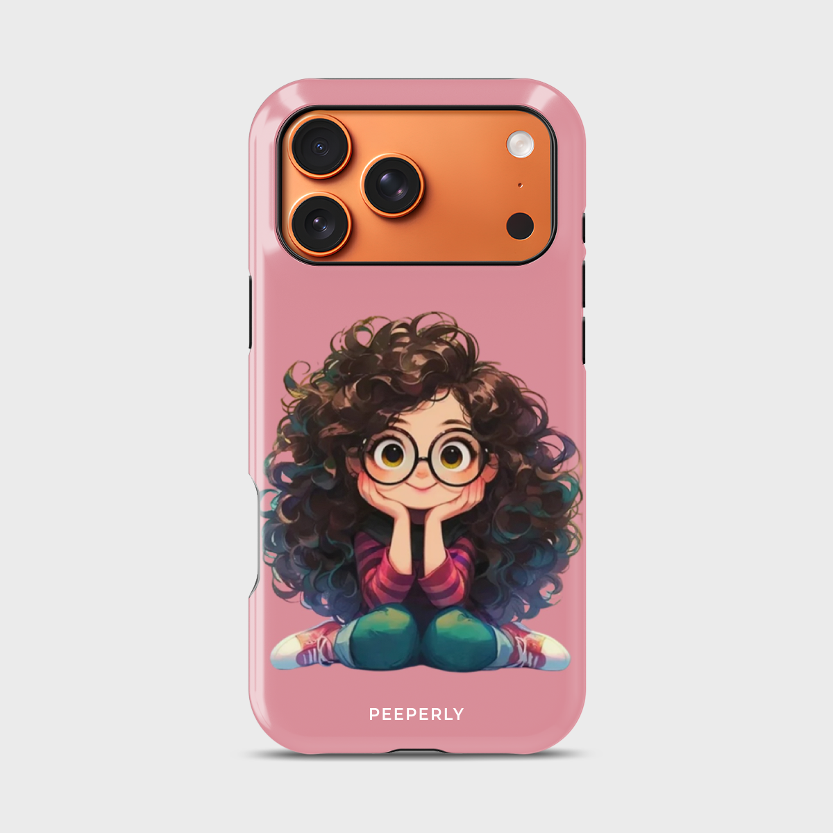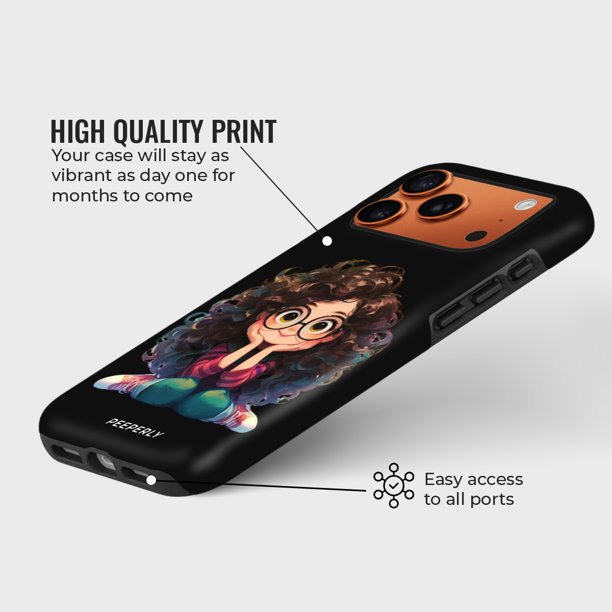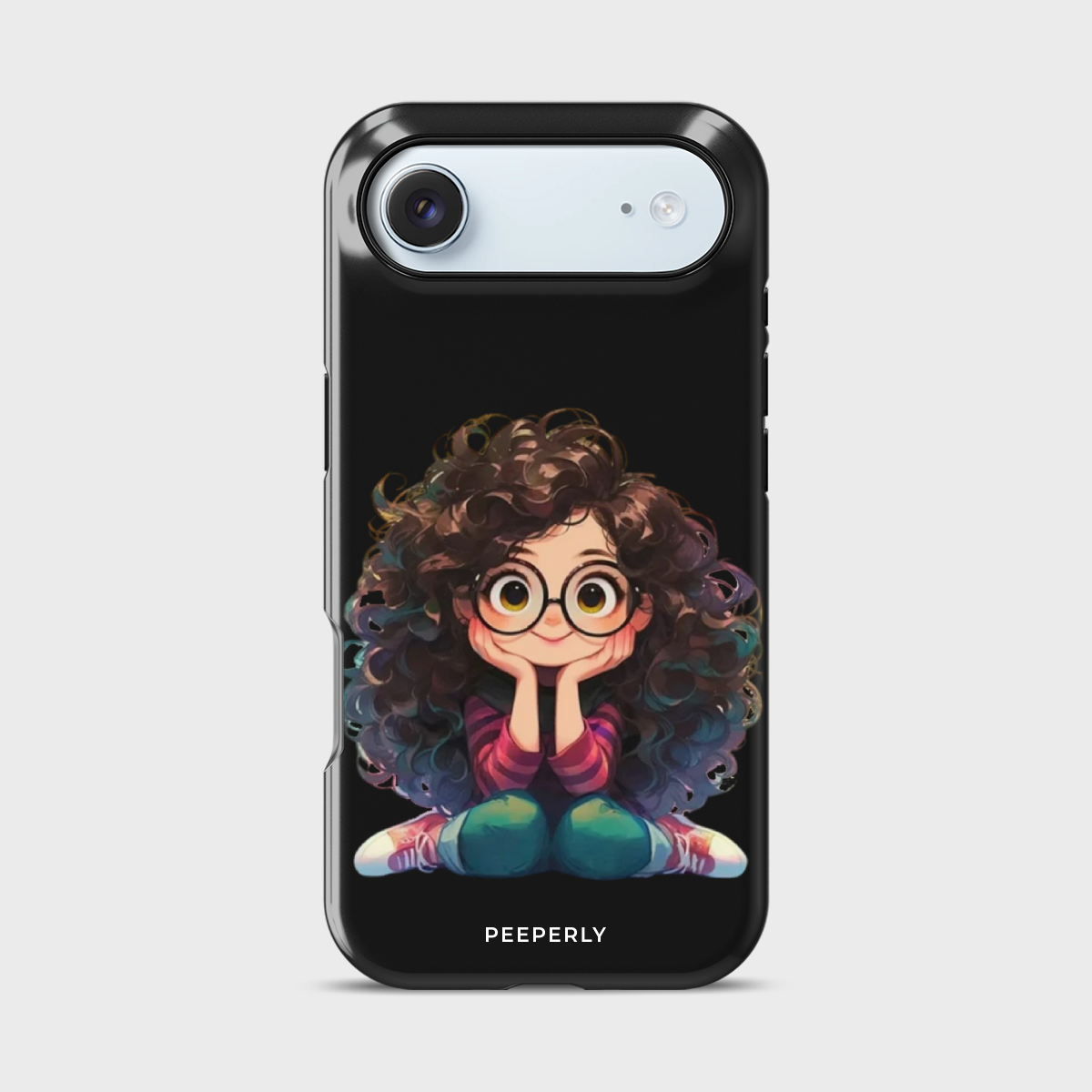 The Cozy Curls Case is a heart-stealing blend of charm, warmth, and personality. Featuring an adorable character illustration with voluminous curly hair, bright expressive eyes, and a relaxed, playful pose, this design instantly brings joy to anyone who sees it.