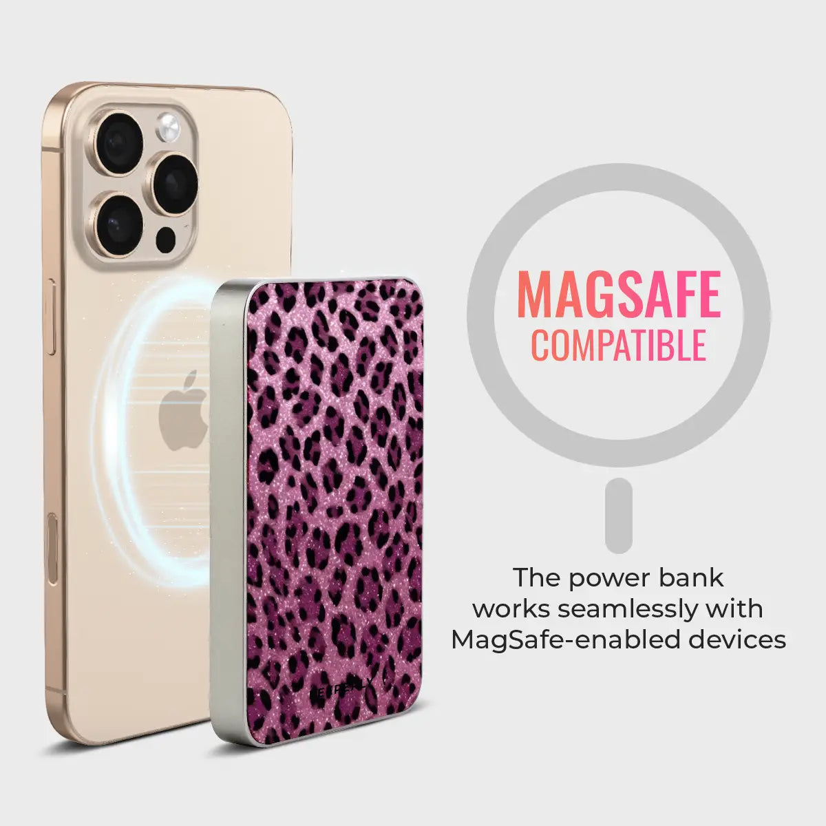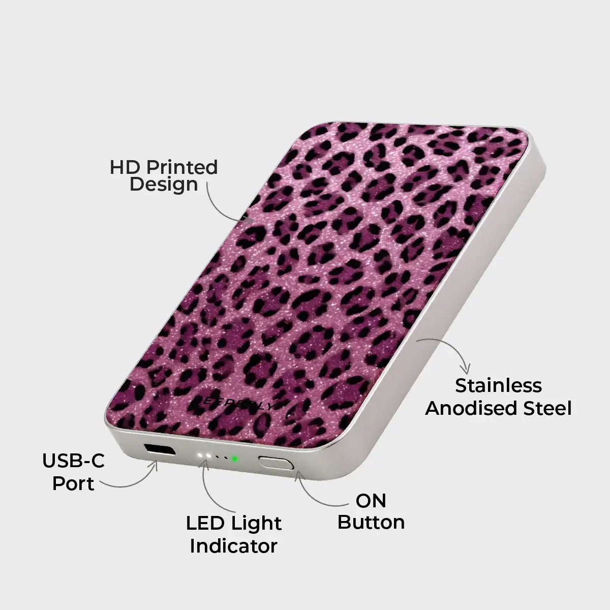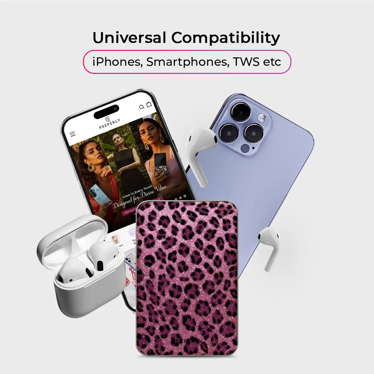 Designed with strong magnetic snap-on charging for effortless convenience, this slim and lightweight power bank delivers power with personality. Glitter Leopard is made for those who love statement pieces, glam energy, and unapologetically bold style.