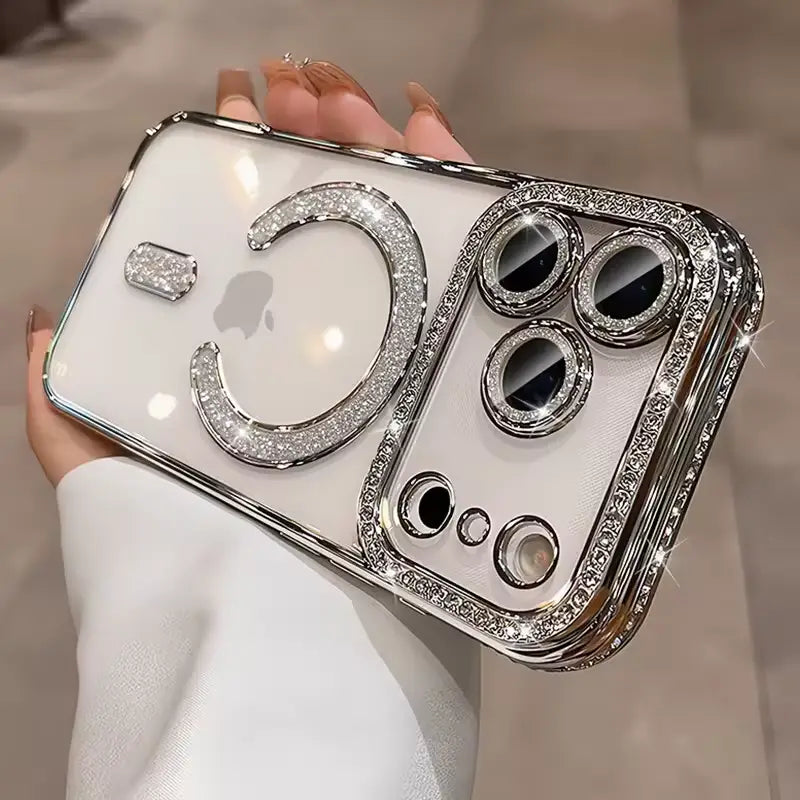 Inspired by the soft glow of sunset, this dazzling case features a golden gradient with a fine glitter finish that shimmers beautifully under any light. The chrome metallic edges and MagSafe-compatible ring add a touch of elegance and practicality, ensuring your phone looks as flawless as it performs.