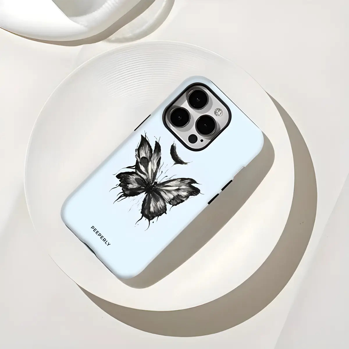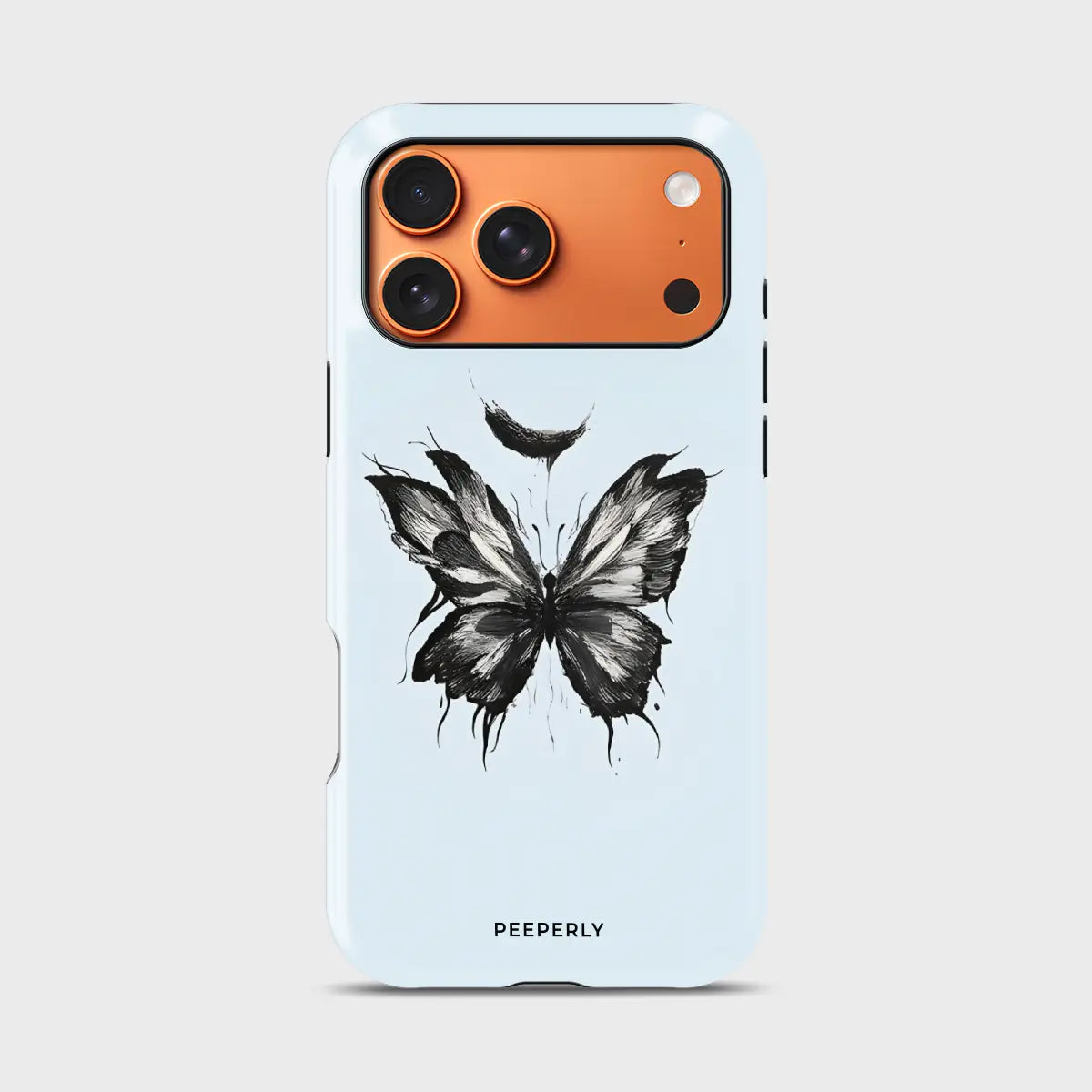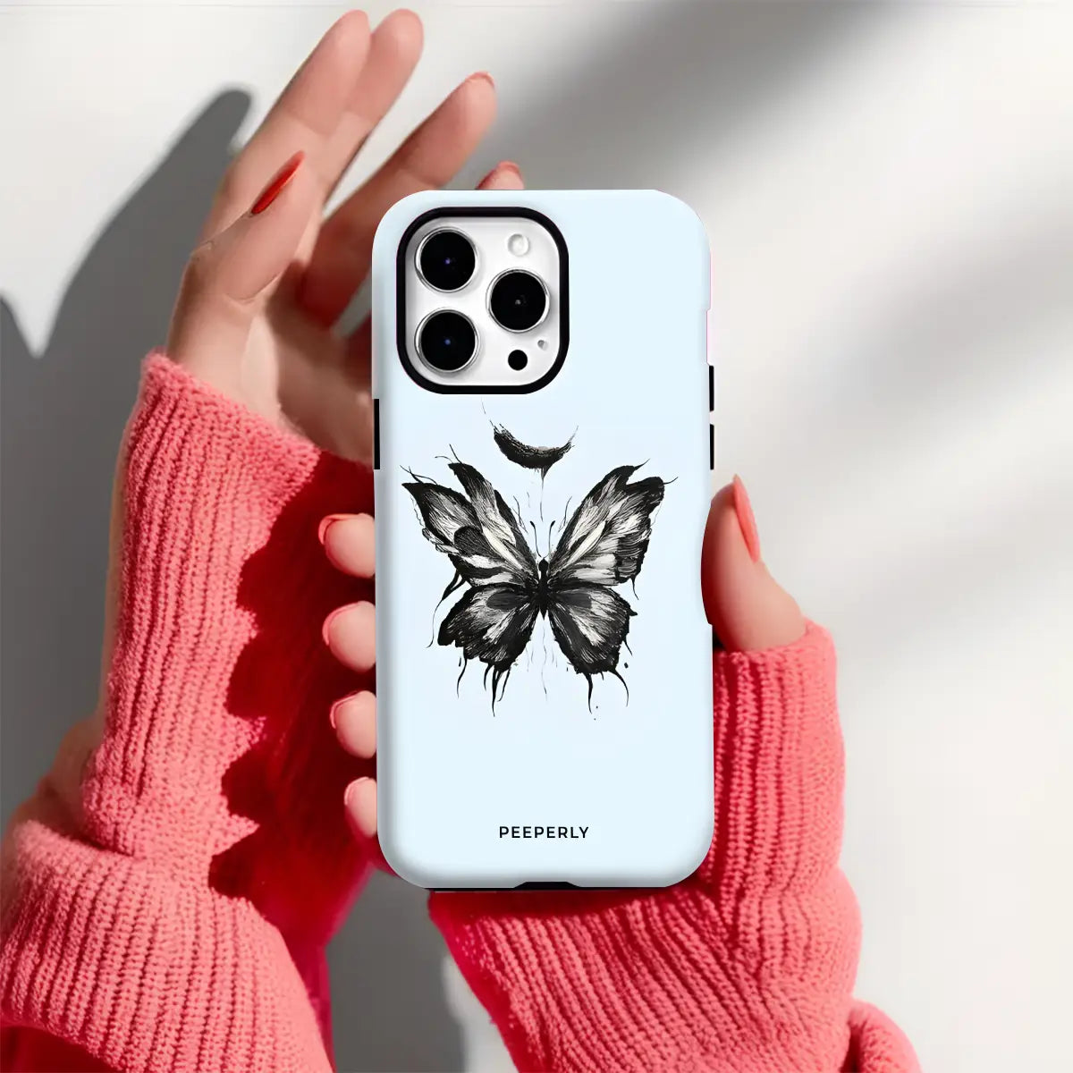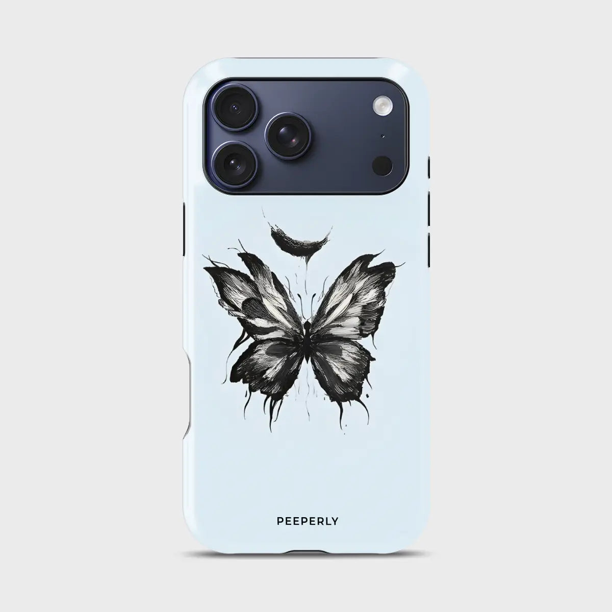 Inkwing centers on a hand-rendered black butterfly, its wings formed from fluid ink strokes that feel raw, delicate, and alive. Set against a soft, pale background, the contrast highlights every drip and feathered edge, giving the design a sense of motion frozen in time.