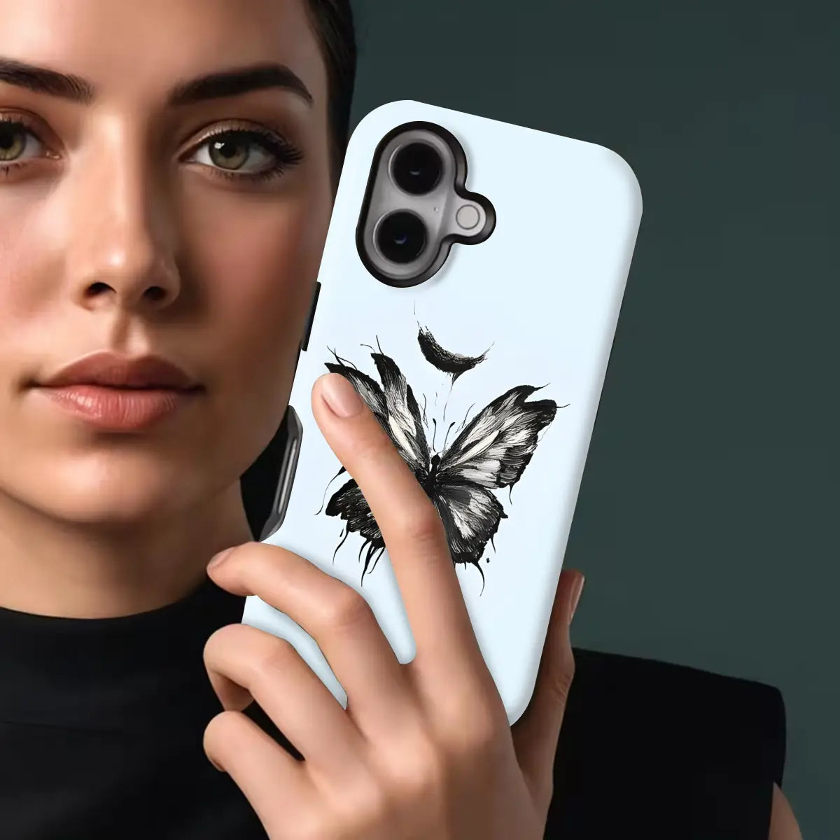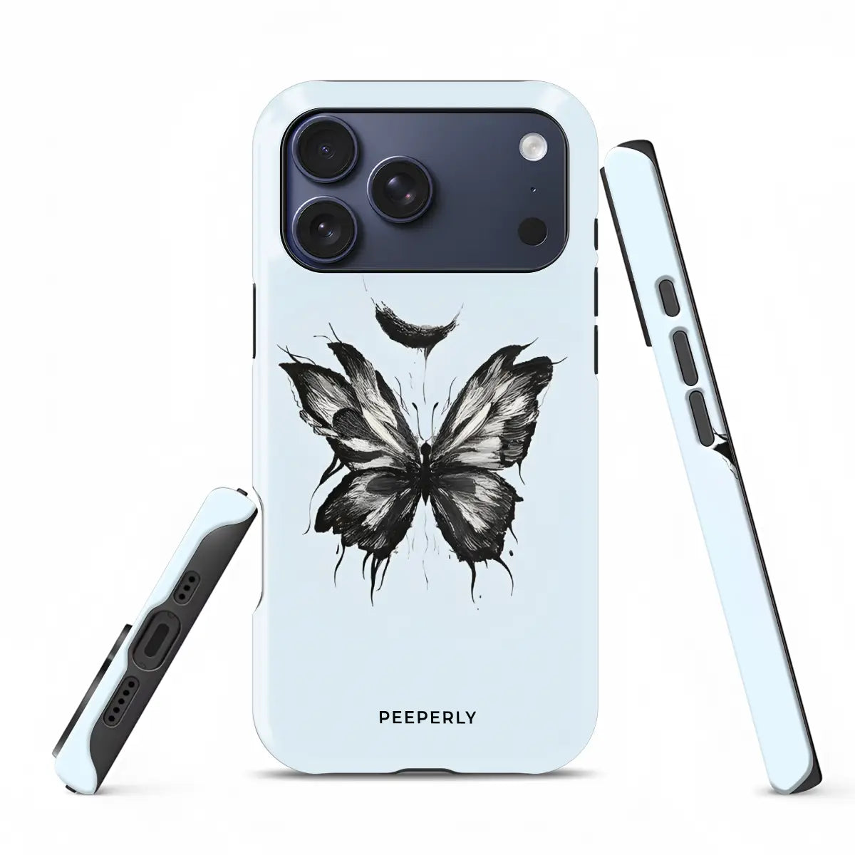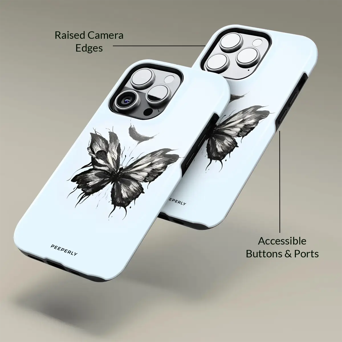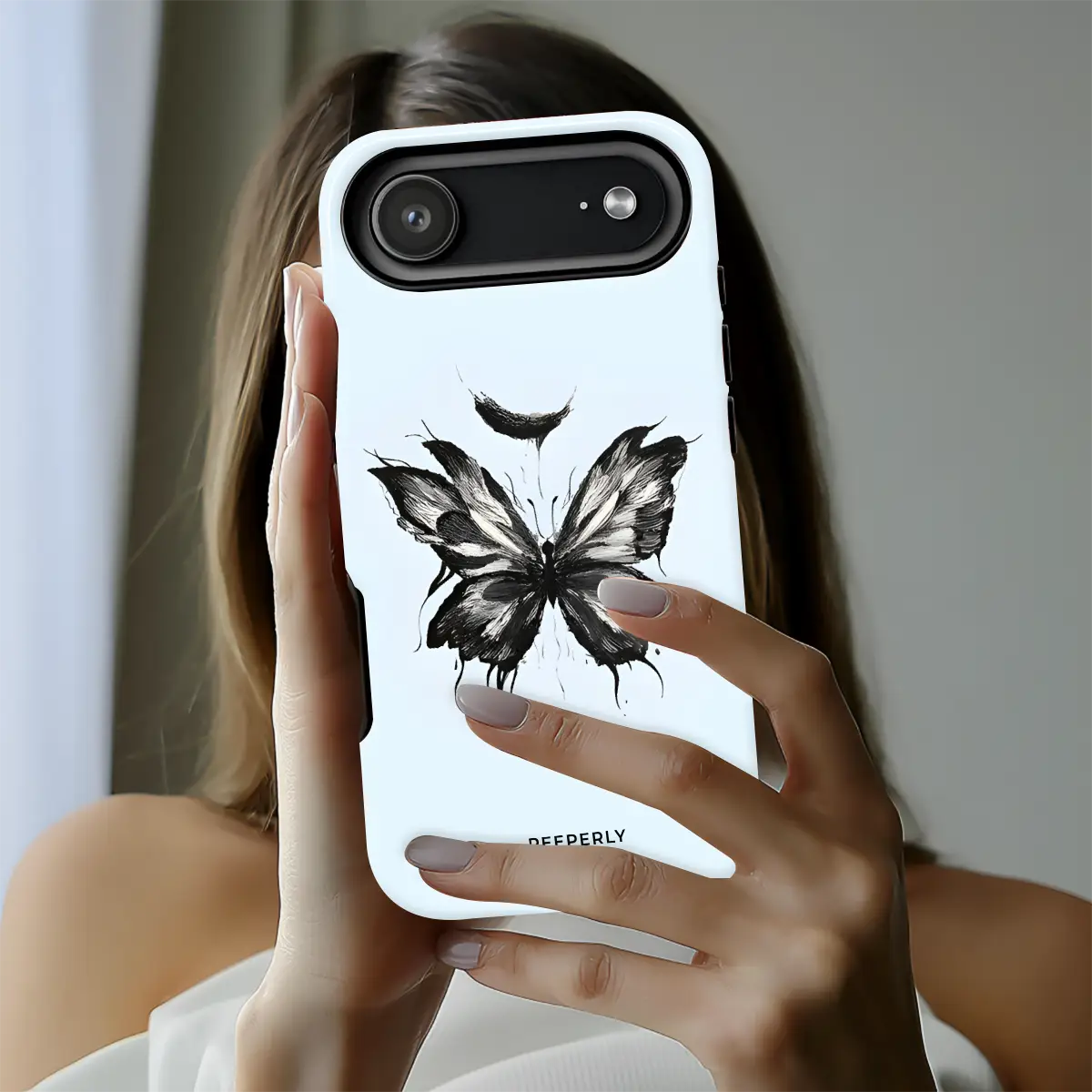 Inkwing centers on a hand-rendered black butterfly, its wings formed from fluid ink strokes that feel raw, delicate, and alive. Set against a soft, pale background, the contrast highlights every drip and feathered edge, giving the design a sense of motion frozen in time.