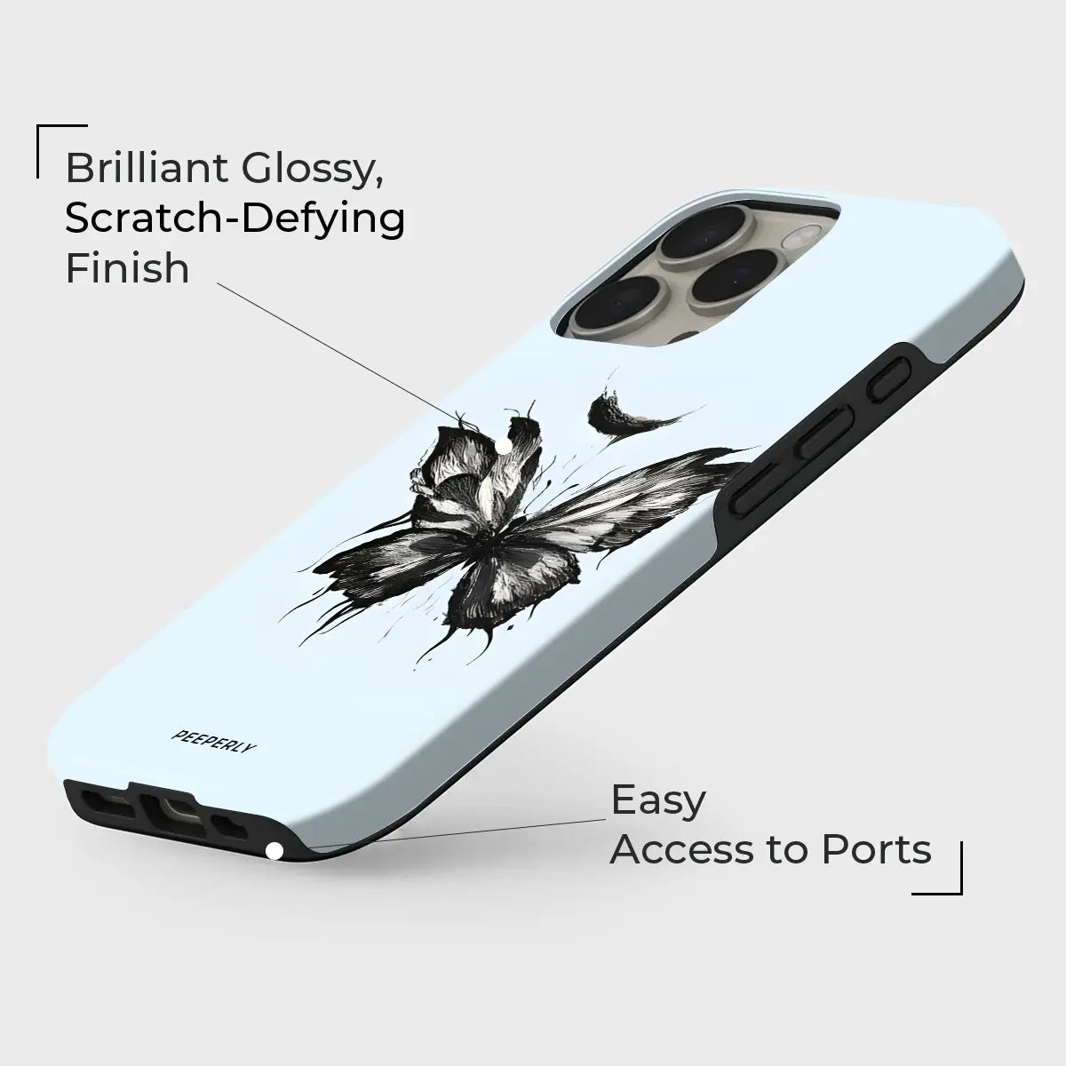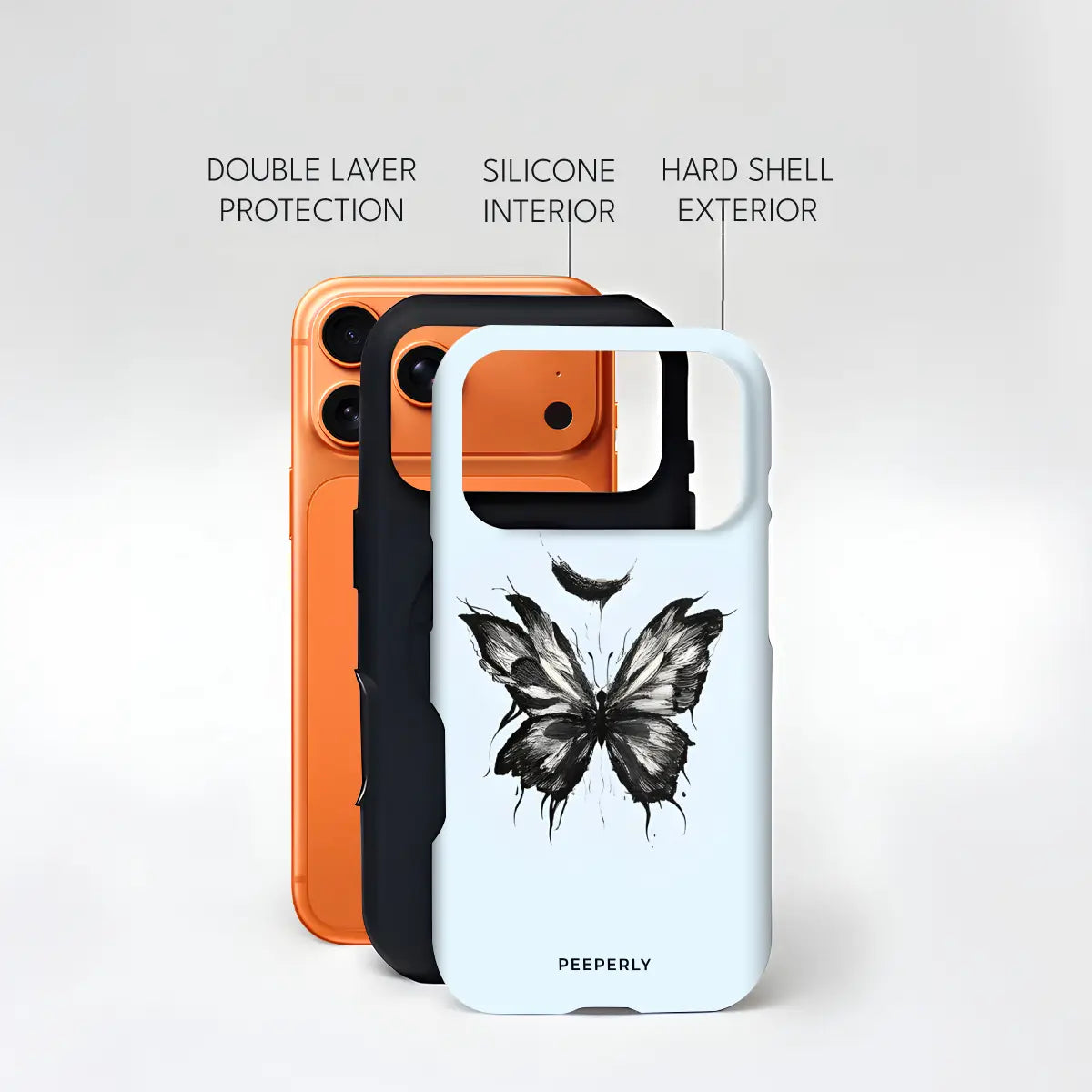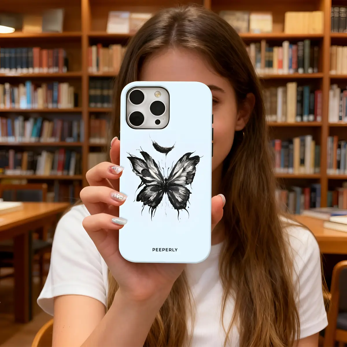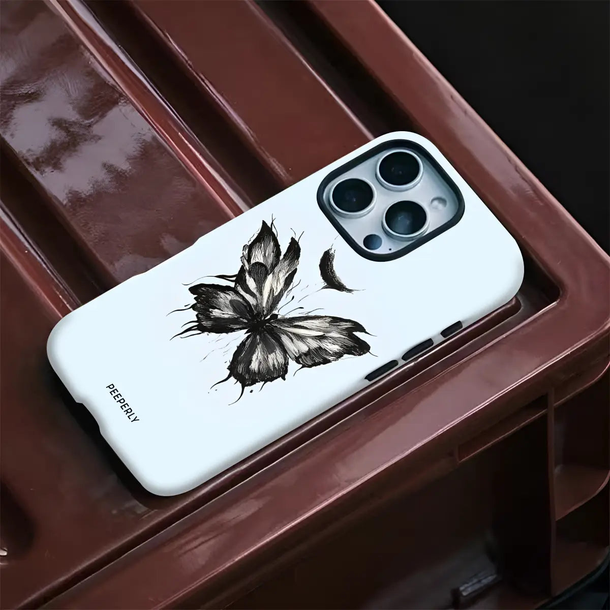 Inkwing centers on a hand-rendered black butterfly, its wings formed from fluid ink strokes that feel raw, delicate, and alive. Set against a soft, pale background, the contrast highlights every drip and feathered edge, giving the design a sense of motion frozen in time.