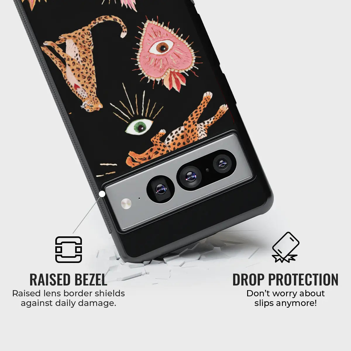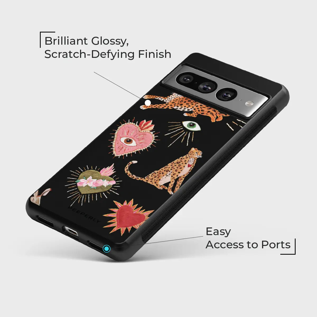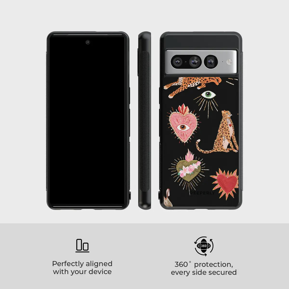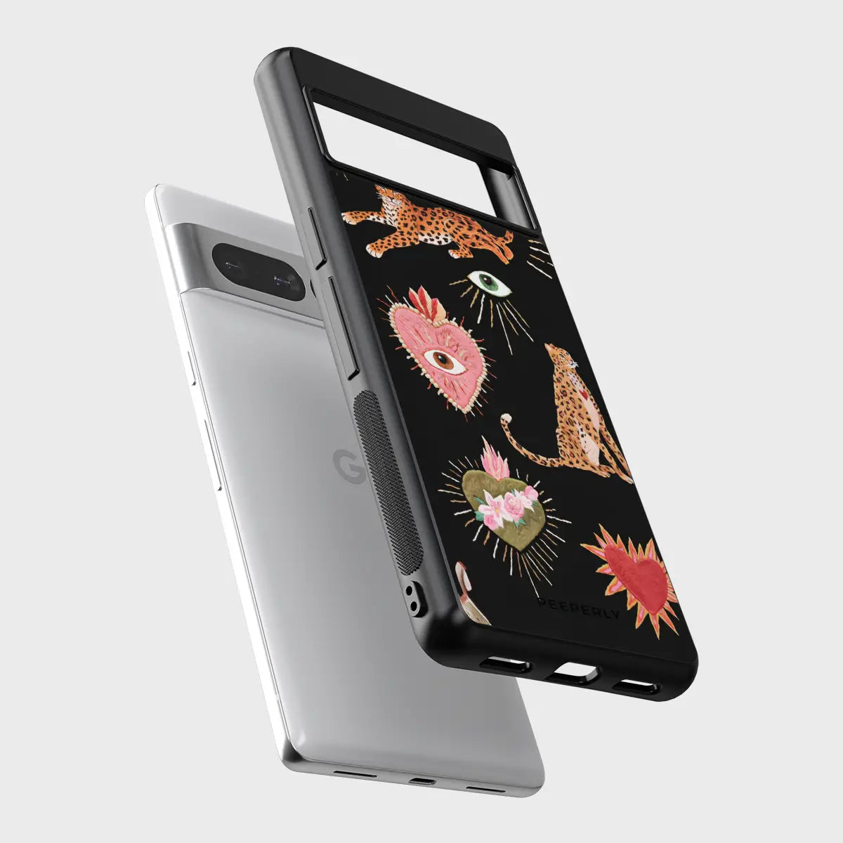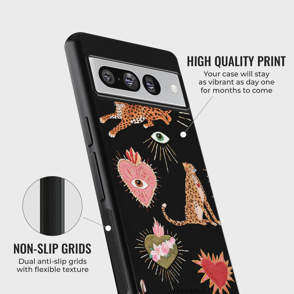 Leopard Oracle is a bold, mystical phone case design featuring powerful symbols—sacred hearts, celestial eyes, and a poised leopard—set against a deep black backdrop. Blending spiritual iconography with wild energy, it evokes intuition, strength, and ancient magic.