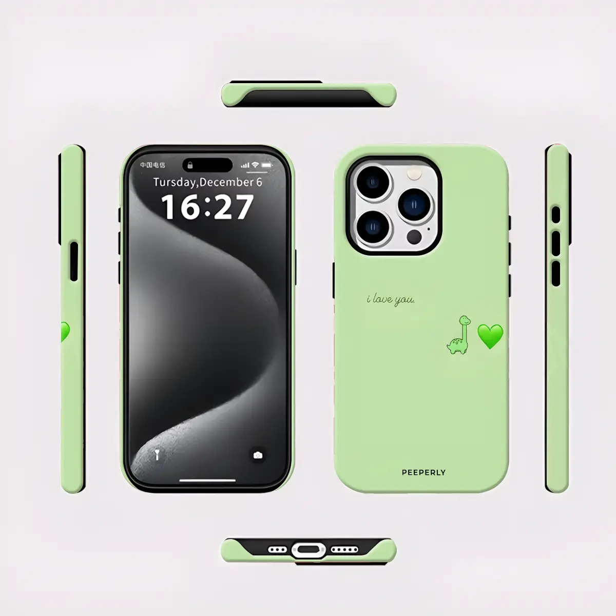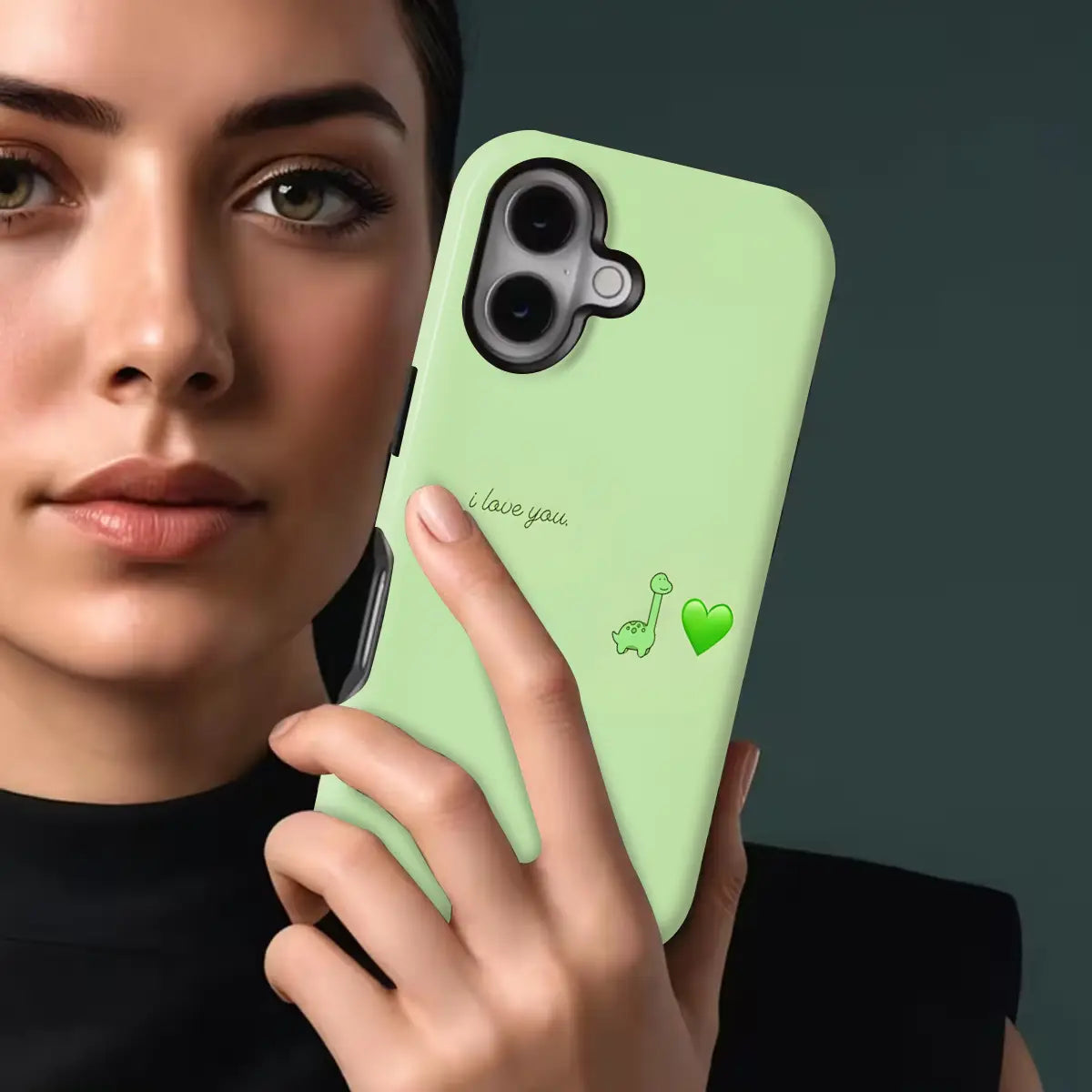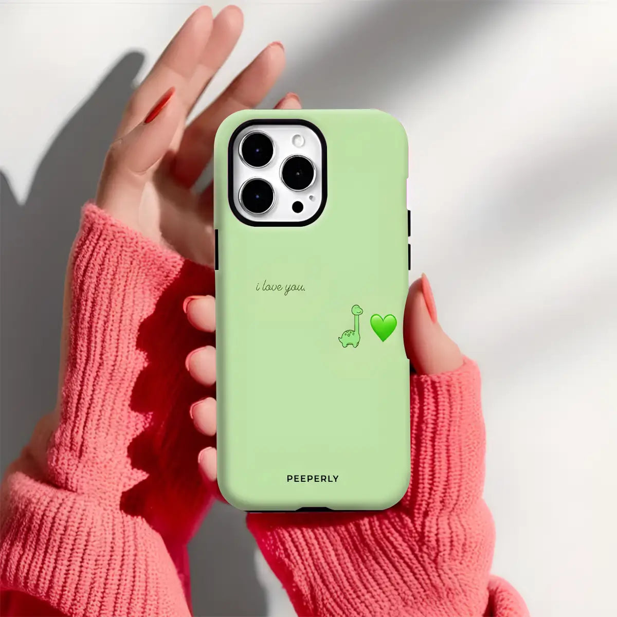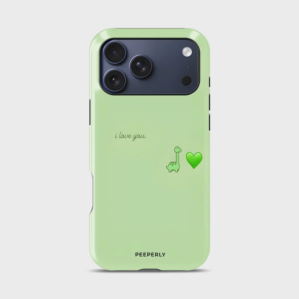 Love You, Dino features a tiny green dinosaur paired with a simple heart and a gentle handwritten message. Set against a calm pastel green background, the design feels light, cozy, and quietly affectionate—like a little love note you can carry with you.
