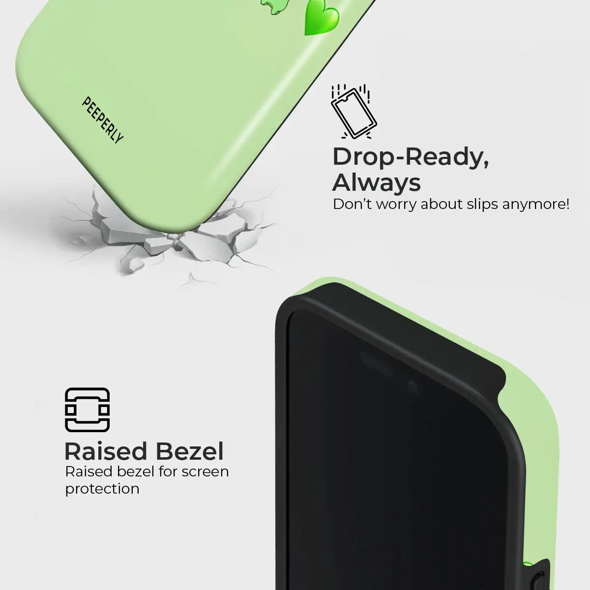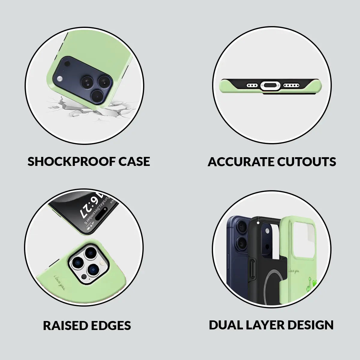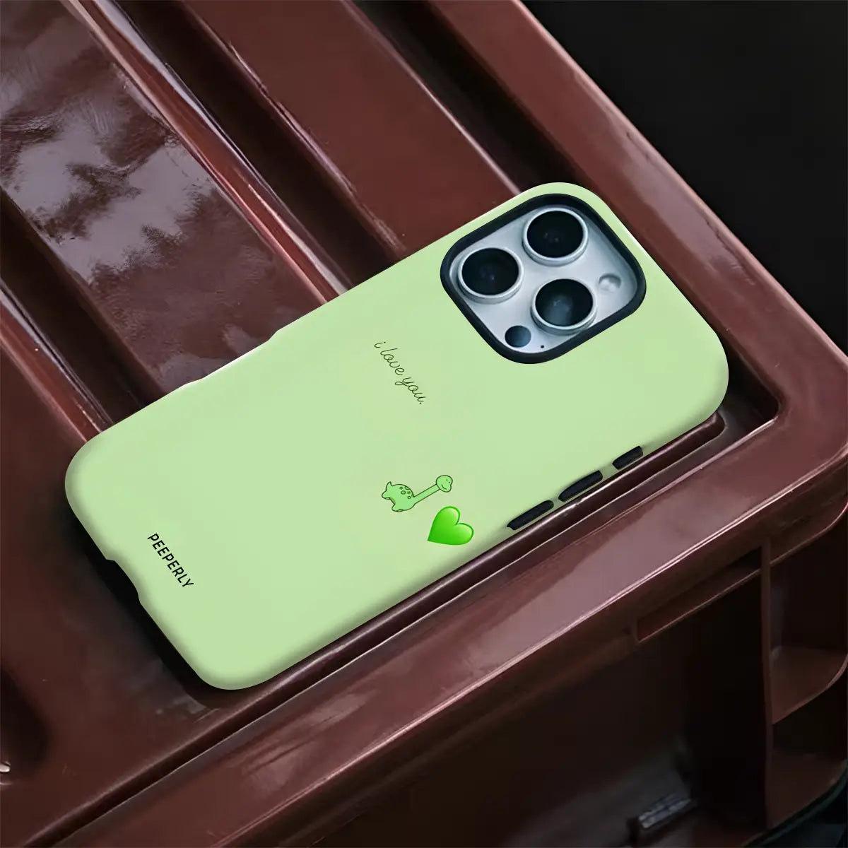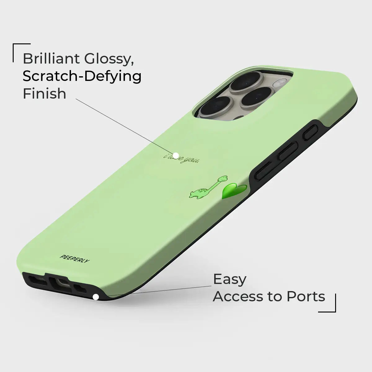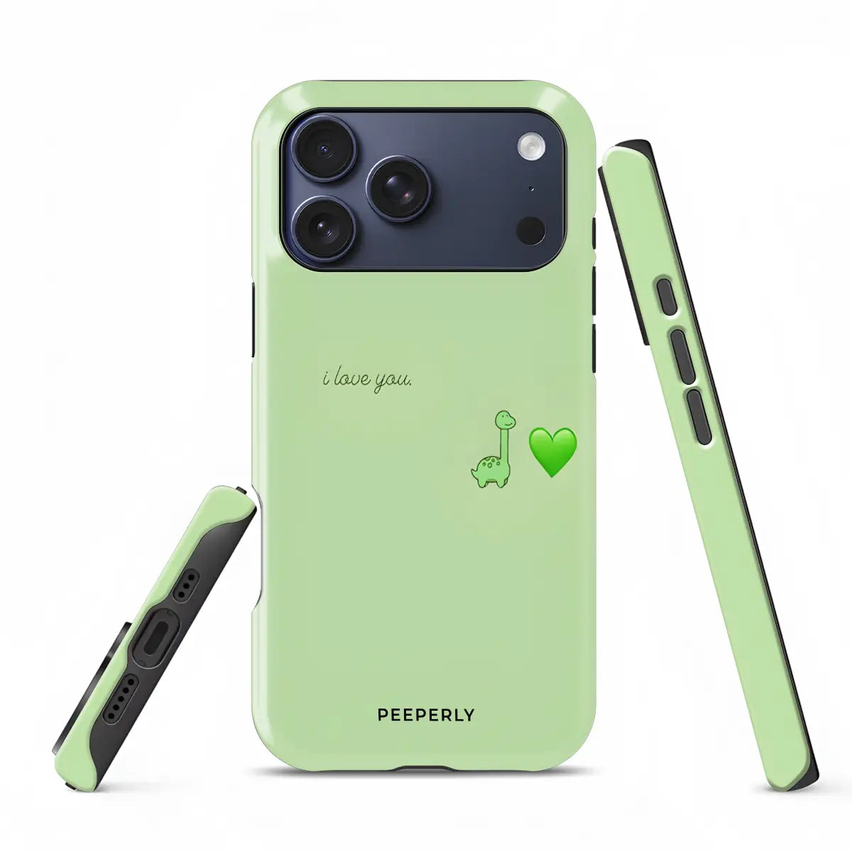 Love You, Dino features a tiny green dinosaur paired with a simple heart and a gentle handwritten message. Set against a calm pastel green background, the design feels light, cozy, and quietly affectionate—like a little love note you can carry with you.