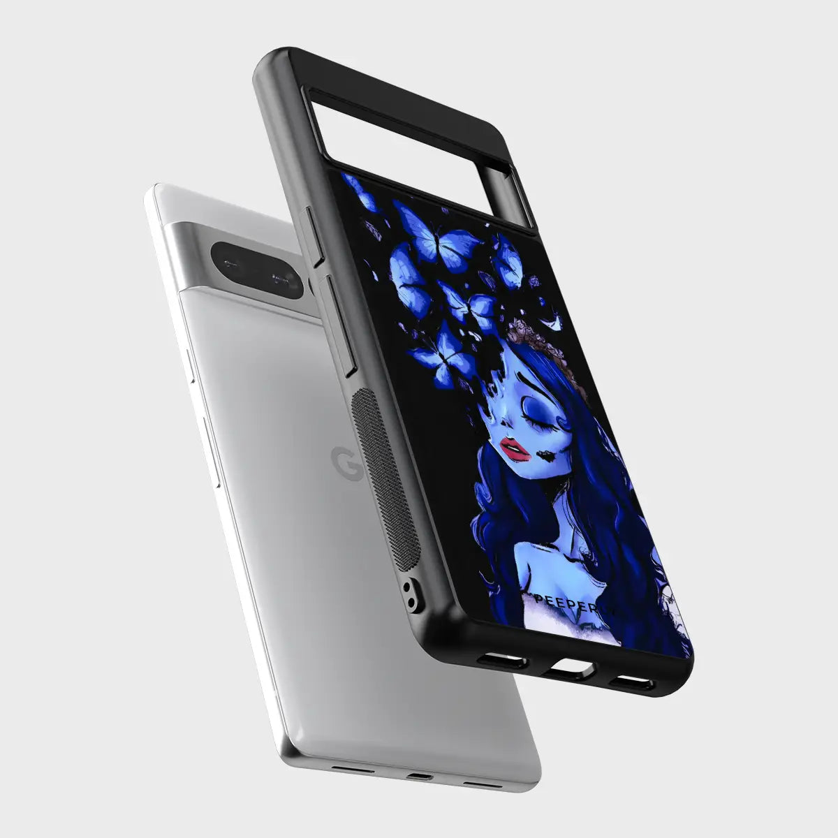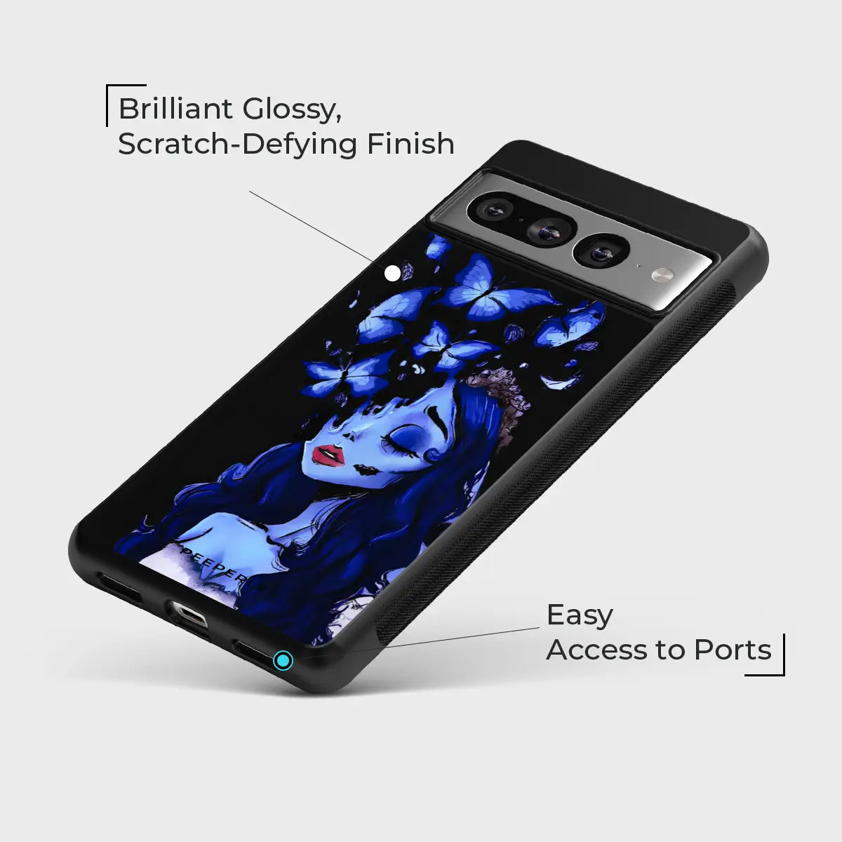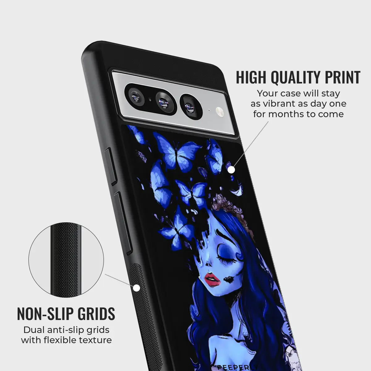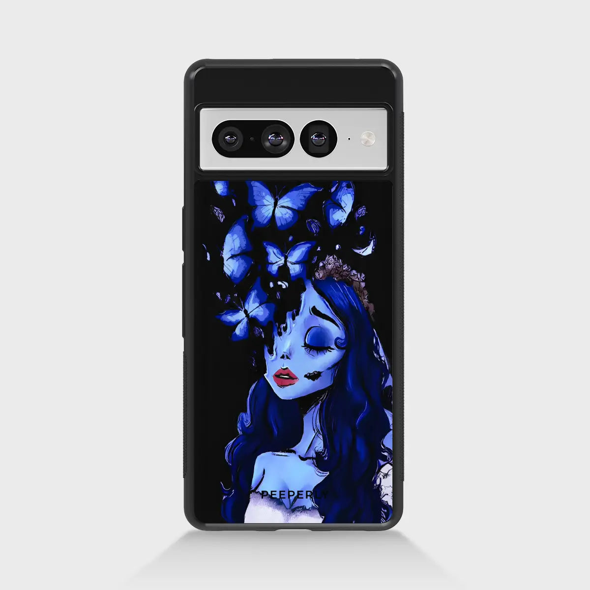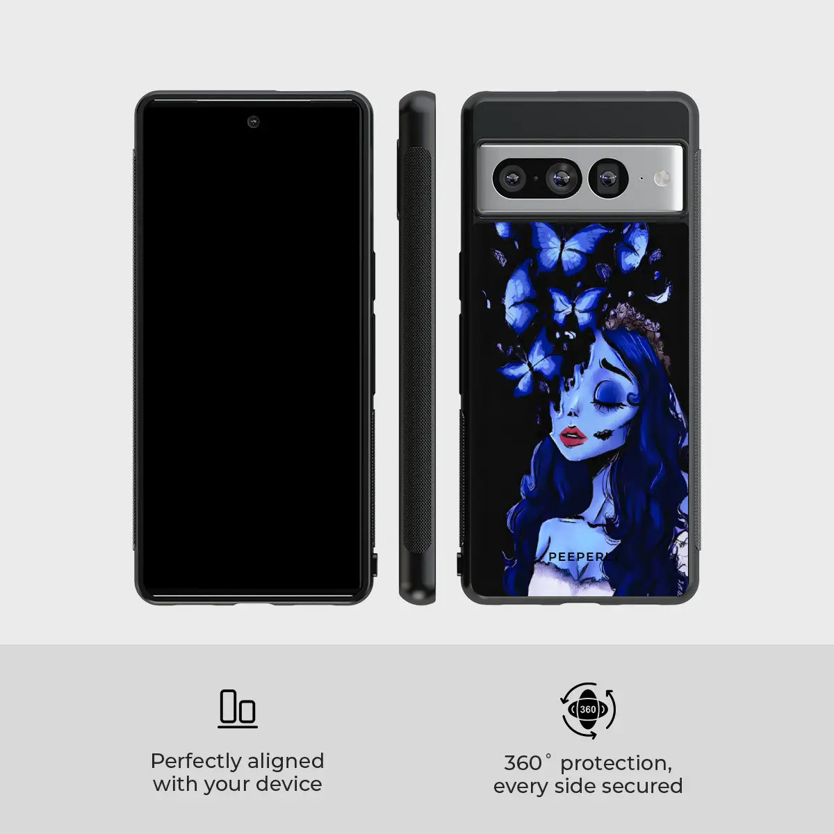 Lunar Siren is a darkly enchanting phone case design featuring an ethereal blue-toned muse adorned with fluttering butterflies against a deep black backdrop. Mysterious and alluring, it blends gothic elegance with celestial beauty, evoking moonlit dreams and quiet power.