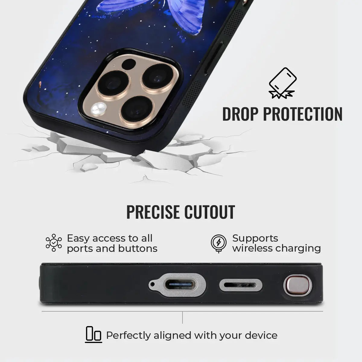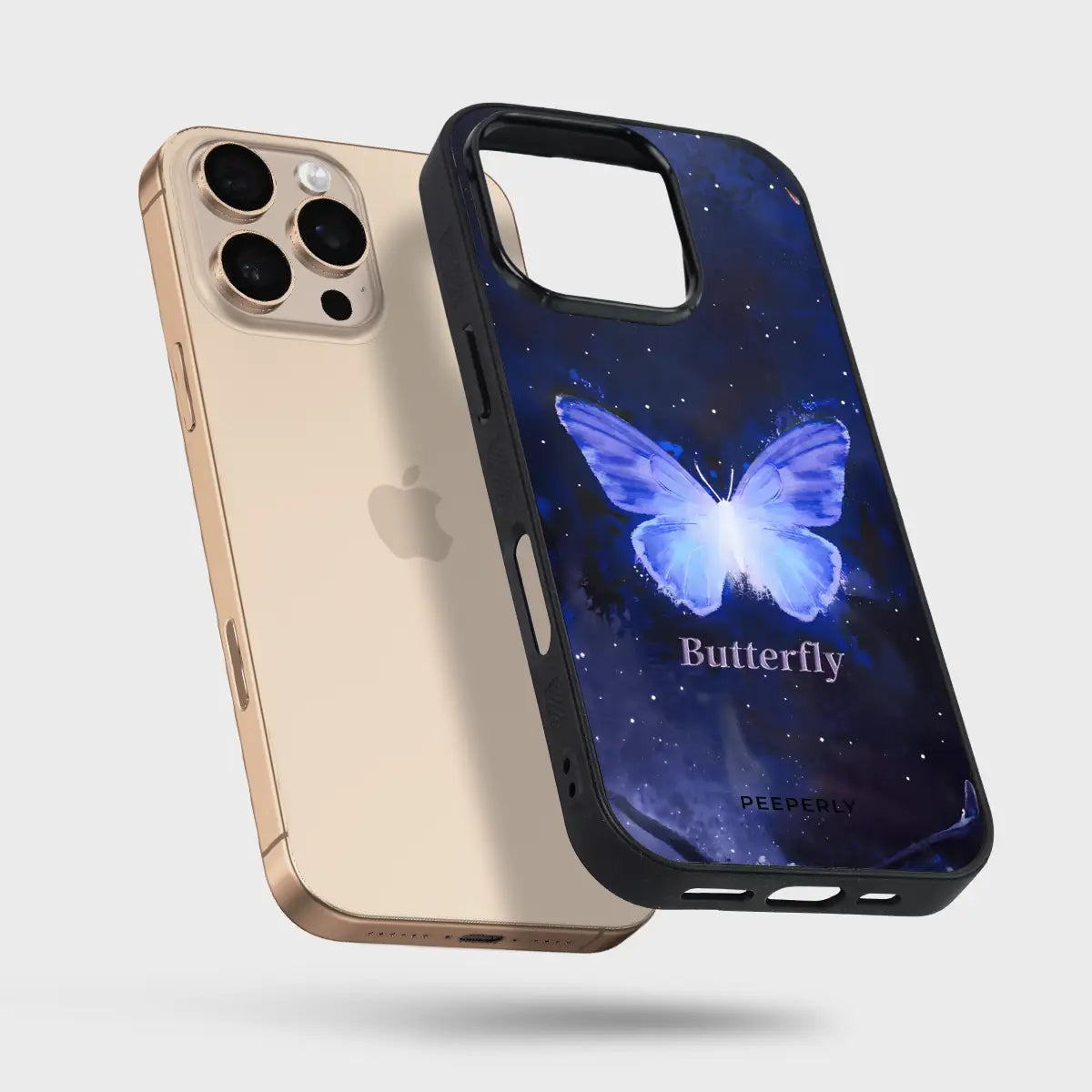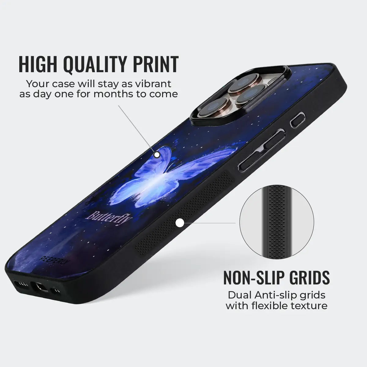 Lunar Wings is a dreamy phone case design featuring a glowing blue butterfly set against a deep, star-filled night sky. Inspired by moonlight and quiet cosmic beauty, it captures a sense of mystery, transformation, and calm elegance.