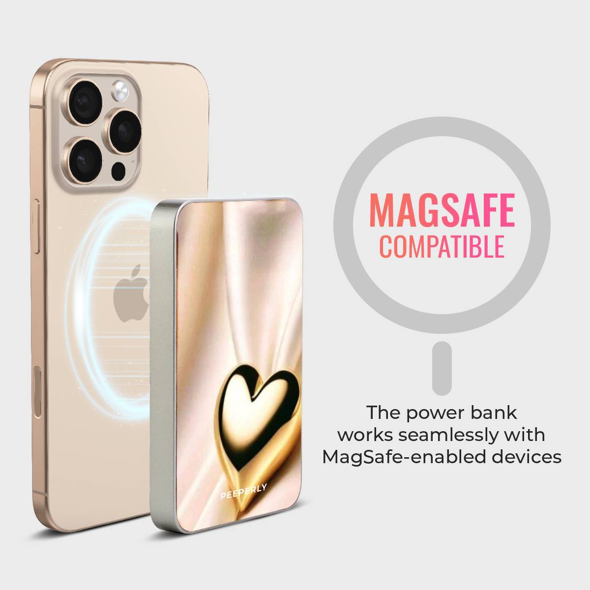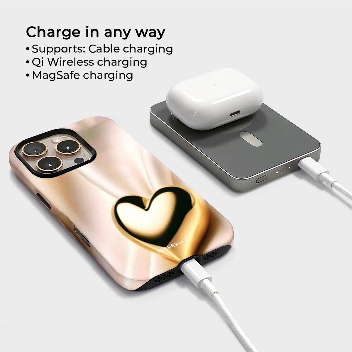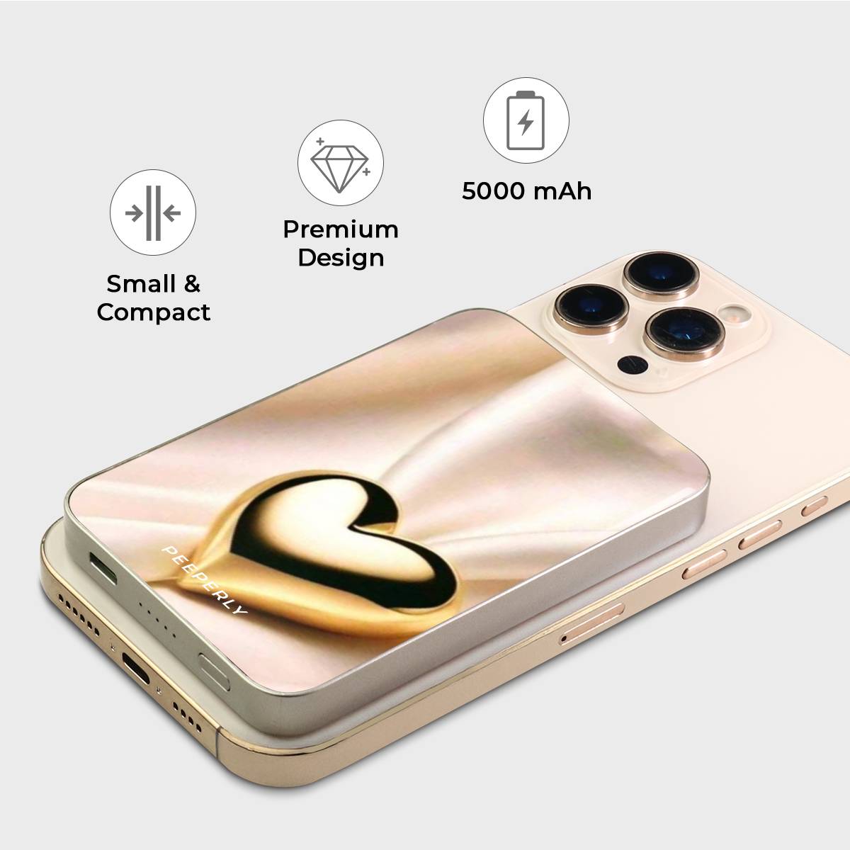 The Luxe Affection Magnetic Power Bank features a radiant gold heart set against a silky, light-reflecting backdrop, creating a look that feels warm, elegant, and undeniably luxe. Minimal yet striking, this design brings a sense of romance and sophistication to your everyday tech.