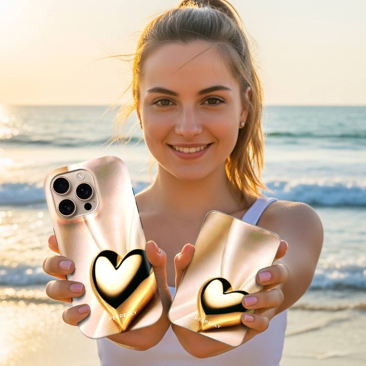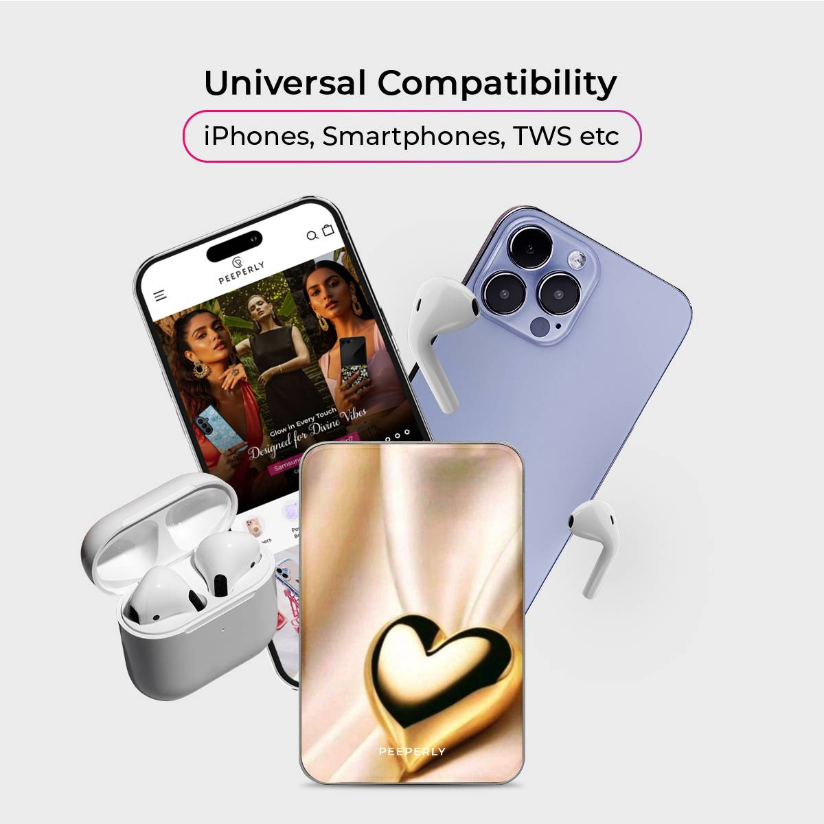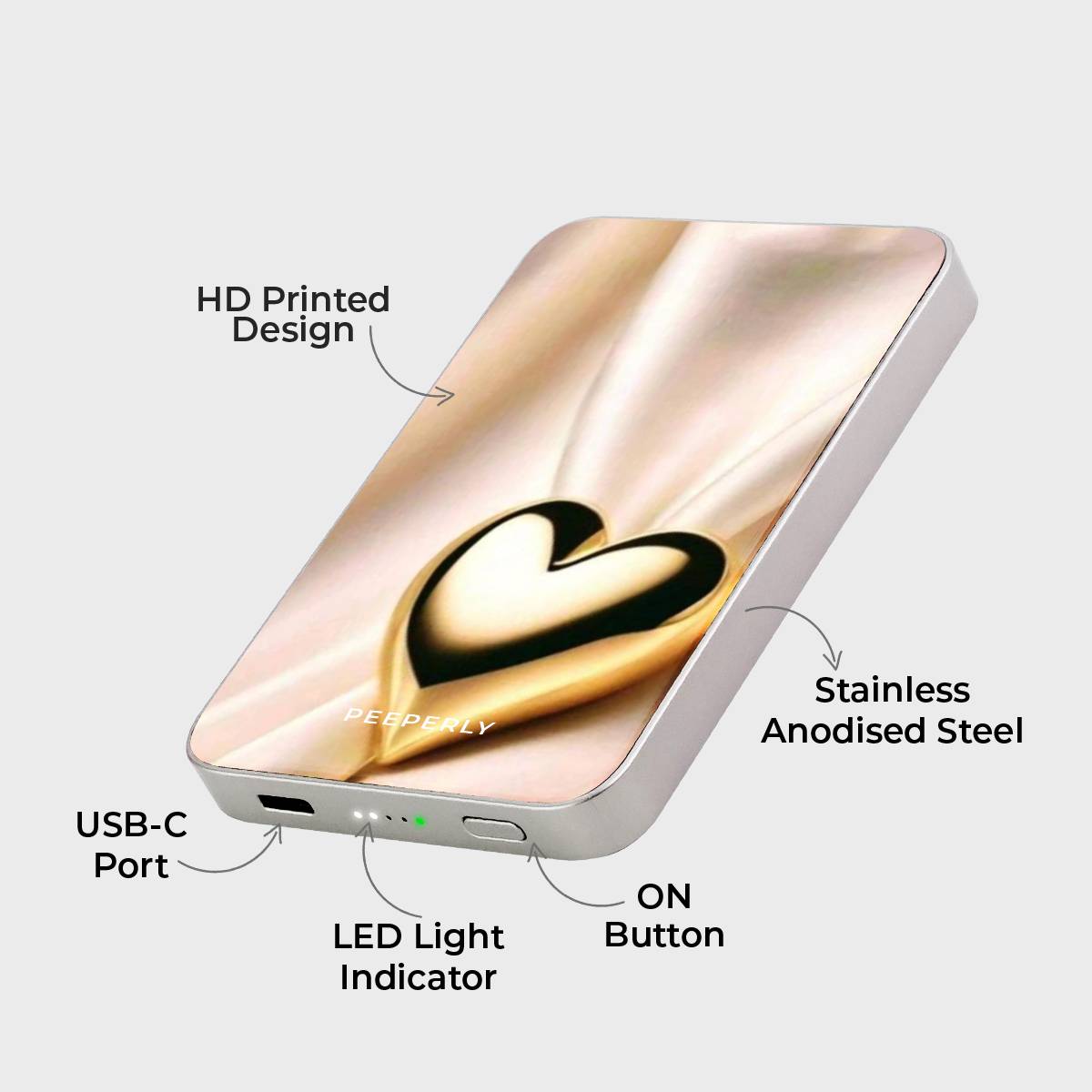 The Luxe Affection Magnetic Power Bank features a radiant gold heart set against a silky, light-reflecting backdrop, creating a look that feels warm, elegant, and undeniably luxe. Minimal yet striking, this design brings a sense of romance and sophistication to your everyday tech.