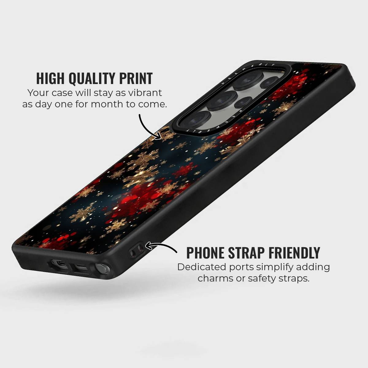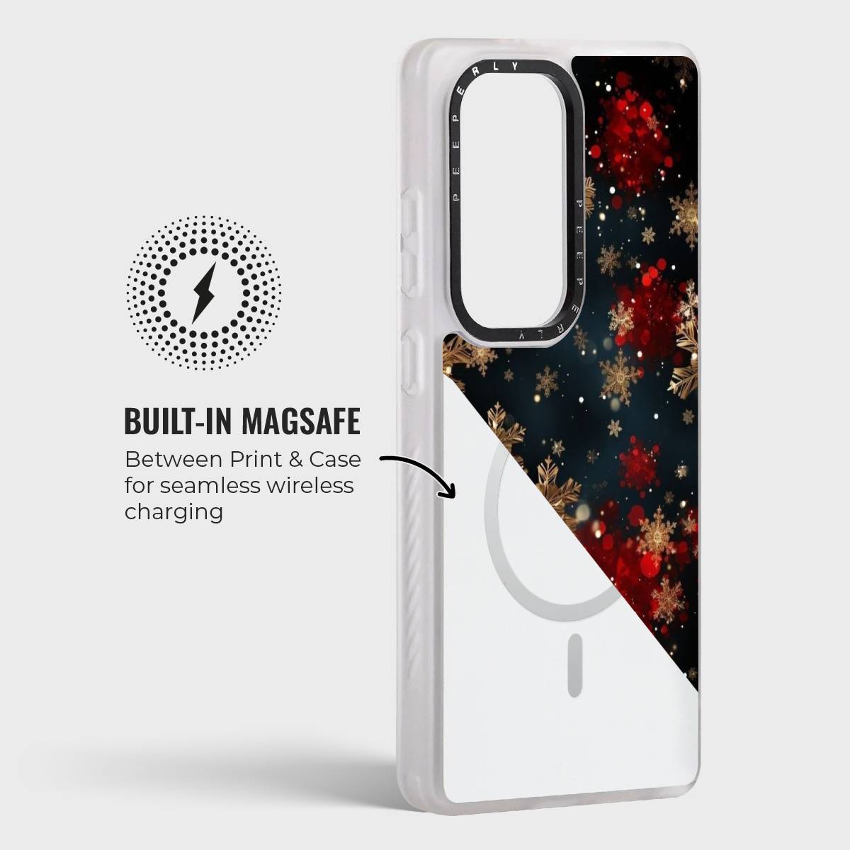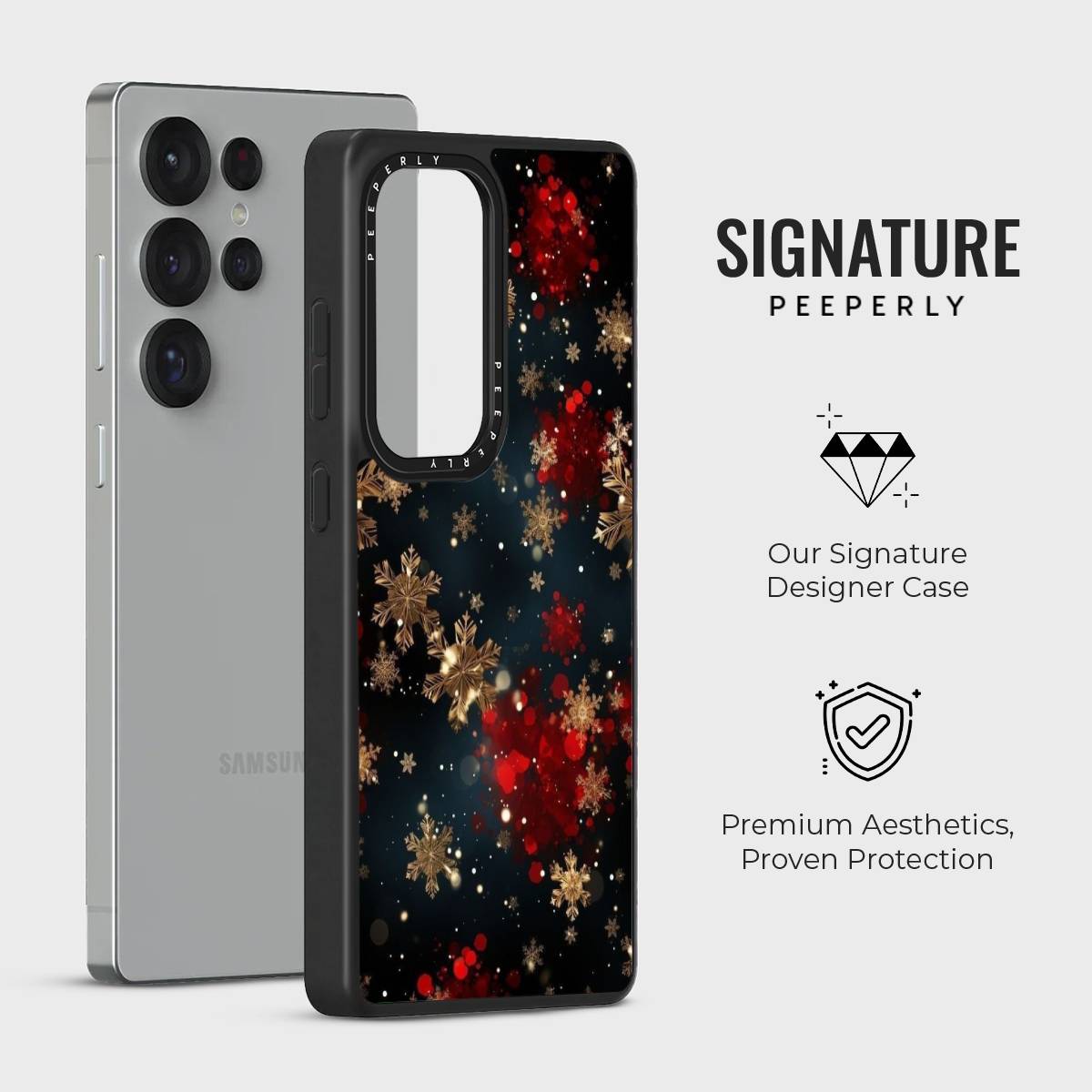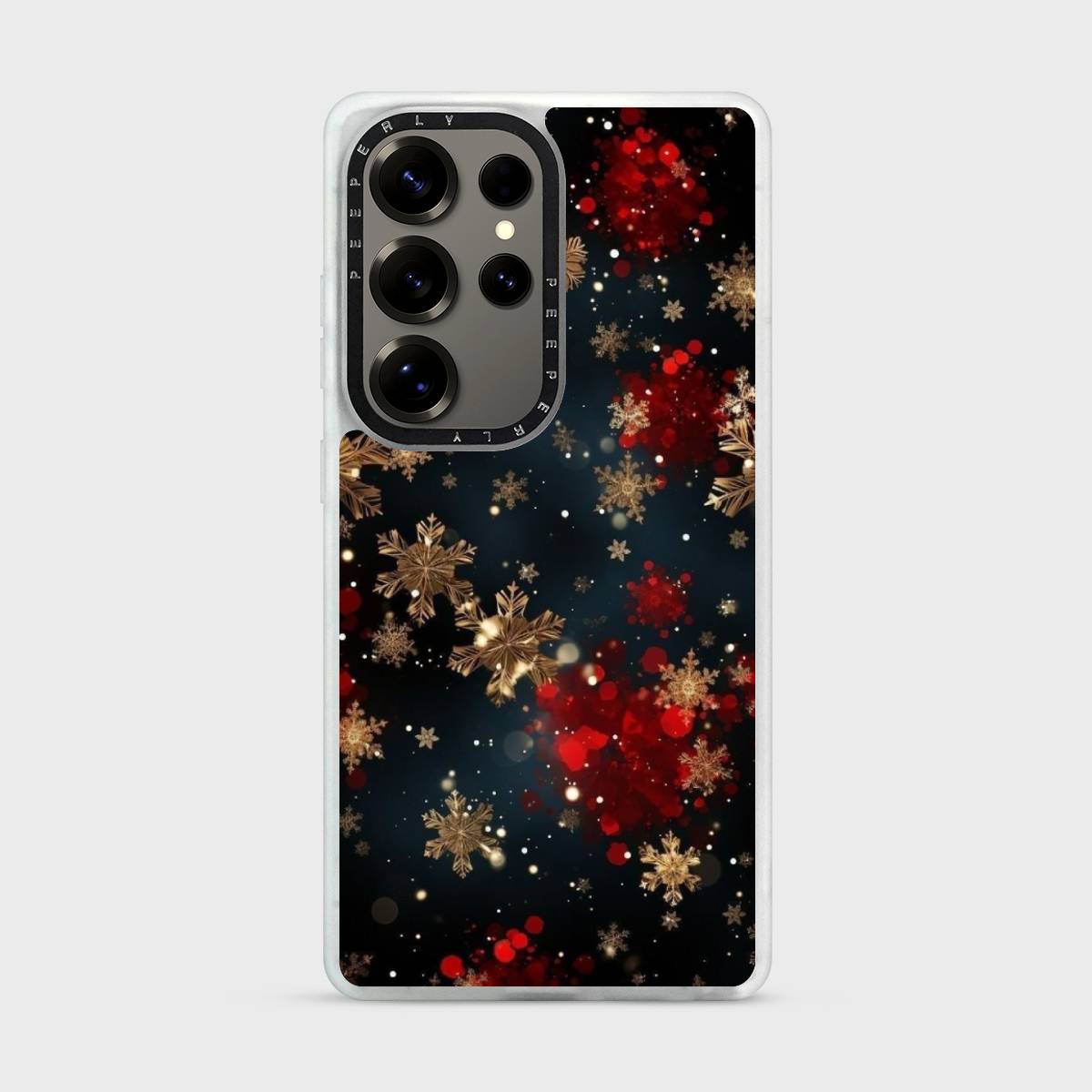 Midnight Snowfall captures the quiet magic of winter nights—golden snowflakes drifting through a deep, inky darkness, accented by warm crimson glows. It evokes elegance, mystery, and festive charm, blending luxury with the serene beauty of a snowfall under moonlit skies.