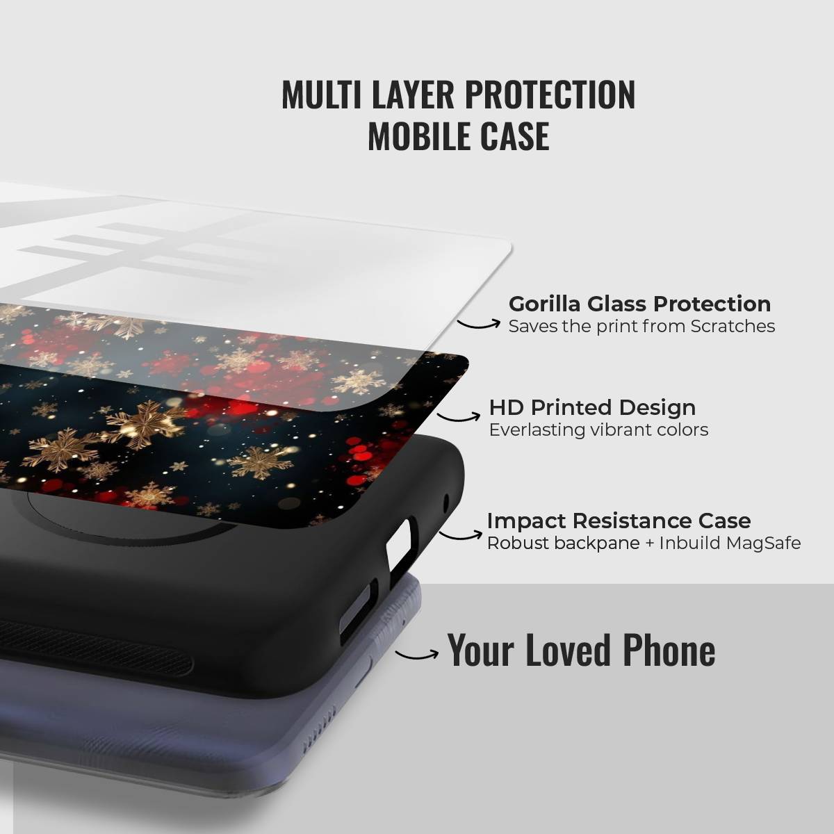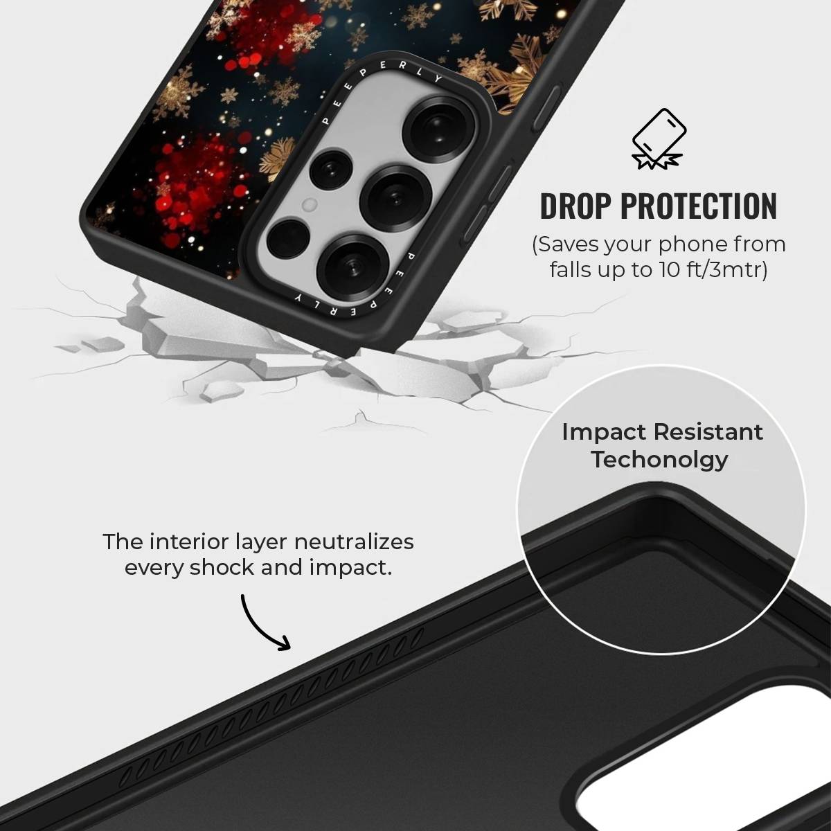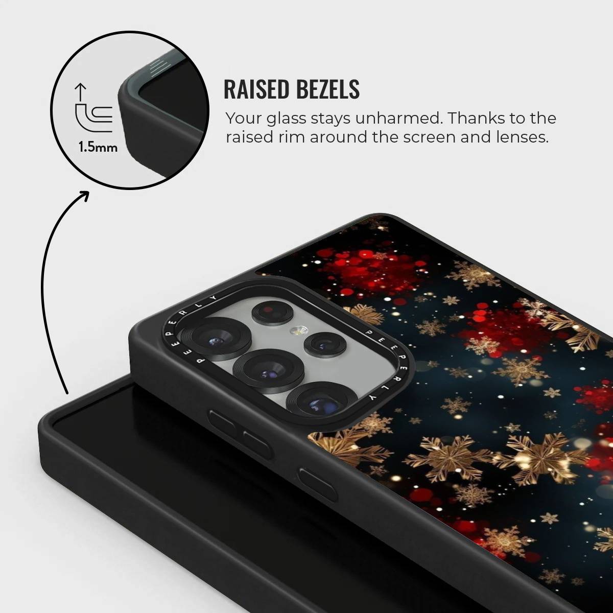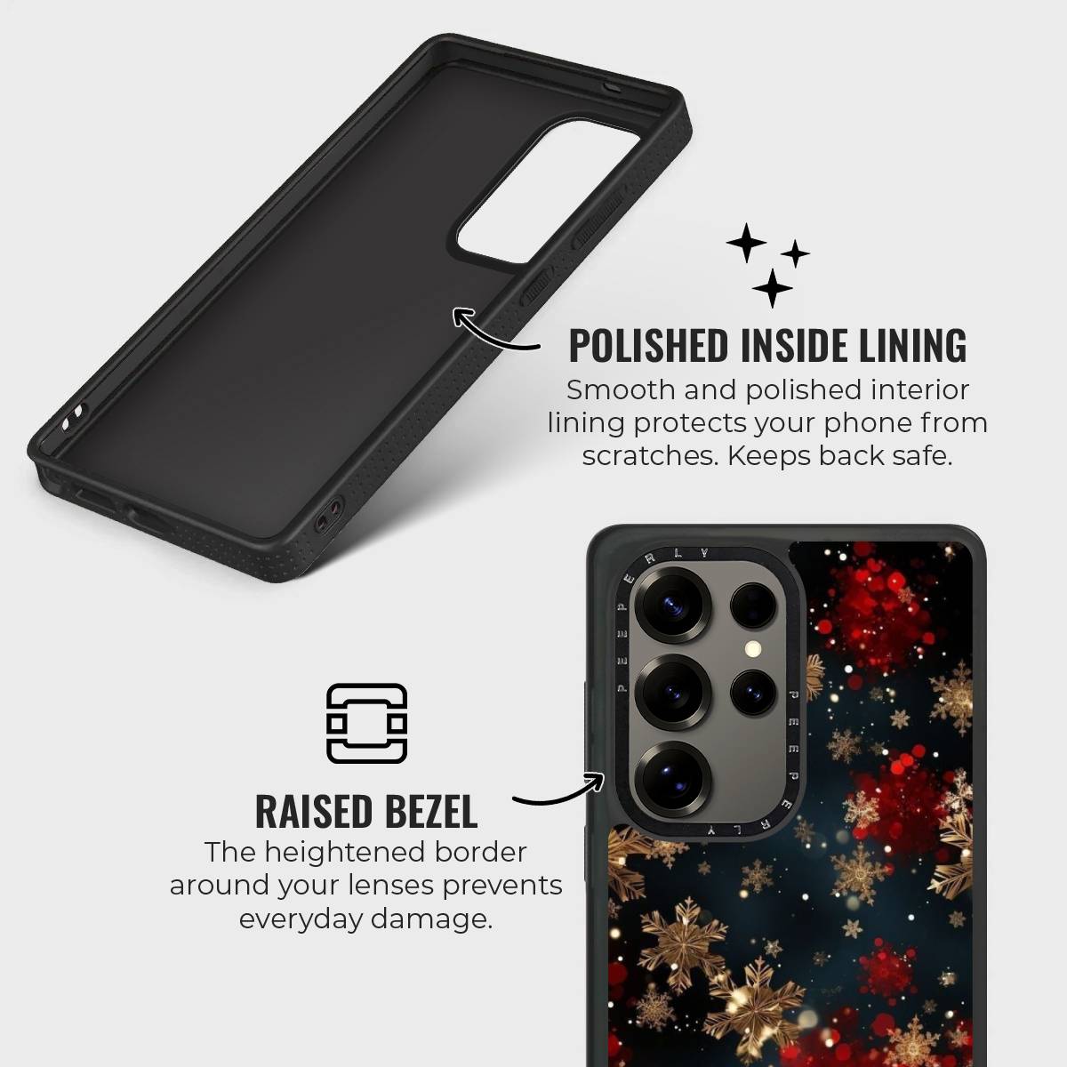 Midnight Snowfall captures the quiet magic of winter nights—golden snowflakes drifting through a deep, inky darkness, accented by warm crimson glows. It evokes elegance, mystery, and festive charm, blending luxury with the serene beauty of a snowfall under moonlit skies.