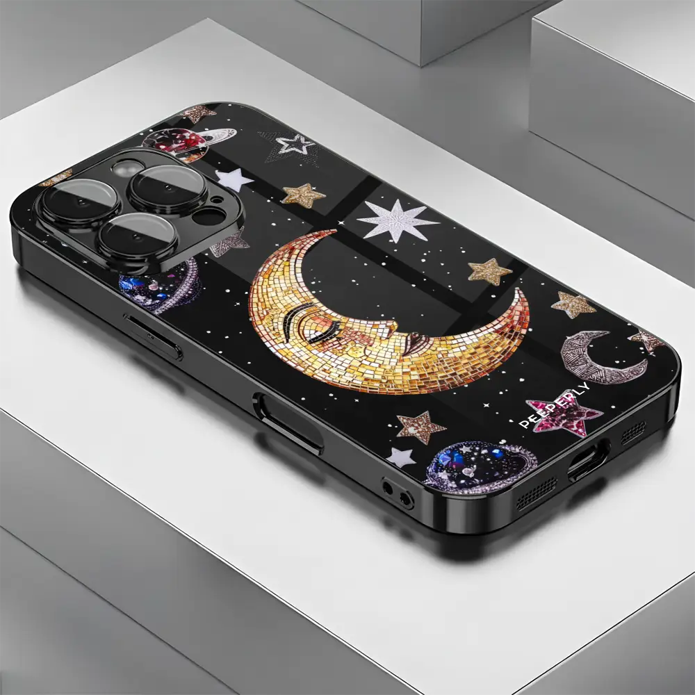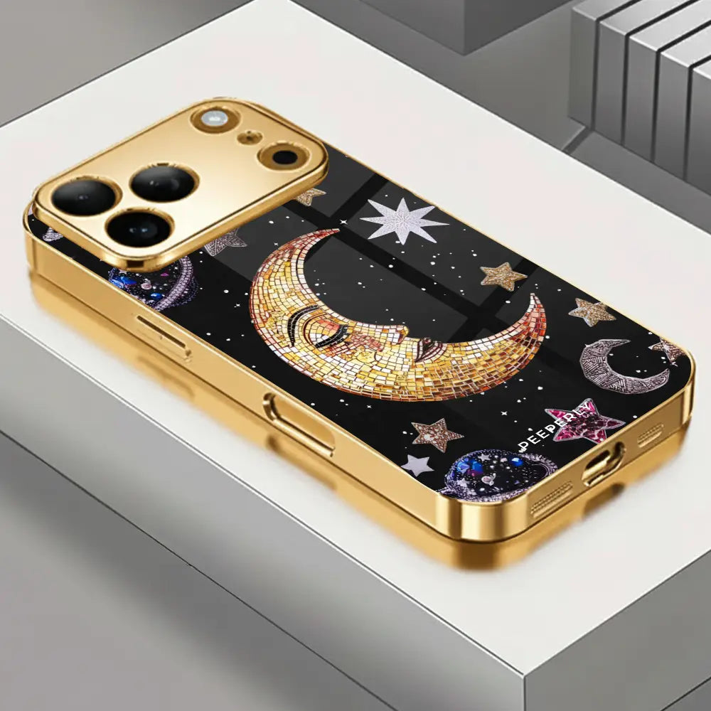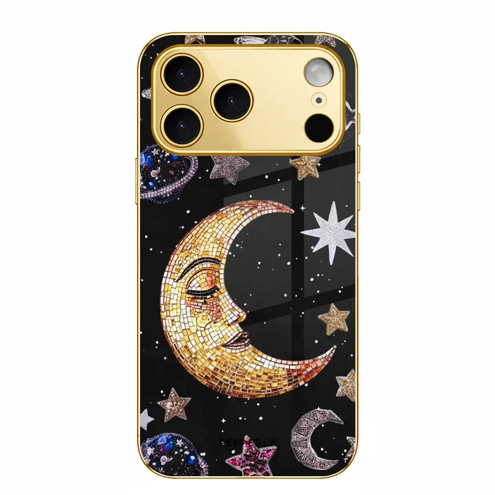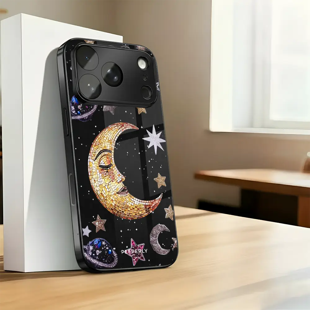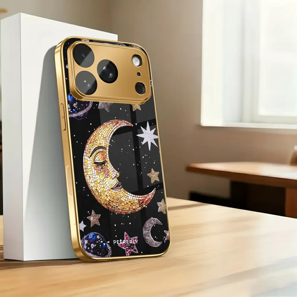 Moon Mosaic is a captivating phone case design featuring a radiant golden crescent moon crafted in a mosaic style, surrounded by shimmering stars and celestial accents against a deep black sky. Rich in texture and cosmic charm, it evokes mystery, magic, and timeless beauty.