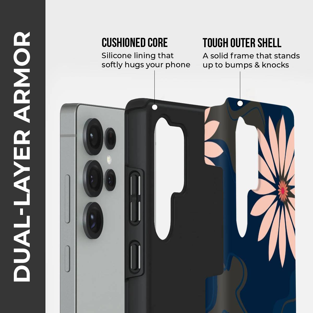 Elevate your phone’s look with the Navy Petals Art Case, a perfect blend of elegance and modern design. Set against a deep navy background, the soft blush-pink floral patterns create a striking contrast that feels both chic and timeless. Subtle abstract accents add an artistic flair, making this case ideal for those who appreciate contemporary style with a touch of nature’s charm.