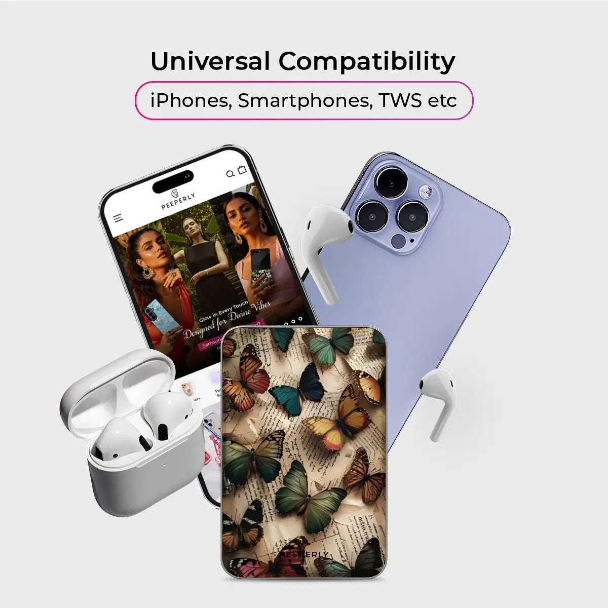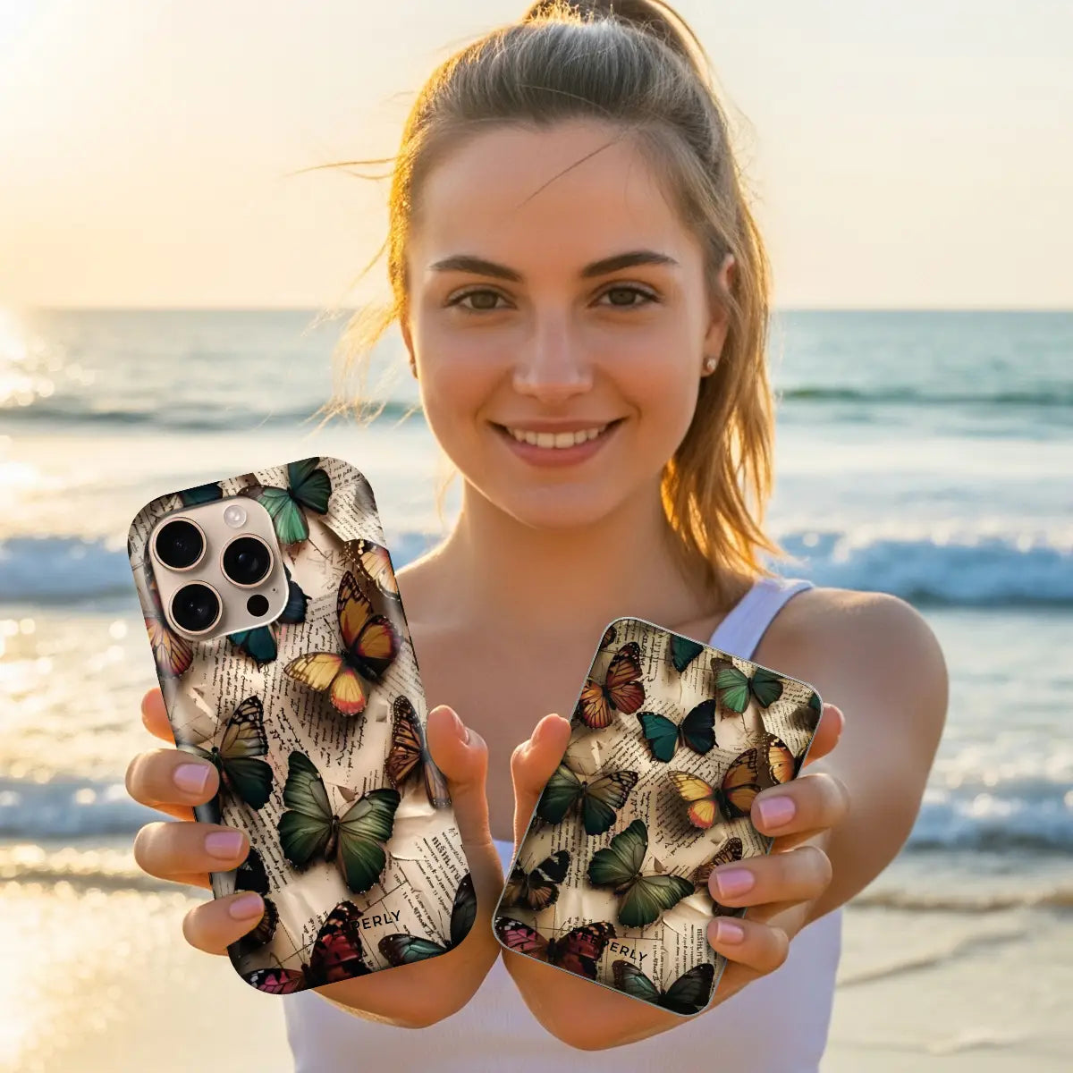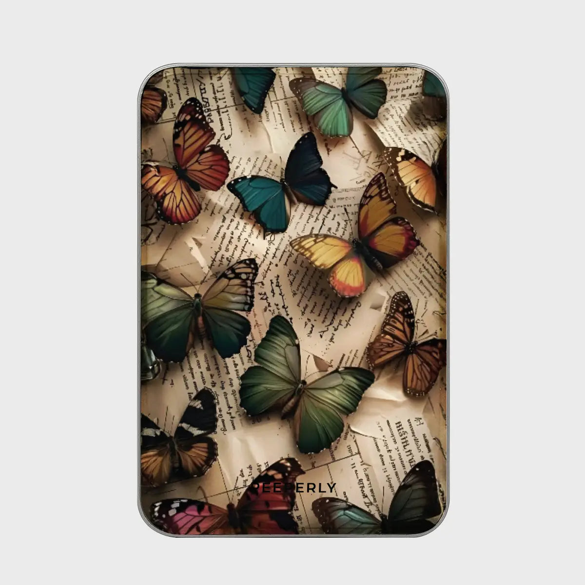 Delicate, vintage, and full of charm. Papillon Whispers showcases a graceful arrangement of richly colored butterflies resting over soft parchment script, creating a timeless, romantic aesthetic. The blend of earthy tones, muted greens, warm ambers, and subtle pinks gives the design a nostalgic yet elegant feel.
