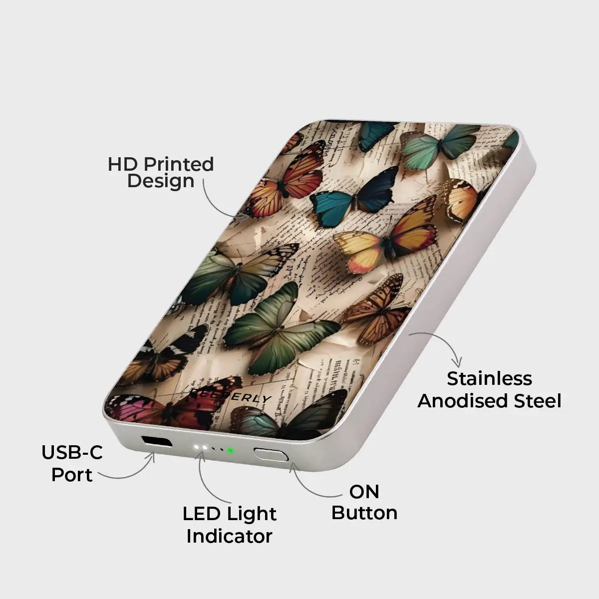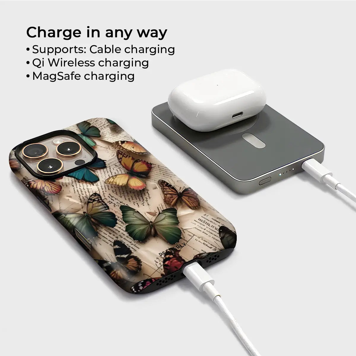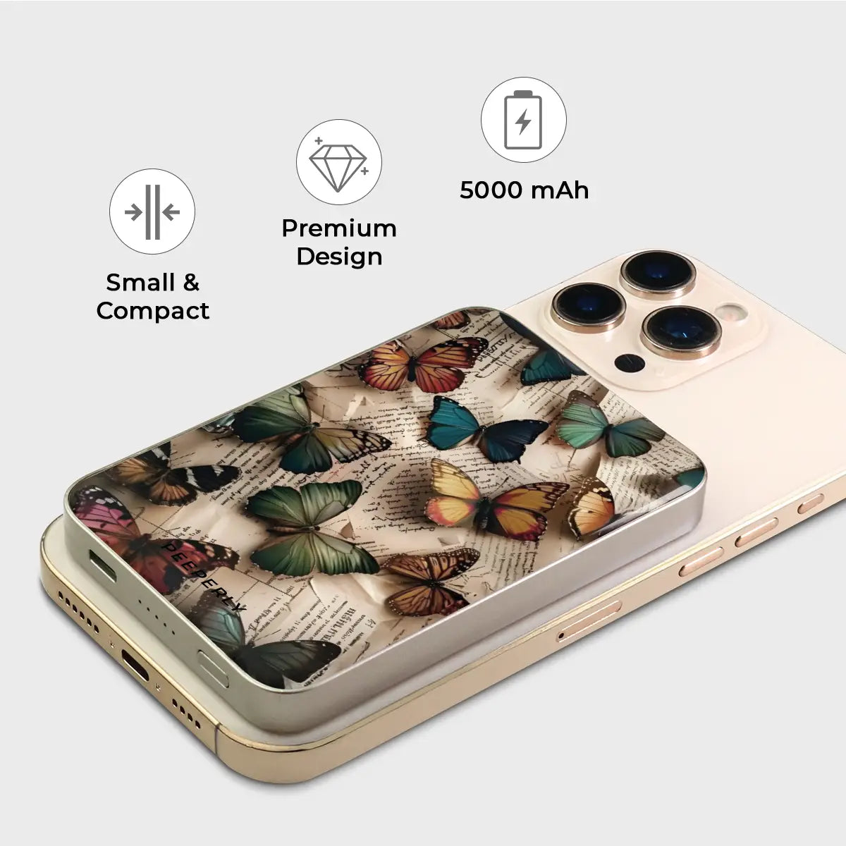 Delicate, vintage, and full of charm. Papillon Whispers showcases a graceful arrangement of richly colored butterflies resting over soft parchment script, creating a timeless, romantic aesthetic. The blend of earthy tones, muted greens, warm ambers, and subtle pinks gives the design a nostalgic yet elegant feel.