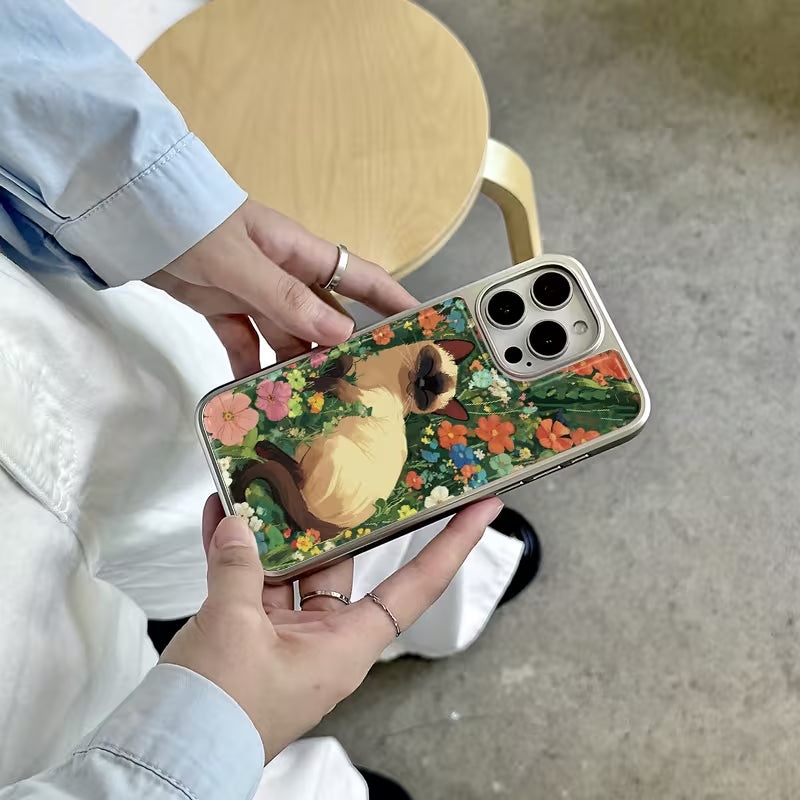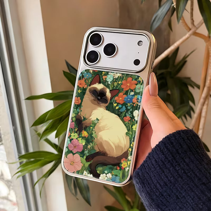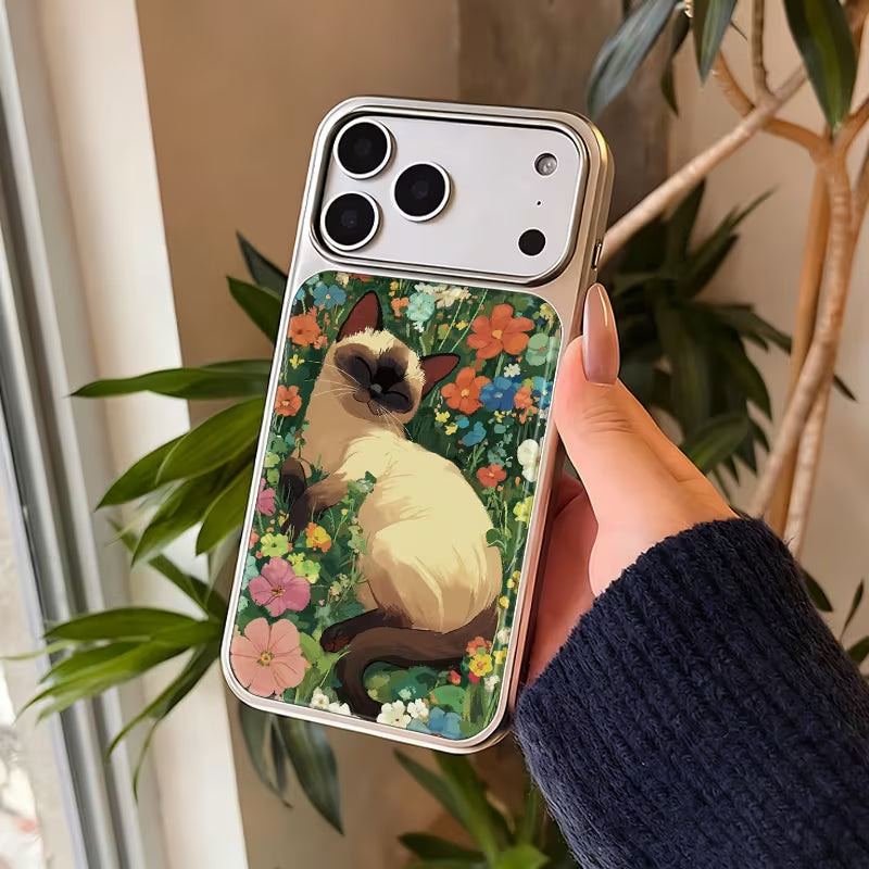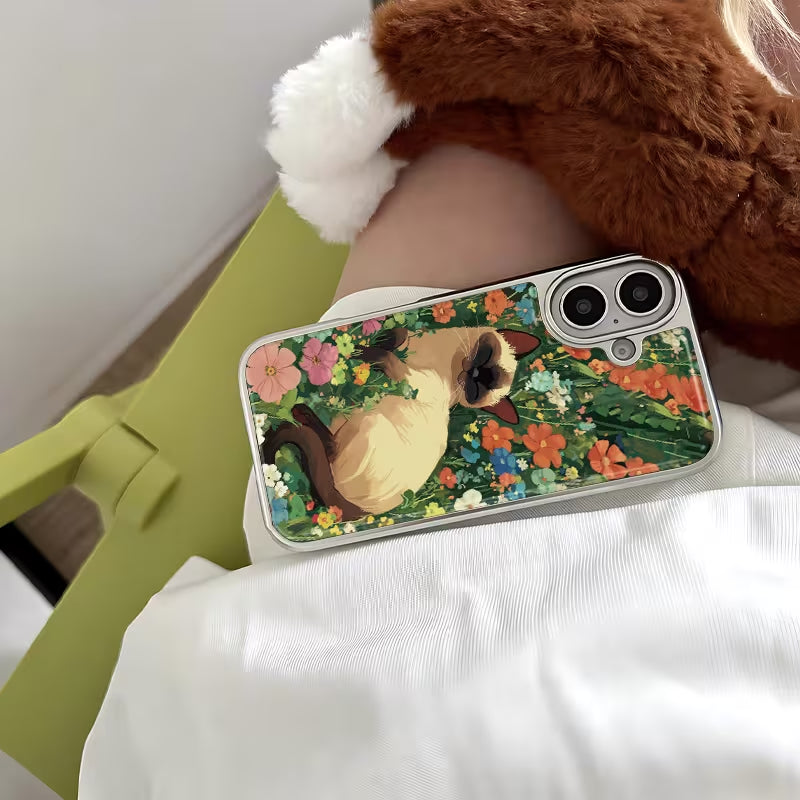 A serene and elegant design featuring a graceful cat resting among lush wildflowers, as if quietly watching over a secret garden. Soft brushstrokes and rich botanical tones create a peaceful, painterly atmosphere—capturing the harmony between nature and a gentle feline protector.