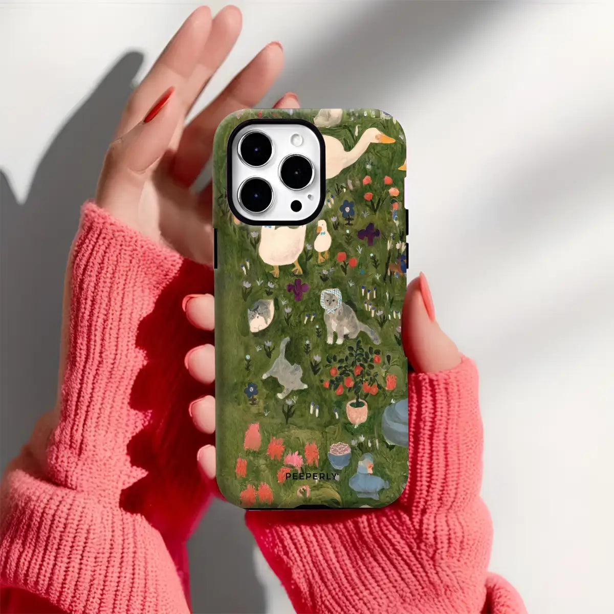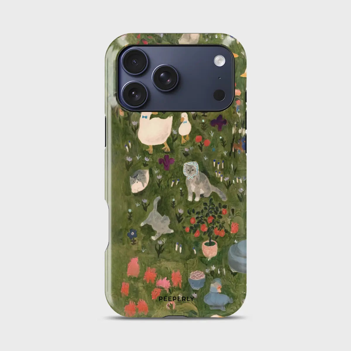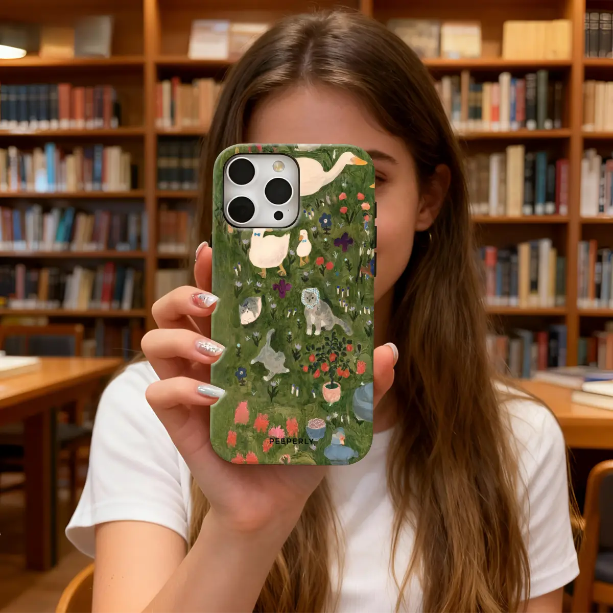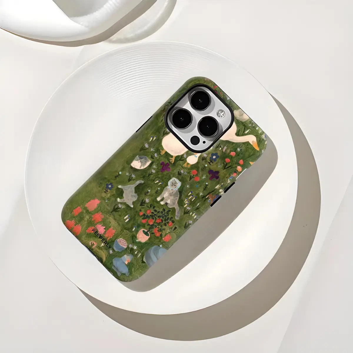 Quiet Creatures invites you into a peaceful garden where small animals wander among flowers, trees, and hidden corners. Painted in soft, earthy greens with delicate pops of color, the scene feels calm and lived-in—like a secret meadow where everything moves a little slower.